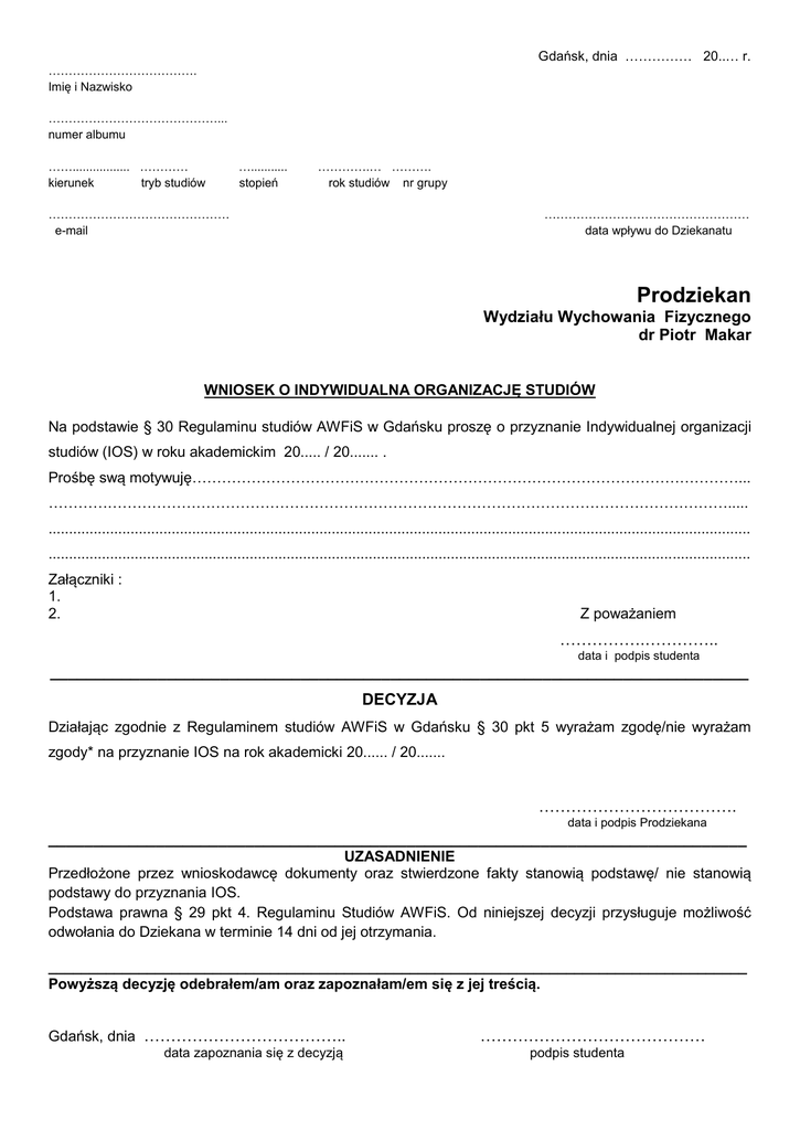 Gdańsk, dnia …………… 20..… r. ………………………………. Imię i Nazwisko ……………………………………... numer albumu ……................. ………… kierunek tryb studiów …........... stopień ………….… ………. rok studiów nr grupy ……………………………………… e-mail …………………………………………… data wpływu do Dziekanatu Prodziekan Wydziału Wychowania Fizycznego dr Piotr Makar WNIOSEK O INDYWIDUALNA ORGANIZACJĘ STUDIÓW Na podstawie § 30 Regulaminu studiów AWFiS w Gdańsku proszę o przyznanie Indywidualnej organizacji studiów (IOS) w roku akademickim 20..... / 20....... . Prośbę swą motywuję…………………………………………………………………………………………………... …………………………………………………………………………………………………………………………..... ........................................................................................................................................................................... ........................................................................................................................................................................... Załączniki : 1. 2. Z poważaniem …………….………….. data i podpis studenta ______________________________________________________________________________ DECYZJA Działając zgodnie z Regulaminem studiów AWFiS w Gdańsku § 30 pkt 5 wyrażam zgodę/nie wyrażam zgody* na przyznanie IOS na rok akademicki 20...... / 20....... ………………………………. data i podpis Prodziekana ______________________________________________________________________________ UZASADNIENIE Przedłożone przez wnioskodawcę dokumenty oraz stwierdzone fakty stanowią podstawę/ nie stanowią podstawy do przyznania IOS. Podstawa prawna § 29 pkt 4. Regulaminu Studiów AWFiS. Od niniejszej decyzji przysługuje możliwość odwołania do Dziekana w terminie 14 dni od jej otrzymania. _____________________________________________________________________________________ Powyższą decyzję odebrałem/am oraz zapoznałam/em się z jej treścią. Gdańsk, dnia ……………………………….. data zapoznania się z decyzją …………………………………… podpis studenta