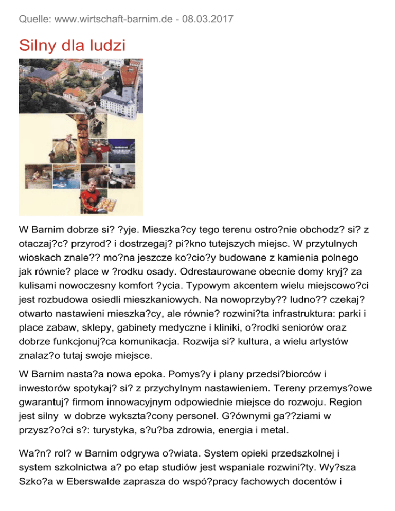 Quelle: www.wirtschaft-barnim.de - 08.03.2017 Silny dla ludzi W Barnim dobrze si? ?yje. Mieszka?cy tego terenu ostro?nie obchodz? si? z otaczaj?c? przyrod? i dostrzegaj? pi?kno tutejszych miejsc. W przytulnych wioskach znale?? mo?na jeszcze ko?cio?y budowane z kamienia polnego jak równie? place w ?rodku osady. Odrestaurowane obecnie domy kryj? za kulisami nowoczesny komfort ?ycia. Typowym akcentem wielu miejscowo?ci jest rozbudowa osiedli mieszkaniowych. Na nowoprzyby?? ludno?? czekaj? otwarto nastawieni mieszka?cy, ale równie? rozwini?ta infrastruktura: parki i place zabaw, sklepy, gabinety medyczne i kliniki, o?rodki seniorów oraz dobrze funkcjonuj?ca komunikacja. Rozwija si? kultura, a wielu artystów znalaz?o tutaj swoje miejsce. W Barnim nasta?a nowa epoka. Pomys?y i plany przedsi?biorców i inwestorów spotykaj? si? z przychylnym nastawieniem. Tereny przemys?owe gwarantuj? firmom innowacyjnym odpowiednie miejsce do rozwoju. Region jest silny w dobrze wykszta?cony personel. G?ównymi ga??ziami w przysz?o?ci s?: turystyka, s?u?ba zdrowia, energia i metal. Wa?n? rol? w Barnim odgrywa o?wiata. System opieki przedszkolnej i system szkolnictwa a? po etap studiów jest wspaniale rozwini?ty. Wy?sza Szko?a w Eberswalde zaprasza do wspó?pracy fachowych docentów i studentów z ca?ego ?wiata. M?odzi ludzie dobrze si? w Barnim czuj? i ch?tnie tutaj ?yj?.
