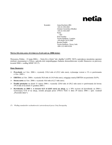 Kontakt: Anna Kuchnio (IR) +48-22-330-2061 Jolanta Ciesielska (Media) +48-22-330-2407 Netia - lub Erin Gordon Taylor Rafferty, Londyn +44-(0)20-7614-2900 Reema Parikh Taylor Rafferty, Nowy Jork +001-212-889-4350 NETIA SA OGŁASZA WYNIKI ZA I KWARTAŁ 2006 ROKU Warszawa, Polska – 15 maja 2006 r. – Netia SA („Netia” lub „Spółka”) (GPW: NET), największy niezależny operator telefonii stacjonarnej w Polsce, ogłosiła dziś niepodlegające badaniu skonsolidowane wyniki finansowe za pierwszy kwartał 2006 r. według MSSF UE (*). Dane finansowe Przychody za I kw. 2006 r. wyniosły 218,4 mln zł (55,5 mln euro), wykazując wzrost o 1% w porównaniu z I kw. 2005 r. EBITDA za I kw. 2006 r. wyniosła 58,8 mln zł (14,9 mln euro), osiągając marżę EBITDA na poziomie 26,9%. Strata netto za I kw. 2006 r. wyniosła 10,6 mln zł (2,7 mln euro). Środki pieniężne na dzień 31 marca 2006 r. wynosiły 229,0 mln zł (58,2 mln euro) w porównaniu do kwoty 197,4 mln zł na dzień 31 grudnia 2005 r. Dywidenda za 2005 r. w kwocie 0,13 zł (0,03 euro) na akcję, tj. o 30% wyższa od dywidendy za 2004 r. wynoszącej 0,10 zł na akcję, została przyjęta przez ZWZA Netii w dniu 29 marca 2006 r. (por. rozdział „Pozostałe dane”). (*) Według standardów rachunkowości zatwierdzonych przez Unię Europejską. -2Dane operacyjne Przychody ze sprzedaży produktów telekomunikacyjnych innych niż tradycyjne, bezpośrednie usługi głosowe (takich jak pośrednie usługi głosowe, transmisja danych, rozliczenia międzyoperatorskie, usługi hurtowe, usługi sieci inteligentnej i pozostałe usługi telekomunikacyjne) zwiększyły swój udział w przychodach z działalności telekomunikacyjnej w I kw. 2006 r. do 50%, osiągając wartość 107,0 mln zł (27,2 mln euro), z poziomu 40% w I kw. 2005 r. Przychody od klientów biznesowych stanowiły 74% przychodów z działalności telekomunikacyjnej w I kw. 2006 r. w porównaniu do udziału na poziomie 72% w I kw. 2005 r. Liczba linii dzwoniących (po uwzględnieniu rezygnacji i odłączeń abonentów) wyniosła 406.738 na dzień 31 marca 2006 r. w porównaniu do 424.585 linii dzwoniących na dzień 31 marca 2005 r. oraz 413.011 na dzień 31 grudnia 2005 r. Liczba linii biznesowych wyniosła 152.818, wykazując wzrost o 5% w porównaniu do I kw. 2005 r. Udział linii biznesowych w stosunku do wszystkich linii dzwoniących wyniósł 37,6%. Liczba aktywnych portów ADSL wzrosła do 43.040 na dzień 31 marca 2006 r. w porównaniu do 25.193 portów na dzień 31 marca 2005 r., osiągając 11% udział w liczbie linii dzwoniących ogółem. ARPU (średni miesięczny przychód na linię w odniesieniu wyłącznie do bezpośrednich usług głosowych) zmniejszył się o 12% do kwoty 89 zł (23 euro) w I kw. 2006 r. w porównaniu do 101 zł w I kw. 2005 r. oraz o 2% w porównaniu do 91 zł w IV kw. 2005 r., odzwierciedlając ogólny trend obniżki taryf w branży. Zatrudnienie w grupie Netia wyniosło 1.246 etatów na dzień 31 marca 2006 r. w porównaniu do 1.201 etatów na dzień 31 marca 2005 r. oraz do 1.221 etatów na dzień 31 grudnia 2005 r. Wzrost zatrudnienia jest związany z podjętymi inicjatywami strategicznymi tj. projektem WiMAX i programem utrzymania klientów (anti-churn). Umowa serwisowa na świadczenie usług utrzymania i zarządzania siecią telekomunikacyjną, obejmująca przeniesienie pracowników, została podpisana przez Netię i firmę Ericsson w dniu 28 kwietnia 2006 r. (por. rozdział „Pozostałe dane”). Wojciech Mądalski, prezes zarządu Netii, stwierdził: - Sprzedaż produktów innych niż tradycyjne bezpośrednie usługi głosowe wzrosła o 26% w porównaniu z I kw. 2005 r. Przychody z tego strategicznego segmentu naszej działalności stanowią obecnie 50% przychodów w porównaniu do ich udziału na poziomie 40% w roku ubiegłym. Wiodącymi produktami w tej grupie były usługi hurtowe i transmisja danych, w tym usługi ADSL i szerokopasmowego dostępu do Internetu. Oczekujemy, że poniesione w bieżącym roku nakłady na strategiczne projekty, tj. WiMAX i projekt telefonii komórkowej, przyczynią się do osiągnięcia przez Netię dwucyfrowego wzrostu przychodów w 2007 r. i 2008 r. W I kw. 2006 r. przeprowadziliśmy w Lublinie udane testy usług w technologii WiMAX z udziałem klientów, a obecnie przygotowujemy się do testów w Warszawie. Spodziewamy się, że budowa sieci dostępowej w technologii WiMAX przyniesie Netii w przyszłości znaczne oszczędności i stworzy nowe możliwości efektywnego poszerzenia bazy klientów w całym kraju. P4 – spółka z naszym udziałem – przygotowuje się do uruchomienia usług komórkowych w drugiej połowie br., co poszerzy naszą ofertę produktową i umożliwi zaoferowanie klientom Netii pełnego wachlarza usług telekomunikacyjnych. Z satysfakcją informujemy także o podpisaniu w kwietniu br. umowy serwisowej z firmą Ericsson, dzięki której Netia zwiększa możliwości ekspansji geograficznej przy jednoczesnym ograniczaniu kosztów zatrudnienia. Cieszy nas również otrzymana decyzja w sprawie umorzenia części zobowiązań koncesyjnych El-Netu, wynoszących 90,9 mln zł według wartości nominalnej, w zamian za inwestycje w infrastrukturę telekomunikacyjną. Decyzja ta stanowi kolejny krok w eliminowaniu poziomu niepewności dla akcjonariuszy, zwłaszcza że El-Net posiada promesy umorzenia całości zobowiązań z tytułu koncesji na świadczenie lokalnych usług telekomunikacyjnych. Jon Eastick, nowomianowany główny dyrektor finansowy Netii, powiedział: - Osiągnięty w I kw. 2006 r. wzrost przychodów i marża EBITDA są zgodne z naszymi założeniami na 2006 r. Przychody wzrosły o 1% pomimo spadku przychodów z bezpośrednich usług głosowych o 16% w porównaniu z I kw. 2005 r., związanego z obniżką taryf i mniejszą liczbą linii dzwoniących w segmencie klientów indywidualnych. Wynik EBITDA za kwartał odzwierciedla przesunięcie udziału osiąganych przych