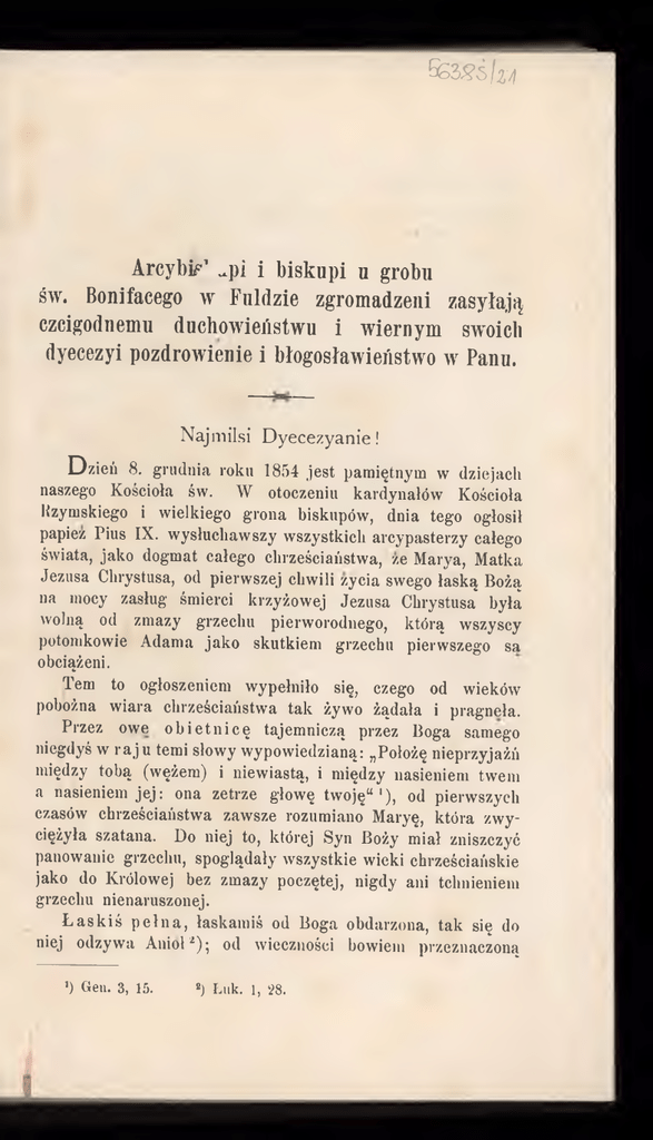 Arcybi^^pi i biskupi u grobu św. Bonifacego w Fuldzie zgromadzeni zasyłają czcigodnemu duchowieństwu i wiernym swoich dyecezyi pozdrowienie i błogosławieństwo w Panu. — — Najmilsi D yecezyan ie! D zień 8. grudnia roku 1854 jest pamiętnym w dziejach naszego Kościoła św. W otoczeniu kardynałów Kościoła Kzymskiego i wielkiego grona biskupów, dnia tego ogłosił papież Pius IX. wysłuchawszy wszystkich arcypasterzy całego świata, jako dogmat całego chrześciaństwa, ze Marya, Matka Jezusa Chrystusa, od pierwszej chwili życia swego łaską Bożą na mocy zasług śmierci krzyżowej Jezusa Chrystusa była wolną od zmazy grzechu pierworodnego, którą wszyscy potomkowie Adama jako skutkiem grzechu pierwszego sa obciążeni. Tem to ogłoszeniem wypełniło się, czego od wieków pobożna wiara chrześciaństwa tak żywo żądała i pragnęła. Przez owe o b ie tn ic ę tajemniczą przez Boga samego niegdyś w ra ju temi słowy wypowiedzianą: „Położę nieprzyjażń między tobą (wężem) i niewiastą, i między nasieniem twem a nasieniem jej: ona zetrze głowę twojęu '), od pierwszych czasów chrześciaństwa zawsze rozumiano Maryę, która zwyciężyła szatana. Do niej to, której Syn Boży miał zniszczyć panowanie grzechu, spoglądały wszystkie wieki chrześciańskie jako do Królowej bez zmazy poczętej, nigdy ani tchnieniem grzechu nienaruszonej. Ł a s k iś p e ł na , łaskamiś od Boga obdarzona, tak się do niej odzywa Aniołz); od wieczności bowiem przeznaczoną była, by światu darować źródło wszelkich łask; od wieczności sam Duch św. ją wybrał na oblubienicę Boga, na najświętsze tabernakulum Bóstwa; od wieczności całe jej istnienie po stawione było pod świętobliwość tego powołania, które jak ochronna tarcza one sarnę i całe jej życie zachowało przed trucizną grzechu. Kogoby więc mogło dziwić, iż święci Oj cowi e Kości oł a ws z ys t ki ch wi eków nie ustawali gorliwie Maryę wysławiać jako Pannę najczystszą, najświętszą i niepokalaną; chwalić ją słowy Pieśni nad pieśniami jako „lilię między cierniemu; wołać do niej słowy Pisma św.: „Wszystka jesteś piękna, przy jaciółko moja! a niemasz w tobie zmazy!** '). Słusznie Ojcowie w porównywaniu z pierwszą matką, z Ewą, jako źródłem naszego życia doczesno - przyrodzonego, Maryę jako matkę sprawcy życia nadprzyrodzonego, wywyższają nad Ewę, która to sama bez grzechu i w stanie łaski była wyszła z rąk Bożych, ponieważ Mary a daleko bliżej Boga stała od jakiegobądź innego stworzenia. Zaprawdę, najmilsi dyecezyanie, im k to bl i żej Boga stoi, tem wyżs za j e g o ś wi ęt obl i woś ć , tem cudownejszy potok łask ze serca Boga na niego spływający. W rzeczach łaski z Bogiem jaknajściślej być złączonym a jednakowoż grzechowi być podległym, toby były dwie rzeczy tak sobie przeciwne jak światłość i ciemność. Dla tego już w piśmie św. czytamy o prorokach odznaczonych, że Bóg ich poświęcił od żywota matki. Dla tego my chrześcianie wszyscy, skorośmy przyszli na ten świat, otrzymaliśmy łaskę poświęcająca w źródle chrztu św., ponieważ jest wolą Boga, żeby życie dzieci jego już od samego początku było poświęcone i od grzechu wolne. A jednakowoż jesteśmy i zostaniemy wszyscy tylko dziećmi adoptowanemi, tylko przyjęci za dzieci Boga. Ale Marya w calem sweni powołaniu i istnieniu jest nie tylko najdoskonalszem z wszystkich dzieci Ojca wiecznego, lecz prawdziwą i istotną matką Syna jego jednorodzonego, Boga-Człowieka. Tak więc logicznie z stanowiska jej wzniosłego i dostojności jej wynika owa wolność od grzechu i wielkość łaski, którą Arclianiół Gabriel z pokorą uwielbił. p Pieśń nad pieśniami 2, 2; 4, 7. Gdziekolwiek, najmilsi dyecezyanie, wierni i pobożni chrze ścianie głęboko się zastanawiali nad tajemnicą wcielenia Chrystusa Pana, nie mogli oka odwrócić od owej obfitości światła i czystości, przechodzącej i przelewającej się z nie skończenie czystego Boga-Syna na ową Wybraną, z której chciał przyjąć naturę ludzką. Jasno i przekonująco naj większy Ojciec Kościoła na zachodzie, św. August yn*) mówiąc o grzeszności całego świata powiada: „Wykluczę z tego najśw. Pannę Maryę; albowiem niechcę, zęby tam, gdzie się mówi o grzechach, dla niej miało być najmniejsze miejsce, a to z powodu c hwa ł y Bożej . “ O, co za głęboką i wzruszającą myśl zawierają te słowa! Nie dla jej cnót ludzkich i zasług w ł a s n y c h tak wywyż szamy Maryę; ani też nie ośmielamy się, stawiać ją w jakibądź sposób obok Boga; nie, wszystko, co się na cześć Maryi mówi i czyni, dzieje się według pamiętnego świadectwa św. Augustyna „Bogu na chwałę**. Chwaląc promień słońca, dający nam ciepłość i życie, chwalimy tem samem słońce, zsyłające nam ów promień. Ale od Ciebie, Słońce sprawiedliwości i świątobliwości, Jezu Chryste, jeszcze nigdy czyściejscy i jaśniejszy promień nie wyszedł od cudnej świętości własnej Twej błogosławionej Matki. Wysławiając Maryę jako j u t r z e n k ę nakazującą nam zbliżający się dzień łaski, wysławiamy istotnie tylko Ciebie jako to wspaniałe słońce, które poprzedziła Marya przez Ciebie tajemniczo na świat zesłana. Aby Boga czcić, chwalił św. Augustyn Maryę jako nie pokalaną. Aby Boga czcić, wołał ów wielki Syryjski Ojciec Kościoła Ephrem*2) do Chrystusa Pana: „Ty i Ma t ka Twoj a, wy jedyni jesteście całkiem czyści i pod każdym względem czyści. W Tobie, o Panie, niema plamy, w Matce Twej ni e ma z ma z y “. — Aby Boga czcić, Ojcowie św. nazywają Maryę „świątynią bezgrzeszności**, „ogrodem rajskim nigdy grzechem nie oplamionym**; arką przymierza obejmującą prawdziwe Przenajświętsze. Tylko aby Chrystusa Pana, Syna w Matce wielbić, woła św. Sofroniusz3) do Maryi: „Tyś prze*) Aug. de natur