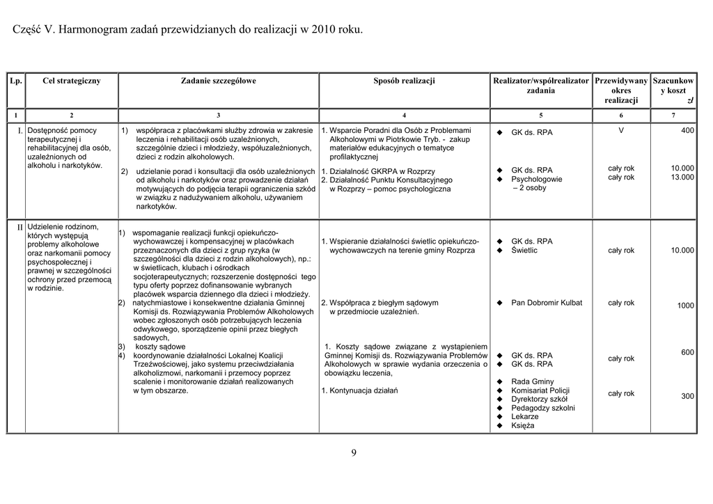 Część V. Harmonogram zadań przewidzianych do realizacji w 2010 roku. Lp. Cel strategiczny Zadanie szczegółowe Sposób realizacji 1 2 3 4 I. Dostępność pomocy terapeutycznej i rehabilitacyjnej dla osób, uzaleŜnionych od alkoholu i narkotyków. 1) współpraca z placówkami słuŜby zdrowia w zakresie leczenia i rehabilitacji osób uzaleŜnionych, szczególnie dzieci i młodzieŜy, współuzaleŜnionych, dzieci z rodzin alkoholowych. 1. Wsparcie Poradni dla Osób z Problemami Alkoholowymi w Piotrkowie Tryb. - zakup materiałów edukacyjnych o tematyce profilaktycznej 2) udzielanie porad i konsultacji dla osób uzaleŜnionych 1. Działalność GKRPA w Rozprzy od alkoholu i narkotyków oraz prowadzenie działań 2. Działalność Punktu Konsultacyjnego motywujących do podjęcia terapii ograniczenia szkód w Rozprzy – pomoc psychologiczna w związku z naduŜywaniem alkoholu, uŜywaniem narkotyków. Realizator/współrealizator Przewidywany Szacunkow zadania okres y koszt realizacji zł 5 GK ds. RPA GK ds. RPA Psychologowie – 2 osoby 6 V 7 400 cały rok cały rok 10.000 13.000 GK ds. RPA Świetlic cały rok 10.000 Pan Dobromir Kulbat cały rok 1000 GK ds. RPA GK ds. RPA cały rok Rada Gminy Komisariat Policji Dyrektorzy szkół Pedagodzy szkolni Lekarze KsięŜa II Udzielenie rodzinom, 1) wspomaganie realizacji funkcji opiekuńczoktórych występują 1. Wspieranie działalności świetlic opiekuńczowychowawczej i kompensacyjnej w placówkach problemy alkoholowe wychowawczych na terenie gminy Rozprza przeznaczonych dla dzieci z grup ryzyka (w oraz narkomanii pomocy szczególności dla dzieci z rodzin alkoholowych), np.: psychospołecznej i w świetlicach, klubach i ośrodkach prawnej w szczególności socjoterapeutycznych; rozszerzenie dostępności tego ochrony przed przemocą typu oferty poprzez dofinansowanie wybranych w rodzinie. placówek wsparcia dziennego dla dzieci i młodzieŜy. 2. Współpraca z biegłym sądowym 2) natychmiastowe i konsekwentne działania Gminnej w przedmiocie uzaleŜnień. Komisji ds. Rozwiązywania Problemów Alkoholowych wobec zgłoszonych osób potrzebujących leczenia odwykowego, sporządzenie opinii przez biegłych sadowych, 1. Koszty sądowe związane z wystąpieniem 3) koszty sądowe Gminnej Komisji ds. Rozwiązywania Problemów 4) koordynowanie działalności Lokalnej Koalicji Alkoholowych w sprawie wydania orzeczenia o Trzeźwościowej, jako systemu przeciwdziałania obowiązku leczenia, alkoholizmowi, narkomanii i przemocy poprzez scalenie i monitorowanie działań realizowanych 1. Kontynuacja działań w tym obszarze. 9 cały rok 600 300 III Prowadzenie profilaktycznej działalności informacyjnej i edukacyjnej w zakresie rozwiązywania problemów alkoholowych i przeciwdziałania narkomanii, w szczególności dla dzieci i młodzieŜy. 1) realizacja programów profilaktycznych na terenie szkół przeznaczonych dla uczniów, rodziców i nauczycieli, realizowanych w ramach szkolnych programów profilaktyki; uczenie umiejętności słuŜących zdrowemu i trzeźwemu Ŝyciu( oraz inne zadanie). 1. Gimnazjum a Rozprzy: a/ Konkurs plastyczny na hasło profilaktyczne – dla wszystkich uczniów szkoły b/zakup materiałów edukacyjnych związanych z profilaktyką(ksiąŜki ,plakaty, i ulotki przybory piśmienne) Mariola Smerczek, Agnieszka Staniaszek Mariola Smerczek XI-XII 700 III 250 V 500 XI 500 IX 700 IV 390 XI 500 ZSG –Niechcice nauczyciele V 800 2. Szkoła Podstawowa w Rozprzy: a/ Spartakiada 6-latków b/ Trening zastępowania agresji c/”Debata” Nauczyciele SP w Rozprzy Stowarzyszenie „Arka Noego” NCPP Profis a/ „Dobry kolega ,fajna koleŜanka” Progres b/ „Stanowcze NIE dla nałogów” konkurs plastyczny Zespół SzkolnoGimnazjalny w Niechcicach nauczyciele plastyki i pedagog szkolny c/ „Trzymaj formę” – impreza sportowo-rekreacyjna kl.-I-VI SP i Gimnazjum I-III uczniowie i rodzice d/ „ Tak czy nie” program profilaktyczny kształtujący umiejętność asertywnego zachowania. Progres V 560 Barbara Klaka III 2000 5. Szkoła Podstawowa w Milejowie: a/ „Domowi detektywi” b/ „Dom bez przemocy” wychowawcy klas wychowawcy klas IV-V III 500 500 6. Szkoła Podstawowa w Nowej Wsi: a/ „Domowi detektywi” c/ „Dom bez przemocy” d/ zakup materiałów edukacyjnych B. Mazerant L. Jureńczyk wszyscy nauczyciele IV X cały rok 500 500 400 D.Jakubek VI 700 G. Lewińska M. Owczarek V III 480 350 3. Zespół Szkolno-Gimnazjalny w Niechcicach: 4. Szkoła Podstawowa w Mierzynie: a/ Trzeźwość w rodzinie – sprawne i zdrowe dzieci – VIII Gminna Olimpiada Sportowa – kl. I-IV e/ Ku trzeźwości – biegi przełajowe 7. Szkoła Podstawowa w Straszowie: a/ „Domowi Detektywi” - kl. IV b/ „Dom bez przemocy” 10 c/ Program zajęć profilaktyczno- sportowych na jeden tydzień wakacji d/ „ śyj zdrowo”- turniej sportowy Nauczyciele szkoły VI 1400 M.Pokora VI 350 GK ds. RPA LUMKS „Kasztelan” w Rozprzy IV II 2500 3500 LZS w Rozprzy X 3000 LZS w Rozprzy XII 2000 nauczyciele wych. fizycz. cały rok 4800 6. Konkurs literacki 7. Konkurs plastyczny GK ds. RPA GK ds. RPA XI XI 900 900 1.Udział w Ogólnopolskiej Kampanii „Zachowaj Trzeźwy Umysł” GK ds. RPA V 1830 1. Prenumerata na 2009 rok - „Niebieska Linia” 2. Prenumerata na 2009 rok - „wspólne tematy” 3. Prenumerata na 2009 rok - „Świat problemów” 4.Zakup ksiąŜek dla bibliotek z terenu gminy w Rozprzy dotyczących problematyki alkoholowej, narkomanii i przemocy w rodzinie GK ds. RPA GK ds. RPA GK ds. RPA III III III 90 250 240 GK ds. RPA cały rok 1000 2) wspieranie i współuczestniczenie w organizowaniu 1. VII Dni Rozprzy (koncert profilaktyczny) imprez rozrywkowych, sportowych, pozalekcyjnych zajęć 2. Turniej Siatkarski pod hasłem: „ Trzeźwe ciało – trzeźwy umysł” sportowych, konkursów plastycznych literackich 3. Bieg Kasztelański pod hasłem: propagujących zdrowy styl Ŝycia(oraz inne zadania) „Ku Trzeźwości” 4. Tur