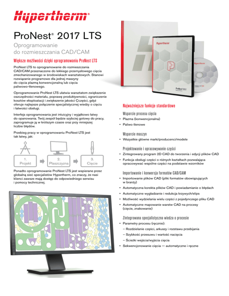 ProNest 2017 LTS ® Oprogramowanie do rozmieszczania CAD/CAM Większe możliwości dzięki oprogramowaniu ProNest LTS ProNest LTS to oprogramowanie do rozmieszczania CAD/CAM przeznaczone do lekkiego przemysłowego cięcia zmechanizowanego w środowiskach warsztatowych. Stanowi rozwiązanie programowe dla jednej maszyny do cięcia plazmą konwencjonalną lub cięcia paliwowo-tlenowego. Oprogramowanie ProNest LTS ułatwia warsztatom zwiększenie oszczędności materiału, poprawę produktywności, ograniczenie kosztów eksploatacji i zwiększenie jakości Çczęści, gdyż oferuje najlepsze połączenie specjalistycznej wiedzy o cięciu i łatwości obsługi. Interfejs oprogramowania jest intuicyjny i wyjątkowo łatwy do opanowania. Twój zespół będzie szybciej gotowy do pracy, zaprogramuje ją w krótszym czasie oraz przy mniejszej liczbie błędów. Przebieg pracy w oprogramowaniu ProNest LTS jest tak łatwy, jak: Najważniejsze funkcje standardowe Wsparcie procesu cięcia • Plazma (konwencjonalna) • Paliwo tlenowe Wsparcie maszyn • Wszystkie główne marki/producenci/modele Projektowanie i opracowywanie części • Zintegrowany program 2D CAD do tworzenia i edycji plików CAD 1. Projekt 2. Płaszczyzna 3. Cięcie Ponadto oprogramowanie ProNest LTS jest wspierane przez globalną sieć specjalistów Hypertherm, co znaczy, że nasi klienci zawsze mają dostęp do odpowiedniego serwisu i pomocy technicznej. • Funkcja obsługi części o różnych kształtach pozwalająca opracowywać wspólne części na podstawie wzorników Importowanie i konwersja formatów CAD/CAM • Importowanie plików CAD (pliki formatów obowiązujących w branży) • Automatyczna korekta plików CAD i powiadamianie o błędach • Automatyczne wygładzanie i redukcja krzywych/elips • Możliwość wydzielania wielu części z pojedynczego pliku CAD • Automatyczne mapowanie warstw CAD na procesy (cięcie, znakowanie) Zintegrowana specjalistyczna wiedza o procesie • Parametry procesu (ręcznie): – Rozdzielanie części, arkuszy i rozstawu przebijania – Szybkość przesuwu i wartość nacięcia – Ścieżki wejścia/wyjścia cięcia • Sekwencjonowanie cięcia — automatyczne i ręczne Najważniejsze funkcje standardowe, kontynuacja Rozmieszczanie automatyczne • Funkcja rozmieszczania automatycznego jest dostępna standardowo Interaktywne rozmieszczanie ręczne • Przeciąganie, upuszczanie i dystansowanie części na płaszczyźnie • Przesuwanie, odbijanie lustrzane, obracanie i układanie części • Wykrywanie nakładania się części Raportowanie • Raporty dla kierownictwa i warsztatowe • Bezpośredni eksport raportów do plików formatu PDF, arkuszy kalkulacyjnych programu Excel, plików CSV i stron internetowych Wynik prac • Postprocesor generujący dane wyjściowe NC • Automatyczna kompensacja nacięć / nacięć wstępnych • Wynik prac w formacie DXF • Edycja położenia ścieżki wejścia/wyjścia na płaszczyźnie • Animowane symulacje sekwencji cięcia Zamów bezpłatną wersję próbną: www.hypertherm.com/CAM Hypertherm i ProNest to znaki handlowe firmy Hypertherm Inc. i mogą być zastrzeżone w Stanach Zjednoczonych i/lub innych krajach. Wszystkie pozostałe znaki towarowe należą do ich właścicieli. Jedną z najbardziej trwałych wartości Hypertherm jest minimalizacja szkodliwego wpływu na środowisko naturalne. Dążenie do realizacji tego celu jest niezwykle ważne w kontekście sukcesu naszego i naszych klientów. Stale staramy się poprawiać nasze zaangażowanie w ochronę środowiska. Jest to proces, na którym bardzo nam zależy. © 8/2016 Hypertherm Inc. Wersja 5 89517H Polski / Polish ™
