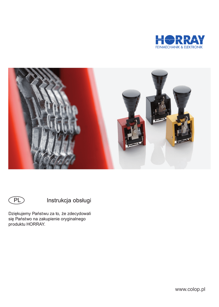 Dziękujemy Państwu za to, że zdecydowali się Państwo na zakupienie oryginalnego produktu HORRAY. www.colop.pl H56, H57 1 4 2 5 3 www.colop.pl H56, H57 PL PL Ustawienie pierścieni stemplujących B Rys. 1 + 2 X Naciśnij uchwyt numeratora i przytrzymaj w pozycji dolnej, która umożliwia wciśnięcie blokady . (Uchwyt naciśnij maksymalnie w dół, a następnie lekko cofnij w górę.) X Wciśnij blokadę . X Pierścienie stemplujące ustaw przy pomocy patyczka regulacyjnego . X W celu powrotu do pozycji wyjściowej naciśnij uchwyt . Ustawienie powtórzeń B Rys. 4 X Naciśnij uchwyt suwaka delikatnie w dół i przytrzymując naciśnięty przesuń wzdłuż “okienka” na właściwy numer określający ilość powtórzeń numeratora. Powtórzenia Zera poprzedzające numer można zamaskować! Przykład: X X 49 zamiast 000049 Pierścienie stemplujące ustaw przy pomocy patyczka regulacyjnego na wolne pozycje między “0” a “1”. W celu powrotu do pozycji wyjściowej naciśnij uchwyt . Wkładka tuszująca BRys. 1 + 3 Postępuj ostrożnie, aby zapobiec zabrudzeniu tuszem! X Naciśnij uchwyt numeratora i przytrzymaj w dolnej pozycji, która umożliwia wciśnięcie blokady . (Uchwyt naciśnij maksymalnie w dół, a następnie lekko cofnij w górę.) X Naciśnij blokadę . X Ostrożnie rozpakuj wkładkę tuszującą. X Przytrzymując wkładkę za uchwyty, wsuń ją ruchem pionowym w górę - w kieszonkę. (Wkładkę można wsunąć w kieszonkę tylko, gdy uchwyty wystarczająco odstają od obudowy wkładki. Podczas wsuwania naciśnij je i utrzymując nacisk wsuń ruchem pionowym w górę.) 0 Stemplowany jest zawsze ten sam numer. 1 Numer narasta po każdym stemplowaniu. 2 Numer narasta po co drugim stemplowaniu. itd. X Po ustawieniu na właściwej pozycji puść uchwyt suwaka. Parkowanie stempla B Rys. 5 Aby zapobiec zabrudzeniom, stempel należy “zaparkować”. X Naciśnij uchwyt numeratora i przytrzymaj w pozycji dolnej, która umożliwia wciśnięcie blokady . (Uchwyt naciśnij maksymalnie w dół, a następnie lekko cofnij w gór ę.) X Wciśnij blokadę . X W celu powrotu do pozycji wyjściowej naciśnij uchwyt . www.colop.pl