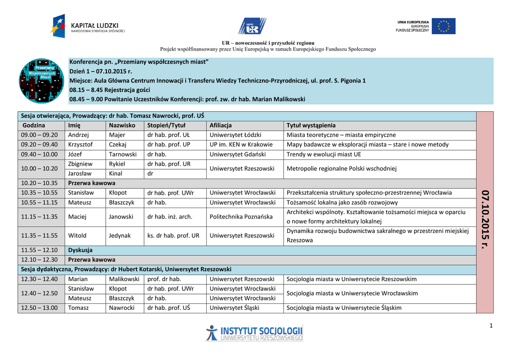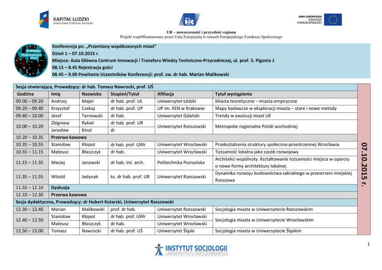 UR – nowoczesność i przyszłość regionu Projekt współfinansowany przez Unię Europejską w ramach Europejskiego Funduszu Społecznego Konferencja pn. „Przemiany współczesnych miast” Dzień 1 – 07.10.2015 r. Miejsce: Aula Główna Centrum Innowacji i Transferu Wiedzy Techniczno-Przyrodniczej, ul. prof. S. Pigonia 1 08.15 – 8.45 Rejestracja gości 08.45 – 9.00 Powitanie Uczestników Konferencji: prof. zw. dr hab. Marian Malikowski Afiliacja Uniwersytet Łódzki UP im. KEN w Krakowie Uniwersytet Gdański Tytuł wystąpienia Miasta teoretyczne – miasta empiryczne Mapy badawcze w eksploracji miasta – stare i nowe metody Trendy w ewolucji miast UE Uniwersytet Rzeszowski Metropolie regionalne Polski wschodniej Uniwersytet Wrocławski Uniwersytet Wrocławski Przekształcenia struktury społeczno-przestrzennej Wrocławia Tożsamość lokalna jako zasób rozwojowy Architekci wspólnoty. Kształtowanie tożsamości miejsca w oparciu o nowe formy architektury lokalnej Dynamika rozwoju budownictwa sakralnego w przestrzeni miejskiej Rzeszowa 11.15 – 11.35 Maciej Janowski dr hab. inż. arch. Politechnika Poznańska 11.35 – 11.55 Witold Jedynak ks. dr hab. prof. UR Uniwersytet Rzeszowski Dyskusja 11.55 – 12.10 12.10 – 12.30 Przerwa kawowa Sesja dydaktyczna, Prowadzący: dr Hubert Kotarski, Uniwersytet Rzeszowski 12.30 – 12.40 Marian Malikowski prof. dr hab. Uniwersytet Rzeszowski Stanisław Kłopot Uniwersytet Wrocławski dr hab. prof. UWr 12.40 – 12.50 Mateusz Błaszczyk dr hab. Uniwersytet Wrocławski 12.50 – 13.00 Tomasz Nawrocki dr hab. prof. UŚ Uniwersytet Śląski 07.10.2015 r. Sesja otwierająca, Prowadzący: dr hab. Tomasz Nawrocki, prof. UŚ Godzina Imię Nazwisko Stopień/Tytuł 09.00 – 09.20 Andrzej Majer dr hab. prof. UŁ 09.20 – 09.40 Krzysztof Czekaj dr hab. prof. UP 09.40 – 10.00 Józef Tarnowski dr hab. Zbigniew Rykiel dr hab. prof. UR 10.00 – 10.20 Jarosław Kinal dr 10.20 – 10.35 Przerwa kawowa 10.35 – 10.55 Stanisław Kłopot dr hab. prof. UWr 10.55 – 11.15 Mateusz Błaszczyk dr hab. Socjologia miasta w Uniwersytecie Rzeszowskim Socjologia miasta w Uniwersytecie Wrocławskim Socjologia miasta w Uniwersytecie Śląskim 1 UR – nowoczesność i przyszłość regionu Projekt współfinansowany przez Unię Europejską w ramach Europejskiego Funduszu Społecznego 13.00 – 13.10 Andrzej Krzysztof Anna Majer Czekaj Fiń dr hab. prof. UŁ dr hab. prof. UP dr 13.20 – 13.30 Anna Karwińska prof. dr hab. 13.30 – 13.40 Sławomir Solecki dr Socjologia miasta w PWSW w Przemyślu Panel dyskusyjny – Jak nauczać o mieście? Tematy przewodnie: Podsumowanie prezentacji dot. dydaktyki, nowe obszary eksploracji miasta a dydaktyka (nowe specjalności w socjologii miasta), interdyscyplinarność socjologii miasta a dydaktyka, badania przestrzeni miejskiej a dydaktyka Przerwa obiadowa 13.10 – 13.20 13.40 – 15.00 15.00 – 16.00 Uniwersytet Łódzki Uniwersytet Pedagogiczny im. KEN w Krakowie Uniwersytet Ekonomiczny w Krakowie PWSW w Przemyślu Socjologia miasta w Uniwersytecie Łódzkim Socjologia Miasta w Uniwersytecie Pedagogicznym im. KEN w Krakowie Socjologia miasta w Uniwersytecie Ekonomicznym w Krakowie 07.10.2015 r. PANELE TEMATYCZNE 07.10.2015 r. Panel I „Metropolie i procesy metropolizacji”, Prowadzący: dr hab. Zbigniew Rykiel, prof. UR Miejsce: Aula Główna Centrum Innowacji i Transferu Wiedzy Techniczno-Przyrodniczej, ul. prof. S. Pigonia 1 Godzina Imię Nazwisko Stopień/Tytuł Afiliacja Tytuł wystąpienia 16.00 – 16.15 Małgorzata Solska dr inż. arch. Politechnika Krakowska Metropolizacja miast – reżim wolności a wartości BorucińskaMetropolizacja jako proces urbanizacji Poznańskiego Obszaru 16.15. – 16.30 Hanna dr inż. arch. Uniwersytet Zielonogórski Bieńkowska Metropolitalnego Makowska16.30 – 16.45 Marzena dr Uniwersytet Łódzki Obszar metropolitalny jako region turystyczny Iskierka GodlewskaUniwersytet Ekonomiczny Szanse i zagrożenia dla aglomeracji miejskich w realizacji Strategii 16.45 – 17.00 Bianka mgr Dzioboń w Krakowie Europa 2020 Uniwersytet Ekonomiczny Drugie domy: skala zjawiska, czynniki lokalizacji, wpływ na rozwój 17.00 – 17.15 Jerzy Ładysz dr inż. we Wrocławiu lokalny 17.15 – 17.30 Dyskusja 2 UR – nowoczesność i przyszłość regionu Projekt współfinansowany przez Unię Europejską w ramach Europejskiego Funduszu Społecznego 07.10.2015 r. Panel II „Społeczno-ekonomiczne problemy w polskich miastach”, Prowadząca: prof. dr hab. Anna Karwińska Miejsce: Sala Senatu Uniwersytetu Rzeszowskiego, al. Rejtana 16 C Godzina Imię Nazwisko Stopień/Tytuł Afiliacja Tytuł wystąpienia dr hab. nauk Uniwersytet Ekonomiczny 16.00 – 16.15 Robert Włodarczyk Przemiany zjawiska bezrobocia w największych polskich miastach ekon. w Krakowie Uniwersytet Ekonomiczny 16.15. – 16.30 Agnieszka Witoń mgr Poziom życia w polskich miastach – dynamiczna analiza taksonomiczna w Krakowie 16.30 – 16.45 Szanse rozwojowe ośrodków małych i średnich w świetle Dawid Krysiński dr Uniwersytet Wrocławski współczesnych paradygmatów rozwoju miast. Przypadek Polski Uniwersytet Ekonomiczny Wpływ potencjału innowacyjnego na równoważenie rozwoju 16.45 – 17.00 Janusz Rosiek dr w Krakowie ekonomicznego polskich miast. Podejście DEA Uniwersytet im. Adama Reforma regionalizacyjna a sytuacja społeczno-gospodarcza wybranych 17.00 – 17.15 Paweł Śliwa dr Mickiewicza w Poznaniu miast województwa wielkopolskiego 17.15 – 17.30 Dyskusja 3 UR – nowoczesność i przyszłość regionu Projekt współfinansowany przez Unię Europejską w ramach Europejskiego Funduszu Społecznego Konferencja pn. „Przemiany współczesnych miast” Dzień 2 – 08.10.2015 r. 08.15 – 9.00 Rejestracja gości 08.10.2015 r. PANELE TEMATYCZNE 08.10.2015 r. Panel I „Przestrzeń publiczna/społeczna”, Prowadzący: dr hab. Mateusz Błaszczyk Miejsce: Aula Główna Centrum Innowacji i Transferu Wiedzy Technic