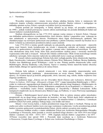 Społeczeństwo parafii Żołynia w czasie zaborów. cz. 1 Narodziny Wszystkie miejscowości i miasta tworzą własną odrębną historię, która w mniejszym lub większym stopniu wzbudza zainteresowanie przyszłych pokoleń. Bardzo ciekawe i zasługujące na dokładne opisanie są losy Żołyni, a przede wszystkim życie jej mieszkańców. Żołynia posiada już monografię, w której opisane są jej dzieje, od początku osadnictwa, do 1998 r., jednak rozdział poświęcony czasom zaboru austriackiego nie posiada dokładnych badań nad stanem ludności rzymskokatolickiej. Studium demograficzne na lata 1772-1914 zajmuje ważne miejsce w historii Żołyni. Ukazuje ono dokładnie społeczeństwo rzymskokatolickie, ilość chrztów, ślubów i pogrzebów oraz wskazuje na stan zaludnienia w opisywanym okresie. Przedstawia okres klęsk elementarnych, epidemii, lata charakteryzujące się rozwojem społecznym oraz problemy z jakimi Żołyniacy musieli się borykać na co dzień. I właśnie tą codzienność przedstawia dalsza części artykułu Lata 1772-1914 w istotny sposób wpłynęły na całą parafię, gminę oraz społeczność – stanowiły sporą część historii, kiedy kształtowanie się wioski i miasteczka zależało od władzy austriackiej. Pomimo to społeczeństwo żołyńskie żyło zgodnie z porami roku i kalendarzem kościelnym. W ciągu roku obchodzono dużą ilość świąt, które były przerywnikiem ciężkiej pracy i stwarzały możliwość wypraszania sobie łask u świętych – których dni właśnie celebrowano. Obok świata kościelnego istniały zabobony i przesądy, które znacznie wpływały na całokształt życia i często go utrudniały . W czasach zaboru austriackiego Żołynia była dość rozległą parafią, która obejmowała Jagielnię, Budy Zmysłowskie, Lubomierz (Żołynia miasto), Żołynia Wieś, Rakszawę, Podlesie, Brzózę Stadnicką, Wydrze oraz Białobrzegi przed Wisłokiem i cześć za nim. Później parafia obejmowała tylko część Białobrzegów, Brzózę Stadnicką i całą Żołynię. Nawet w ostatniej formie stanowiła bardzo obszerny zakres badań, dlatego też ograniczyłam je do samej Żołyni. Żołynia była jednym z małych miasteczek i wsi, które posiadały niepowtarzalny urok. Społeczność pozostawała zamknięta – skoncentrowana na swoje własne, lokalne – najważniejsze sprawy. Ze światem łączył ją kościół, pielgrzymki, dwór, karczma, targ, szkoła, służba wojskowa oraz migracja zarobkowa. Na podstawie mapy „Żołynia mit der Ortschffen Markt Żołynia oder Lubomierz, Bykówka und Polesie in Galizen. 1849 Litogr. Alborgnetti u Krippe 1855” i mapy katastralnej Białobrzegów z 1868 r. widać że większość zagospodarowań skupiona była wzdłuż głównej drogi biegnącej z Białobrzegów do Biegaczowa oraz przy Żołyńskim Potoku. Kilkanaście znajdowało się na Kopaniach i w Adamówce – w północno – wschodniej części Żołyni, sąsiadującej ze Zmysłówką i Budami Łańcuckimi. Kilka następnych znajdowało się na obszarze przy Białym Ługu, na Podlesiu, w Lasce Pierwszej (sąsiadującej z Gwizdowem). Żołynię z Białobrzegami łączył prom na Wisłoku. Było to jedyne miejsce gdzie mieszkańcy przeprawiali się na drugi brzeg, przeważnie do kościoła i na targ. Wśród dużej ilości zabudowań na drodze biegnącej do Przeworska znajdowała się bożnica. Za miastem kirkut i 2 zabudowy. Centralnym punktem Żołyni był rynek, pełniący funkcję targu, a na środku stał ratusz. Miasto i wieś tworzą ludzie, a ludzie przedstawieni mogą być także w liczbach. Patrząc na nie ciężko jest sobie wyobrazić ludzkie życie oraz jego ważniejsze wydarzenia. Liczby przedstawiają jednak bardzo wyraźnie społeczność rzymskokatolicką Żołyni, chwile radości szczęścia oraz smutku. Głównym źródłem wiedzy o stanie zaludnienia Żołyni jest Archiwum Metropolitalne Obrządku Łacińskiego w Przemyślu, które posiada w swoich zasobach księgi chrztów z lat 1826-1914 oraz księgi ślubów i urodzeń z lat 1826 – 1874 i 1877 – 1898. Zaginęły metryki ślubów i pogrzebów z lat 1875 – 1876oraz wszystkie inne sprzed 1826 r. Pozostałe dane uzyskane są z Archiwum Państwowe w Rzeszowie, Urzędu Stanu Cywilnego w Żołyni oraz Archiwum Parafialnego w Żołyni. Księgi metrykalne, które funkcjonowały od wieków nie zawsze prowadzone były rzetelne. Dopiero nowy system ewidencji w kościołach wprowadzony władze austriackie znacznie polepszył stan zapisów parafialnych. Dodatkowo miał on służyć celom podatkowym i mobilizacyjnym. Częste wizytacje dekanalne i podsumowania dla urzędu cyrkularnego sprawiły, że proboszczowie prowadzili księgi bardzo dokładnie i skrupulatnie. Za niedokładności i pomyłki wymierzano surowe kary. Metrykom nadawano rangę aktów stanu cywilnego, a proboszczom urzędników państwowych. W 1784 r. wprowadzono jednolity format wszystkich ksiąg, podnosząc jakość rejestracji, co miało również miejsce w Żołyni. Źródła kościelne stanowią dokładną ewidencję osób i cechują się wiarygodnością. Prawie wszystkie księgi żołyńskie zachowały się w dobrym stanie i nie sprawiały trudności z odczytywaniem danych. Księgi chrztów zawierają numer, datę urodzenia oraz datę chrztu, numer domu, imię dziecka, religię rodziców, płeć, informację o tym, czy dziecko jest ślubne, imię i nazwisko ojca i matki ( wpisywano również jej nazwisko rodowe) oraz dane rodziców chrzestnych i ich zawody. W księdze znajdują się również dane akuszerki przyjmującej poród i księdza udzielającego chrztu. Takie arkusze austriackie stosowane były w kościołach jeszcze po II wojnie światowej. Liber Naturom (Księga Urodzonych)Przykładowe zdjęcie księgi metrykalnej chrztów. Społeczeństwo rzymskokatolickie Żołyni było jednolite. W księgach chrztów nie odnotowano chrztu dziecka rodziców „innej wiary” lub przejśc