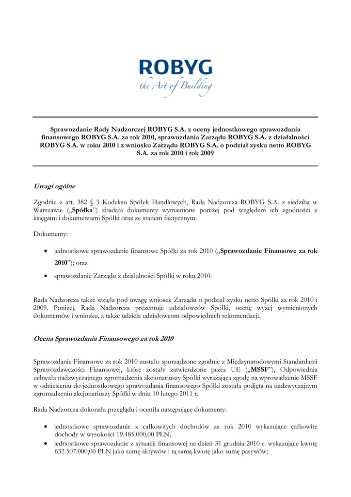 Sprawozdanie Rady Nadzorczej ROBYG S.A. z oceny jednostkowego sprawozdania finansowego ROBYG S.A. za rok 2010, sprawozdania Zarządu ROBYG S.A. z działalności ROBYG S.A. w roku 2010 i z wniosku Zarządu ROBYG S.A. o podział zysku netto ROBYG S.A. za rok 2010 i rok 2009 Uwagi ogólne Zgodnie z art. 382 § 3 Kodeksu Spółek Handlowych, Rada Nadzorcza ROBYG S.A. z siedzibą w Warszawie („Spółka”) zbadała dokumenty wymienione poniżej pod względem ich zgodności z księgami i dokumentami Spółki oraz ze stanem faktycznym. Dokumenty: • jednostkowe sprawozdanie finansowe Spółki za rok 2010 („Sprawozdanie Finansowe za rok 2010”); oraz • sprawozdanie Zarządu z działalności Spółki w roku 2010. Rada Nadzorcza także wzięła pod uwagę wniosek Zarządu o podział zysku netto Spółki za rok 2010 i 2009. Poniżej, Rada Nadzorcza prezentuje udziałowców Spółki, ocenę wyżej wymienionych dokumentów i wniosku, a także udziela udziałowcom odpowiednich rekomendacji. Ocena Sprawozdania Finansowego za rok 2010 Sprawozdanie Finansowe za rok 2010 zostało sporządzone zgodnie z Międzynarodowymi Standardami Sprawozdawczości Finansowej, które zostały zatwierdzone przez UE („MSSF”), Odpowiednia uchwała nadzwyczajnego zgromadzenia akcjonariuszy Spółki wyrażająca zgodę na wprowadzenie MSSF w odniesieniu do jednostkowego sprawozdania finansowego Spółki została podjęta na nadzwyczajnym zgromadzeniu akcjonariuszy Spółki w dniu 10 lutego 2011 r. Rada Nadzorcza dokonała przeglądu i oceniła następujące dokumenty: • jednostkowe sprawozdanie z całkowitych dochodów za rok 2010 wykazujące całkowite dochody w wysokości 19.485.000,00 PLN; • jednostkowe sprawozdanie z sytuacji finansowej na dzień 31 grudnia 2010 r. wykazujące kwotę 632.507.000,00 PLN jako sumę aktywów i tą samą kwotę jako sumę pasywów; • jednostkowe sprawozdanie z przepływów pieniężnych za rok 2010 wskazujące wzrost netto środków pieniężnych i ich ekwiwalentów o 111.241.000 PLN; • jednostkowe sprawozdanie ze zmian w kapitale własnym za rok 2010 wskazujące na zwiększenie kapitału ogółem o 137.470.000,00 PLN; i • Polityka rachunkowości i noty do Sprawozdania Finansowego za rok 2010. Rada Nadzorcza wyraża opinię, że Sprawozdanie Finansowe za rok 2010 zostało sporządzone w okresie przewidzianym przepisami prawa i zgodnie z MSSF. Ernst & Young Audit Sp. z o.o., z siedzibą w Warszawie (00-124 Warszawa, Rondo ONZ 1) zbadało Sprawozdanie Finansowe za rok 2010 i wydało opinię bez zastrzeżeń z badania Sprawozdania Finansowego za rok 2010. Według opinii Ernst & Young Audit Sp. z o.o., Sprawozdanie Finansowe za rok 2010: • uczciwie prezentuje prawidłowe i wiarygodne informacje, które są istotne dla oceny wyników finansowych Spółki oraz jej sytuacji majątkowej i finansowej; • zostało sporządzone zgodnie z odpowiednimi przepisami prawa i MSSF i na podstawie rzetelnych ksiąg rachunkowych Spółki; Zgodność Sprawozdania Finansowego za rok 2010 z księgami i dokumentami Spółki oraz ze stanem faktycznym nie budzi żadnych zastrzeżeń i została potwierdzona opinią Ernst & Young Audit Sp. z o.o. Mając na uwadze powyższe, Rada Nadzorcza pozytywnie ocenia Sprawozdanie Finansowe za rok 2010 i rekomenduje zatwierdzenie Sprawozdania Finansowego za rok 2010 przez walne zgromadzenie akcjonariuszy. Ocena sprawozdania Zarządu z działalności Spółki w roku 2010 Rada Nadzorcza wyraża opinię, że sprawozdanie Zarządu z działalności Spółki w roku 2010 zostało sporządzone zgodnie z odpowiednimi przepisami prawa i rozporządzeniami. Ernst & Young Audit Sp. z o.o. dokonało przeglądu sprawozdanie Zarządu z działalności Spółki w roku 2010 i potwierdziło, że informacja zawarta w sprawozdaniu jest zgodna z informacją ujawnioną w Sprawozdaniu Finansowym za rok 2010, a także, że sprawozdanie zostało sporządzone zgodnie z odpowiednimi przepisami prawa i rozporządzeniami. Sprawozdanie Zarządu jest kompletne, nie wprowadza w błąd i w sposób uczciwy przedstawia sytuację majątkową i finansową Spółki, a także działalność Spółki w roku 2010. Sprawozdanie Zarządu zostało sporządzone w sposób rzetelny i zawiera uczciwe informacje. Z tego względu, Rada Nadzorcza ocenia, że sprawozdanie Zarządu zostało sporządzone zgodnie z księgami i dokumentami Spółki oraz ze stanem faktycznym. Mając na uwadze powyższe, Rada Nadzorcza pozytywnie ocenia sprawozdanie Zarządu z działalności Spółki w roku 2010 i rekomenduje zatwierdzenie Sprawozdania Finansowego za rok 2010 przez walne zgromadzenie. Ocena wniosku Zarządu o podział zysku netto Spółki za rok 2010 i rok 2009 Rada Nadzorcza została poinformowana, że ze względu na zastosowanie MSSF do Sprawozdania Finansowego za rok 2010, zysk netto Spółki za rok 2009 został zwiększony o kwotę 364.320,00 PLN netto. Rada Nadzorcza dokonała przeglądu wniosku Zarządu o podział zysku netto Spółki za rok 2010 i rok 2009, zgodnie z którym: • kwota netto w wysokości 18.017.300,00, w tym 364.320,00 PLN z zysku netto za rok 2009 i 17.652.980,00 PLN z zysku netto za rok 2010 zostanie podzielona na rzecz akcjonariuszy Spółki; • kwota netto w wysokości 1.590.480,00 PLN, w tym 31.680,00 PLN z zysku netto za rok 2009 i 1.558.800,00 PLN z zysku netto za rok 2010, zostanie przeznaczona na obowiązkowy kapitał zapasowy Spółki zgodnie z Kodeksem Spółek Handlowych; i • kwota netto w wysokości 273.220,00 PLN zostanie przeznaczona na pozostałe kapitały zapasowe Spółki. Biorąc pod uwagę politykę dywidendy ogłoszoną przez Spółkę w prospekcie emisyjnym Spółki, Rada Nadzorcza wyraża opinię, że wniosek Zarządu jest zgodny z tą polityką. Z tego względu, Rada Nadzorcza pozytywnie ocenia wyżej wymieniony wniosek, nie ma wobec niego żadnych zastrzeżeń i rekomenduje zatwierdzenie podziału zysku Spółki za rok 2010 i rok 2009 przez walne zgromadzenie akcjon