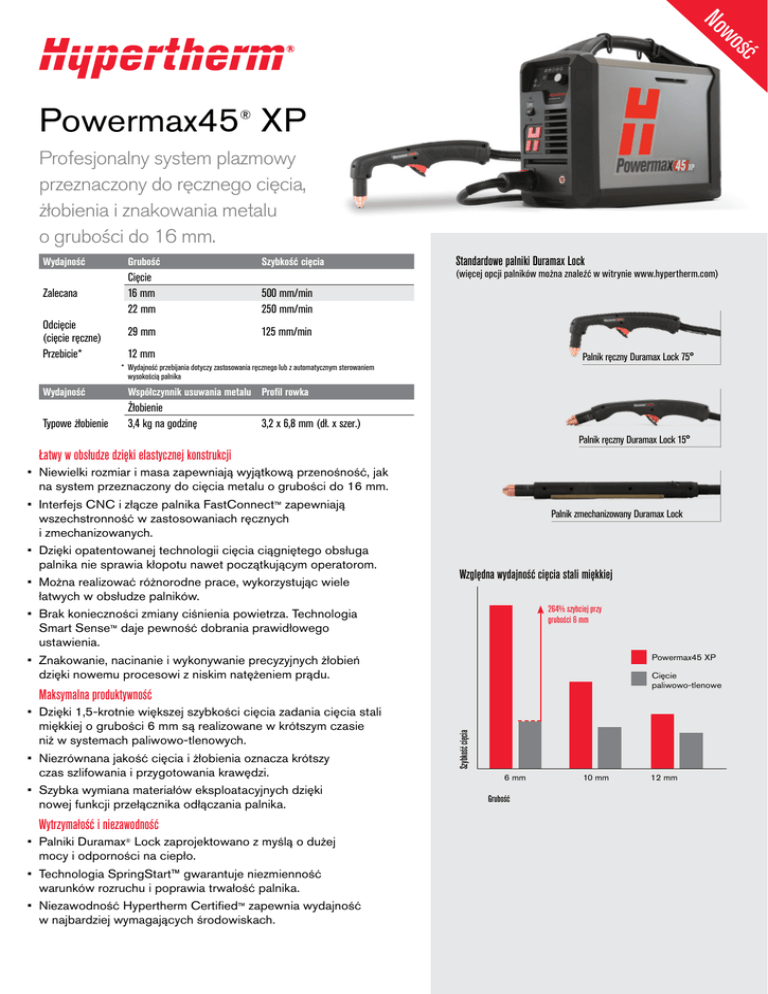ść wo No Powermax45 XP ® Profesjonalny system plazmowy przeznaczony do ręcznego cięcia, żłobienia i znakowania metalu o grubości do 16 mm. Wydajność Grubość Szybkość cięcia Zalecana Cięcie 16 mm 22 mm 500 mm/min 250 mm/min 29 mm 125 mm/min Odcięcie (cięcie ręczne) Przebicie* Standardowe palniki Duramax Lock (więcej opcji palników można znaleźć w witrynie www.hypertherm.com) 12 mm Palnik ręczny Duramax Lock 75° * Wydajność przebijania dotyczy zastosowania ręcznego lub z automatycznym sterowaniem wysokością palnika Wydajność Współczynnik usuwania metalu Profil rowka Typowe żłobienie Żłobienie 3,4 kg na godzinę 3,2 x 6,8 mm (dł. x szer.) Palnik ręczny Duramax Lock 15° Łatwy w obsłudze dzięki elastycznej konstrukcji • Niewielki rozmiar i masa zapewniają wyjątkową przenośność, jak na system przeznaczony do cięcia metalu o grubości do 16 mm. • Interfejs CNC i złącze palnika FastConnect™ zapewniają wszechstronność w zastosowaniach ręcznych i zmechanizowanych. • Dzięki opatentowanej technologii cięcia ciągniętego obsługa palnika nie sprawia kłopotu nawet początkującym operatorom. • Można realizować różnorodne prace, wykorzystując wiele łatwych w obsłudze palników. • Brak konieczności zmiany ciśnienia powietrza. Technologia Smart Sense™ daje pewność dobrania prawidłowego ustawienia. • Znakowanie, nacinanie i wykonywanie precyzyjnych żłobień dzięki nowemu procesowi z niskim natężeniem prądu. Palnik zmechanizowany Duramax Lock Względna wydajność cięcia stali miękkiej 264% szybciej przy grubości 6 mm Powermax45 XP Cięcie paliwowo-tlenowe Wytrzymałość i niezawodność • Palniki Duramax® Lock zaprojektowano z myślą o dużej mocy i odporności na ciepło. • Technologia SpringStart™ gwarantuje niezmienność warunków rozruchu i poprawia trwałość palnika. • Niezawodność Hypertherm Certified™ zapewnia wydajność w najbardziej wymagających środowiskach. Szybkość cięcia Maksymalna produktywność • Dzięki 1,5-krotnie większej szybkości cięcia zadania cięcia stali miękkiej o grubości 6 mm są realizowane w krótszym czasie niż w systemach paliwowo-tlenowych. • Niezrównana jakość cięcia i żłobienia oznacza krótszy czas szlifowania i przygotowania krawędzi. • Szybka wymiana materiałów eksploatacyjnych dzięki nowej funkcji przełącznika odłączania palnika. 6 mm Grubość 10 mm 12 mm Specyfikacje Popularne zastosowania Napięcia wejścia (±10%) 230 V, 1 faza, 50–60 Hz 400 V, 3 fazy, 50–60 Hz Prąd wejściowy przy 6,5 kW 230 V, 1 faza, 33 A 400 V, 3 fazy, 10 A Prąd wyjściowy 10–45 A Znamionowe napięcie wyjściowe 145 V DC Cykl pracy przy 40°C 50% przy 45 A, 230 V, 1 faza 60% przy 41 A, 230 V, 1 faza 100% przy 32 A, 230 V, 1 faza 50% przy 45 A, 400 V, 3 fazy 60% przy 41 A, 400 V, 3 fazy 100% przy 32 A, 400 V, 3 fazy Napięcie obwodu otwartego (OCV) 275 V DC Wymiary z rękojeściami 442 x 173 x 357 mm (gł. x szer. x wys.) Masa z palnikiem 6,1 m 15 kg Zasilanie gazem Cięcie: powietrze (czyste, suche, bezolejowe), azot, F5 Żłobienie: powietrze (czyste, suche, bezolejowe), azot, F5 Znakowanie: powietrze (czyste, suche, bezolejowe), argon Zalecana szybkość przepływu gazu wlotowego / ciśnienie 188 l/min przy 5,9 bara Długość kabla zasilającego 3 m Typ zasilacza Inwertor — IGBT (tranzystor bipolarny z izolowaną bramką) Wymagana moc znamionowa napędu 12,5 kVA (10 kW) przy pełnym natężeniu prądu wyjściowego 45 A Efektywność elektryczna 88% Zdolność recyklingu 100% Zgodność z normami CCC do użytku w Chinach. CE, RCM, CU, GOST-TR, UkrSEPRO i Serbska norma AAA — do użytku w Europie, Australii, Białorusi, Kazachstanie, Rosji, Serbii i Ukrainie oraz w innych dopuszczonych krajach. Gwarancja Zasilacz: 3 lata Palnik: 1 rok Konserwacja nieruchomości/zakładów, wykonawcy robót mechanicznych i wykonawcy z branży ogrzewania, wentylacji i klimatyzacji (HVAC), ogólna produkcja oraz: Budownictwo Serwis i naprawa Serwis sprzętu rolniczego Informacje o zamawianiu Poniżej pokazano najczęstsze konfiguracje systemu, obejmujące zasilacz, palnik i przewód roboczy. Są dostępne dodatkowe konfiguracje oraz konfiguracje personalizowane. Szczegółowe informacje znajdują się na następnej stronie. Zasilacze Zasilacz standardowy Zasilacz z portem CPC i dzielnikiem napięcia Zasilacz z portem CPC, dzielnikiem napięcia i portem szeregowym Zasilacz standardowy Zasilacz z portem CPC i dzielnikiem napięcia Zasilacz z portem CPC, dzielnikiem napięcia i portem szeregowym Konfiguracja napięcia 230 V Palnik Palniki ręczne ręczny 75° 75° i 15° Przewód Przewód Przewód Przewód 6,1 m 15,2 m 6,1 m 7,6 m bez ze bez zdalnego zdalnym zdalnego włącznika włącznikiem włącznika 088130 088132 230 V 088131 088133 088134 088141 230 V 088135 088136 088139 400 V 088144 088146 400 V 088145 088147 400 V Palnik zmechanizowany 180° o pełnej długości Przewód Przewód 10,6 m 15,2 m z kablami ze ze bez z kablami we/wy (bez zdalnym zdalnym zdalnego we/wy (bez włącznika) włącznikiem włącznikiem włącznika włącznika) 088148 088155 088140 088149 088153 088150 088154 Konfiguracje niestandardowe (możliwość dobrania zasilacza, zestawu materiałów eksploatacyjnych do palnika, przewodu roboczego i innych komponentów) Opcje zasilaczy Zasilacz standardowy Zasilacz z portem CPC i dzielnikiem napięcia Zasilacz z portem CPC, dzielnikiem napięcia i portem szeregowym 230 V CE/CCC 088093 088106 088107 400 V CE/CCC 088094 088108 088109 Opcje startowych zestawów materiałów eksploatacyjnych Cięcie ręczne Cięcie zmechanizowane Cięcie zmechanizowane z nasadką omową 428559 428560 428561 Zestaw Opcje palników Palniki ręczne Długość kabla 75° Palniki zmechanizowane 15° 4,5 m 6,1 m 088164 Palniki zrobotyzowane 180° Mały 180° 059476* 059481* 088167 059482* 45° 90° 180° 059464* 059465* 059466* 088162 7,6 m 088168 059483* 15,2 m