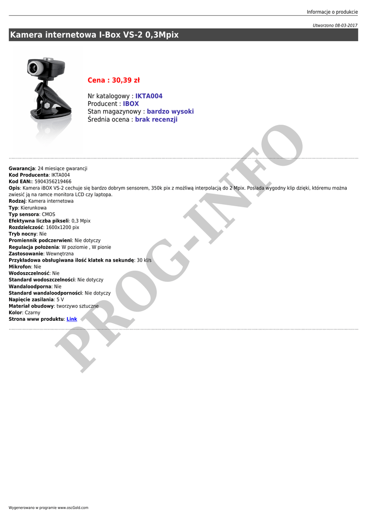 Informacje o produkcie Utworzono 08-03-2017 Kamera internetowa I-Box VS-2 0,3Mpix Cena : 30,39 zł FO Nr katalogowy : IKTA004 Producent : IBOX Stan magazynowy : bardzo wysoki Średnia ocena : brak recenzji PR O G -I N Gwarancja: 24 miesiące gwarancji Kod Producenta: IKTA004 Kod EAN:: 5904356219466 Opis: Kamera iBOX VS-2 cechuje się bardzo dobrym sensorem, 350k pix z możliwą interpolacją do 2 Mpix. Posiada wygodny klip dzięki, któremu można zwiesić ją na ramce monitora LCD czy laptopa. Rodzaj: Kamera internetowa Typ: Kierunkowa Typ sensora: CMOS Efektywna liczba pikseli: 0,3 Mpix Rozdzielczość: 1600x1200 pix Tryb nocny: Nie Promiennik podczerwieni: Nie dotyczy Regulacja położenia: W poziomie , W pionie Zastosowanie: Wewnętrzna Przykładowa obsługiwana ilość klatek na sekundę: 30 kl/s Mikrofon: Nie Wodoszczelność: Nie Standard wodoszczelności: Nie dotyczy Wandaloodporna: Nie Standard wandaloodporności: Nie dotyczy Napięcie zasilania: 5 V Materiał obudowy: tworzywo sztuczne Kolor: Czarny Strona www produktu: Link Wygenerowano w programie www.oscGold.com