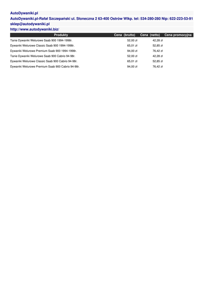 AutoDywaniki.pl AutoDywaniki.pl-Rafał Szczepański ul. Słoneczna 2 63-400 Ostrów Wlkp. tel: 534-280-280 Nip: 622-223-53-91 [email protected] http://www.autodywaniki.biz/ Produkty Cena (brutto) Cena (netto) Tanie Dywaniki Welurowe Saab 900 1994-1998r. 52,00 zł 42,28 zł Dywaniki Welurowe Classic Saab 900 1994-1998r. 65,01 zł 52,85 zł Dywaniki Welurowe Premium Saab 900 1994-1998r. 94,00 zł 76,42 zł Tanie Dywaniki Welurowe Saab 900 Cabrio 94-98r. 52,00 zł 42,28 zł Dywaniki Welurowe Classic Saab 900 Cabrio 94-98r. 65,01 zł 52,85 zł Dywaniki Welurowe Premium Saab 900 Cabrio 94-98r. 94,00 zł 76,42 zł Cena promocyjna