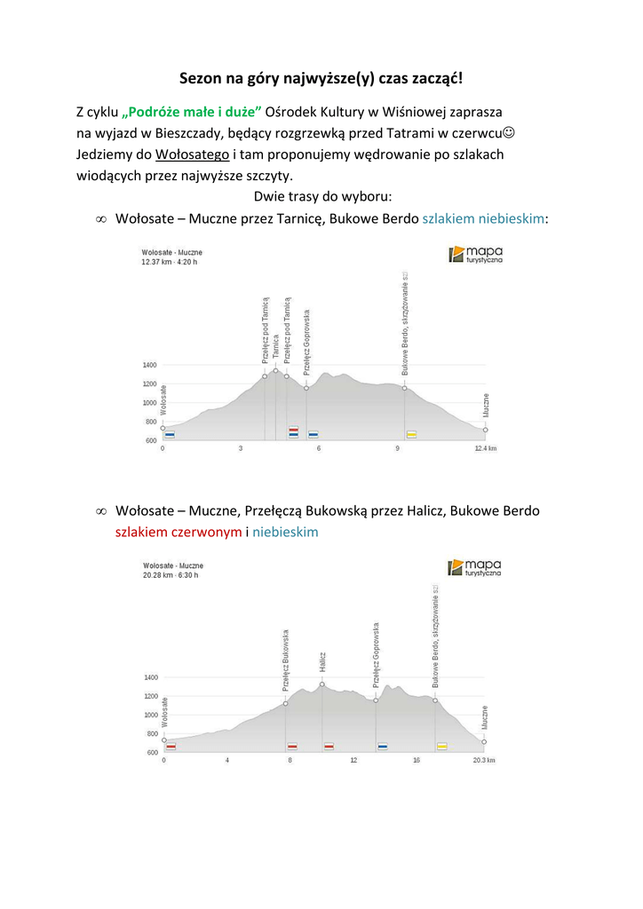 Sezon na góry najwyższe(y) czas zacząć! Z cyklu „Podróże małe i duże” Ośrodek Kultury w Wiśniowej zaprasza na wyjazd w Bieszczady, będący rozgrzewką przed Tatrami w czerwcu☺ Jedziemy do Wołosatego i tam proponujemy wędrowanie po szlakach wiodących przez najwyższe szczyty. Dwie trasy do wyboru: • Wołosate – Muczne przez Tarnicę, Bukowe Berdo szlakiem niebieskim: • Wołosate – Muczne, Przełęczą Bukowską przez Halicz, Bukowe Berdo szlakiem czerwonym i niebieskim Ponadto, po trudach wędrówki czeka nas nagroda - Zagroda pokazowa żubrów w Mucznem - do darmowego zwiedzania, podziwiania oraz możliwość zrobienia sobie selfi z żubrem☺ A na koniec integracyjny grill w plenerze! Wyjazd: 14 maja 2016 roku (sobota), godz. 6.00 rano spod placu Ośrodka Kultury w Wiśniowej, planowany powrót ok. godz. 20.00. Koszt wyjazdu (transport plus prowiant na grill): 40 zł. Przypominamy, że mogą przydać się wygodne buty☺, płaszcz przeciwdeszczowy, termos z herbatą, bułki z konserwą turystyczną oraz dwa batoniki czekoladowe, na wypadek, gdyby ktoś obok zapomniał☺ Zapisy trwają do 10 maja - ze względu na ograniczoną liczbę miejsc – obowiązuje kolejność zgłoszeń. Czekamy na odzew pod telefonem: 17 2775 393 lub osobiście w Ośrodku Kultury. Proszę pytać o Marię lub Annę☺ Nazwa Wysokość (m n.p.m.) Tarnica 1346 Krzemień 1335 Halicz 1333 Kopa Bukowska 1320 Szeroki Wierch 1315 Bukowe Berdo 1311 Wielka Rawka 1307 Połonina Caryńska 1297 Rozsypaniec 1280 Mała Rawka 1272 Połonina Wetlińska (Roh) 1255
