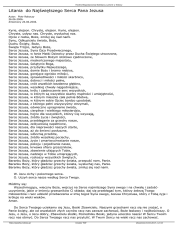 Parafia Błogosławionej Bolesławy Lament w Nidzicy Litania do Najświętszego Serca Pana Jezusa Autor: Piotr Rakoczy 26.06.2006. Zmieniony 26.06.2006. Kyrie, elejson. Chryste, elejson. Kyrie, elejson. Chryste, usłysz nas. Chryste, wysłuchaj nas. Ojcze z nieba, Boże, zmiłuj się nad nami. Synu, Odkupicielu świata, Boże, Duchu Święty, Boże, Święta Trójco, Jedyny Boże, Serce Jezusa, Syna Ojca Przedwiecznego, Serce Jezusa, w łonie Matki Dziewicy przez Ducha Świętego utworzone, Serce Jezusa, ze Słowem Bożym istotowo zjednoczone, Serce Jezusa, nieskończonego majestatu, Serce Jezusa, świątynio Boga, Serce Jezusa, przybytku Najwyższego, Serce Jezusa, domie Boży i bramo niebios, Serce Jezusa, gorejące ognisko miłości, Serce Jezusa, sprawiedliwości i miłości skarbnico, Serce Jezusa, dobroci i miłości pełne, Serce Jezusa, cnót wszelkich bezdenna głębino, Serce Jezusa, wszelkiej chwały najgodniejsze, Serce Jezusa, królu i zjednoczenie serc wszystkich, Serce Jezusa, w którym są wszystkie skarby mądrości i umiejętności, Serce Jezusa, w którym mieszka cała pełnia Bóstwa, Serce Jezusa, w którym sobie Ojciec bardzo upodobał, Serce Jezusa, z którego pełni wszyscyśmy otrzymali, Serce Jezusa, odwieczne upragnienie świata, Serce Jezusa, cierpliwe i wielkiego miłosierdzia, Serce Jezusa, hojne dla wszystkich, którzy Cię wzywają, Serce Jezusa, źródło życia i świętości, Serce Jezusa, przebłaganie za grzechy nasze, Serce Jezusa, zelżywością napełnione, Serce Jezusa, dla nieprawości naszych starte, Serce Jezusa, aż do śmierci posłuszne, Serce Jezusa, włócznią przebite, Serce Jezusa, źródło wszelkiej pociechy, Serce Jezusa, życie i zmartwychwstanie nasze, Serce Jezusa, pokoju i pojednanie nasze, Serce Jezusa, krwawa ofiaro grzeszników, Serce Jezusa, zbawienie ufających Tobie, Serce Jezusa, nadziejo w Tobie umierających, Serce Jezusa, rozkoszy wszystkich Świętych, Baranku Boży, który gładzisz grzechy świata, przepuść nam, Panie. Baranku Boży, który gładzisz grzechy świata, wysłuchaj nas, Panie. Baranku Boży, który gładzisz grzechy świata, zmiłuj się nad nami. W. Jezu cichy i pokornego serca. O. Uczyń serca nasze według Serca Twego. Módlmy się: Wszechmogący, wieczny Boże, wejrzyj na Serce najmilszego Syna swego i na chwałę i zadośćuczynienie, jakie w imieniu grzeszników Ci składa; daj się przebłagać tym, którzy żebrzą Twego miłosierdzia i racz udzielić przebaczenia w imię tegoż Syna swego, Jezusa Chrystusa, który z Tobą żyje i króluje na wieki wieków. Amen. Do Serca Twojego uciekamy się Jezu, Boski Zbawicielu. Naszymi grzechami racz się nie zrażać, o Panie święty, ale od wszelakich złych czynów racz nas zawsze zachować, Boże łaskawy i najlitościwszy. O Jezu, o Jezu, o Jezu dobry, Zbawicielu słodki, Pośredniku Boski, jedyna ucieczko nasza! W Sercu Twoim racz nas obmyć. Do Serca Twojego racz nas przytulić. W Twym Sercu na wieki racz nas zachować. http://parafia.nidzica.pl Kreator PDF Utworzono 8-03-2017, 12:43 Parafia Błogosławionej Bolesławy Lament w Nidzicy Zbawicielu słodki, Pośredniku Boski, jedyna ucieczko nasza! http://parafia.nidzica.pl Kreator PDF Utworzono 8-03-2017, 12:43
