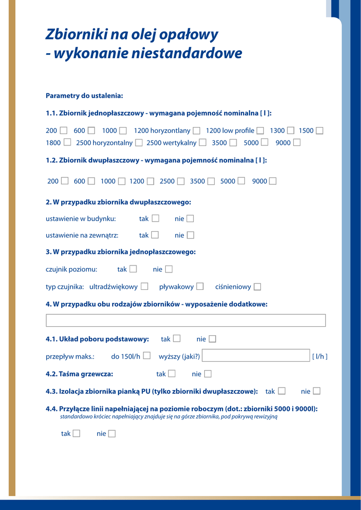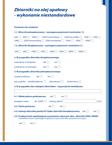 Zbiorniki na olej opałowy - wykonanie niestandardowe Parametry do ustalenia: 1.1. Zbiornik jednopłaszczowy - wymagana pojemność nominalna [ l ]: 200 600 1800 1000 1200 horyzontlany 2500 horyzontalny 1200 low profile 2500 wertykalny 3500 1300 5000 1500 9000 1.2. Zbiornik dwupłaszczowy - wymagana pojemność nominalna [ l ]: 200 600 1000 1200 2500 3500 5000 9000 2. W przypadku zbiornika dwupłaszczowego: ustawienie w budynku: tak nie ustawienie na zewnątrz: tak nie 3. W przypadku zbiornika jednopłaszczowego: czujnik poziomu: tak typ czujnika: ultradźwiękowy nie pływakowy ciśnieniowy 4. W przypadku obu rodzajów zbiorników - wyposażenie dodatkowe: 4.1. Układ poboru podstawowy: przepływ maks.: do 150l/h 4.2. Taśma grzewcza: tak nie wyższy (jaki?) tak [ l/h ] nie 4.3. Izolacja zbiornika pianką PU (tylko zbiorniki dwupłaszczowe): tak nie 4.4. Przyłącze linii napełniającej na poziomie roboczym (dot.: zbiorniki 5000 i 9000l): standardowo króciec napełniający znajduje się na górze zbiornika, pod pokrywą rewizyjną tak nie 5. Inne wymagania / dodatkowe informacje: Nazwa firmy: Imię i nazwisko: ulica: kod pocztowy: miejscowość: tel. kontaktowy: Data: Wyślij odpowiedź e-mail: Podpis: Drukuj formularz Kingspan Environmental Sp. z o.o. ul. Topolowa 5 62-090 Rokietnica Polska Tel.: +48 61 814 44 00 Fax: +48 61 814 54 99 [email protected] www.environmental.kingspan.com