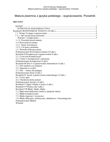2010 © Roman Rzadkowski Matura pisemna z języka polskiego - wypracowanie. Poradnik 1 Matura pisemna z języka polskiego - wypracowanie. Poradnik Spis treści WSTĘP ................................................................................................................................... 2 PUNKTACJA EGZAMINACYJNA ................................................................................. 3 Rozdział I ROZWINIĘCIE TEMATU (25 pkt.) ........................................................................ 4 1.1. Wstęp Twojego wypracowania ....................................................................................... 4 1.1.1. Jak zacząć pracę pisemną? ........................................................................................... 5 Wariant 1 wstępu pracy ...................................................................................................... 5 1.1.2. Powtórki przed maturą 1.2. Rozwinięcie tematu 1.2.1. Istota rozwinięcia 1.2.2. Cel pracy pisemnej 1.3. Wnioski kończące pracę Podsumowanie Rozwinięcia tematu (25 pkt.) Rozdział II Kompozycja wypracowania (5 pkt.) 2.1. Czym jest Kompozycja? 2.2. Cytaty w Kompozycji i stylizacja Podsumowanie Kompozycji (5 pkt.) Rozdział III Styl w wypracowaniu maturalnym (5 pkt.) 3.1. Styl naukowy na maturze 3.2. Egzamin to wybór 3.3. Styl – walory decydujące Podsumowanie Stylu (5 pkt.) Rozdział IV Język wypracowania maturalnego (12 pkt.) 4.1. Ćwicz opis 4.2. Charakterystyka postaci Podsumowanie Języka (12 pkt.) Rozdział V Zapis a błędy w pracy (3 pkt.) Rozdział VI Walory (do 4 pkt.) Rozdział VII Błędy, błędy, błędy… 7.1. Błąd nieświadomości autora a spójność tekstu 7.2. Błędy kompozycyjne 7.3. Błędy logiczne i wyrazowe 7.4. Błędy fleksyjne, stylistyczne, składniowe i frazeologiczne Podsumowanie błędów Wnioski 2010 © Roman Rzadkowski Matura pisemna z języka polskiego - wypracowanie. Poradnik 2 WSTĘP Egzamin maturalny z języka polskiego jest "walką o punkty" w pozytywnym, niemal sportowym znaczeniu tego słowa. Po napisaniu matury przez Ciebie praca wędruje w ręce egzaminatora, który patrzy na nią przez pryzmat klucza i całej wiedzy, jaką posiada. Dygresja. Klucz egzaminacyjny?! Można go porównać do sposobu rozwiązywania zadania z matematyki: kiedy masz działanie typu 22+3(3+2), to punkty na egzaminie w klasie szóstej i ewentualnie na egzaminie gimnazjalnym otrzymujesz za: kolejność operacji, którą powinieneś znać, a więc najpierw działanie w nawiasach, mnożenie, potem dodawanie plus poprawny wynik. Podobnie jest z kluczem. Kiedy masz dokonać analizy fragmentu wiersza, a jest to np. sonet, to egzaminator spodziewa się, że użyjesz pojęcia “sonet”, bo to powinien wiedzieć każdy maturzysta i już za samo rozpoznanie formy wiersza masz punkty. Kiedy analizujesz fragment powieści, dostaniesz punkty za poprawne i rzeczowe używanie pojęć typu: “XY to bohater powieści, której autorem jest XA. Akcja dzieła rozgrywa się w XB w okresie od maja 18?? do czerwca 18??”. Chodzi o to, że tak demonizowany przez niektórych klucz, wymaga tego samego, czego wcześniej Twój nauczyciel podczas zajęć: rzeczowości, konkretów, faktów, imion bohaterów, zdarzeń z omawianych dzieł itp. Jeśli ich nie znasz, świat się nie zawali, ponieważ Twoje zadanie to analiza podanego w arkuszu fragmentu lektury, a nie znajomości jej w całości. Można powiedzieć zatem, że egzamin maturalny w tym sensie jest łatwiejszy od wypracowania klasowego po omawianej książce. To optymistyczne, nieprawdaż? Jeśli praca jest skomponowana poprawnie, a także jest zgodna z kluczem, czyli z celem pisania założonym przez autorów zagadnień maturalnych, wygrywasz. Aby zaliczyć egzamin pozytywnie, należy otrzymać 30% punktów. Ponieważ jest ich do zdobycia 70, wynik 21 punktów da Ci zwycięstwo, mniejsza ich ilość klęskę. Teoretycznie zdobyć 21 punktów to nie problem, bowiem masz test na rozumienie tekstu. Za poprawne jego rozwiązanie można otrzymać maksymalnie 20 punktów (łatwo powiedzieć...). "Zatem w wypracowaniu chodzi o zdobycie choć jednego punkcika?" Niestety nie, bo trzeba "wypisać się" na co najmniej 250 słów, 2xA4, a to nie jest "pestka", bynajmniej dla większości maturzystów. Aby Cię pocieszyć, powiem, że pewnego roku zaproszono do napisania matury wybitnych publicystów i pisarzy, i... wielu nie trafiło w klucz (nie zdało), bo... "Mieli słabe ściągi?" Nie, po prostu nie czytali żadnego poradnika, swoją maturę zdawali, kierując się innymi kryteriami. Oczekiwania autorów pytań są inne niż byliśmy kiedyś do tego przyzwyczajeni. Tak naprawdę stara matura, sprzed 2005 roku, sprawdzała umiejętność komponowania wypowiedzi pisemnej i wiedzę z zakresu znajomości kanonu lektur. Maturzysta mógł wybierać, jakie dzieła przeanalizuje podczas pisania eseju maturalnego. Twoja matura sprawdza przede wszystkim umiejętność analizowania i interpretowania podanego fragmentu dzieła. Matura pisemna z języka polskiego jest egzaminem zewnętrznym podzielonym na dwie części: 1. Test na rozumienie tekstu. 2. Pisanie wypracowania. Niektóre z was "z marszu" potrafią rozwiązywać test na rozumienie tekstu, w ogóle się nie boją tej części matury i uważają, że nie trzeba ćwiczyć. Szkoda, bo strata punktów "w głupi sposób" (mówiąc językiem sportowym) sprawia większy ból niż strata spowodowana faktycznymi problemami, np. językowymi, w trakcie pisania wypracowania. Optymistkom oddalającym od siebie okres ćwiczenia testu lub w ogóle rezygnującym z tego, mogę powiedzieć, iż przeciętna ilość zdobywanych punktów za test jest o wiele niższa (11-14 pkt.) na maturze niż mogłoby to być, gdybyście ćwiczyły. Z kolei wiele uczennic uważa, iż potrafi pisać i zawsze coś "nakręci", więc nie muszą ćwiczyć pisania wypracowań. Dopiero po maturze wiele osób żałuje, bo temat o