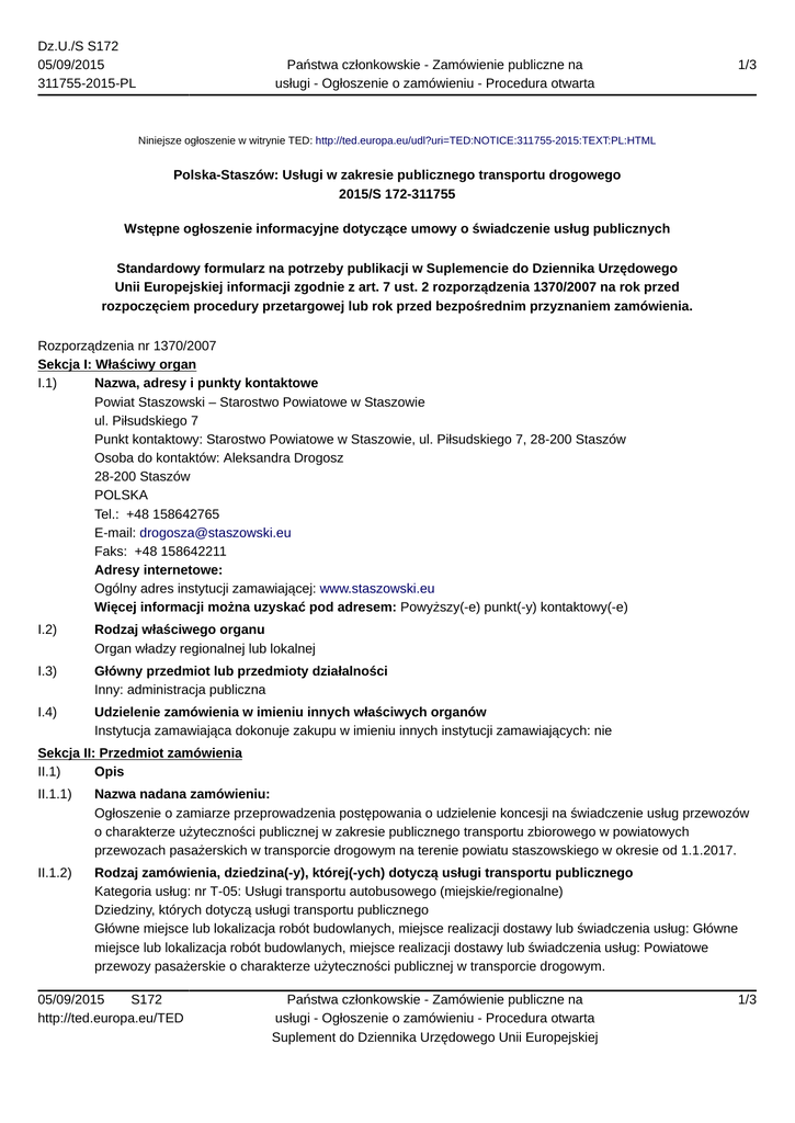 Dz.U./S S172 05/09/2015 311755-2015-PL Państwa członkowskie - Zamówienie publiczne na usługi - Ogłoszenie o zamówieniu - Procedura otwarta 1/3 Niniejsze ogłoszenie w witrynie TED: http://ted.europa.eu/udl?uri=TED:NOTICE:311755-2015:TEXT:PL:HTML Polska-Staszów: Usługi w zakresie publicznego transportu drogowego 2015/S 172-311755 Wstępne ogłoszenie informacyjne dotyczące umowy o świadczenie usług publicznych Standardowy formularz na potrzeby publikacji w Suplemencie do Dziennika Urzędowego Unii Europejskiej informacji zgodnie z art. 7 ust. 2 rozporządzenia 1370/2007 na rok przed rozpoczęciem procedury przetargowej lub rok przed bezpośrednim przyznaniem zamówienia. Rozporządzenia nr 1370/2007 Sekcja I: Właściwy organ I.1) Nazwa, adresy i punkty kontaktowe Powiat Staszowski – Starostwo Powiatowe w Staszowie ul. Piłsudskiego 7 Punkt kontaktowy: Starostwo Powiatowe w Staszowie, ul. Piłsudskiego 7, 28-200 Staszów Osoba do kontaktów: Aleksandra Drogosz 28-200 Staszów POLSKA Tel.: +48 158642765 E-mail: [email protected] Faks: +48 158642211 Adresy internetowe: Ogólny adres instytucji zamawiającej: www.staszowski.eu Więcej informacji można uzyskać pod adresem: Powyższy(-e) punkt(-y) kontaktowy(-e) I.2) Rodzaj właściwego organu Organ władzy regionalnej lub lokalnej I.3) Główny przedmiot lub przedmioty działalności Inny: administracja publiczna I.4) Udzielenie zamówienia w imieniu innych właściwych organów Instytucja zamawiająca dokonuje zakupu w imieniu innych instytucji zamawiających: nie Sekcja II: Przedmiot zamówienia II.1) Opis II.1.1) Nazwa nadana zamówieniu: Ogłoszenie o zamiarze przeprowadzenia postępowania o udzielenie koncesji na świadczenie usług przewozów o charakterze użyteczności publicznej w zakresie publicznego transportu zbiorowego w powiatowych przewozach pasażerskich w transporcie drogowym na terenie powiatu staszowskiego w okresie od 1.1.2017. II.1.2) Rodzaj zamówienia, dziedzina(-y), której(-ych) dotyczą usługi transportu publicznego Kategoria usług: nr T-05: Usługi transportu autobusowego (miejskie/regionalne) Dziedziny, których dotyczą usługi transportu publicznego Główne miejsce lub lokalizacja robót budowlanych, miejsce realizacji dostawy lub świadczenia usług: Główne miejsce lub lokalizacja robót budowlanych, miejsce realizacji dostawy lub świadczenia usług: Powiatowe przewozy pasażerskie o charakterze użyteczności publicznej w transporcie drogowym. 05/09/2015 S172 http://ted.europa.eu/TED Państwa członkowskie - Zamówienie publiczne na usługi - Ogłoszenie o zamówieniu - Procedura otwarta Suplement do Dziennika Urzędowego Unii Europejskiej 1/3 Dz.U./S S172 05/09/2015 311755-2015-PL Państwa członkowskie - Zamówienie publiczne na usługi - Ogłoszenie o zamówieniu - Procedura otwarta 2/3 Kod NUTS PL,PL332 II.1.3) Krótki opis zamówienia Obsługa linii komunikacji przewozów pasażerskich o charakterze użyteczności publicznej w transporcie drogowym na terenie Powiatu Staszowskiego. II.1.4) Wspólny Słownik Zamówień (CPV) 60112000 II.1.5) Informacje na temat podwykonawstwa Przewidywane jest zlecenie podwykonawstwa: tak Wartość lub część zamówienia, które prawdopodobnie będzie zlecone stronom trzecim: Nieznana Krótki opis wartości/części zamówienia, które będzie zlecone podwykonawcom: Wartości/części zamówienia, które będzie zlecone podwykonawcom: Może być zlecony dowóz osób niepełnosprawnych. II.2) Ilość i/lub wartość usług: II.3) Planowana data rozpoczęcia i czas trwania zamówienia lub termin realizacji Rozpoczęcie: 1.1.2017 Okres w miesiącach: 36 (od udzielenia zamówienia) II.4) Krótki opis rodzaju i zakresu robót budowlanych Sekcja IV: Procedura IV.1) Rodzaj procedury Otwarta IV.2) Kryteria udzielenia zamówienia IV.2.1) Kryteria udzielenia zamówienia IV.2.2) Informacje na temat aukcji elektronicznej IV.3) Informacje administracyjne IV.3.1) Numer referencyjny: IV.3.2) Warunki uzyskania specyfikacji i dokumentów dodatkowych IV.3.3) Termin składania ofert lub wniosków o dopuszczenie do udziału w postępowaniu 29.9.2016 IV.3.4) Języki, w których można sporządzać oferty lub wnioski o dopuszczenie do udziału w postępowaniu polski. IV.3.5) Minimalny okres, w którym oferent będzie związany ofertą IV.3.6) Warunki otwarcia ofert Sekcja VI: Informacje uzupełniające VI.1) Informacje dodatkowe: Na podstawie art. 23 ust. 5 ustawy z 16.12.2010 o publicznym transporcie zbiorowym (Dz.U. z 2011 r. nr 5 poz. 13) zastrzega się możliwość zmiany powyższych informacji. VI.2) Procedury odwoławcze VI.2.1) Organ odpowiedzialny za procedury odwoławcze VI.2.2) Składanie odwołań VI.2.3) Źródło, gdzie można uzyskać informacje na temat składania odwołań 05/09/2015 S172 http://ted.europa.eu/TED Państwa członkowskie - Zamówienie publiczne na usługi - Ogłoszenie o zamówieniu - Procedura otwarta Suplement do Dziennika Urzędowego Unii Europejskiej 2/3 Dz.U./S S172 05/09/2015 311755-2015-PL Państwa członkowskie - Zamówienie publiczne na usługi - Ogłoszenie o zamówieniu - Procedura otwarta VI.3) Ogłoszenie o udzieleniu zamówienia: VI.4) Data wysłania niniejszego ogłoszenia: 2.9.2015 05/09/2015 S172 http://ted.europa.eu/TED Państwa członkowskie - Zamówienie publiczne na usługi - Ogłoszenie o zamówieniu - Procedura otwarta Suplement do Dziennika Urzędowego Unii Europejskiej 3/3 3/3