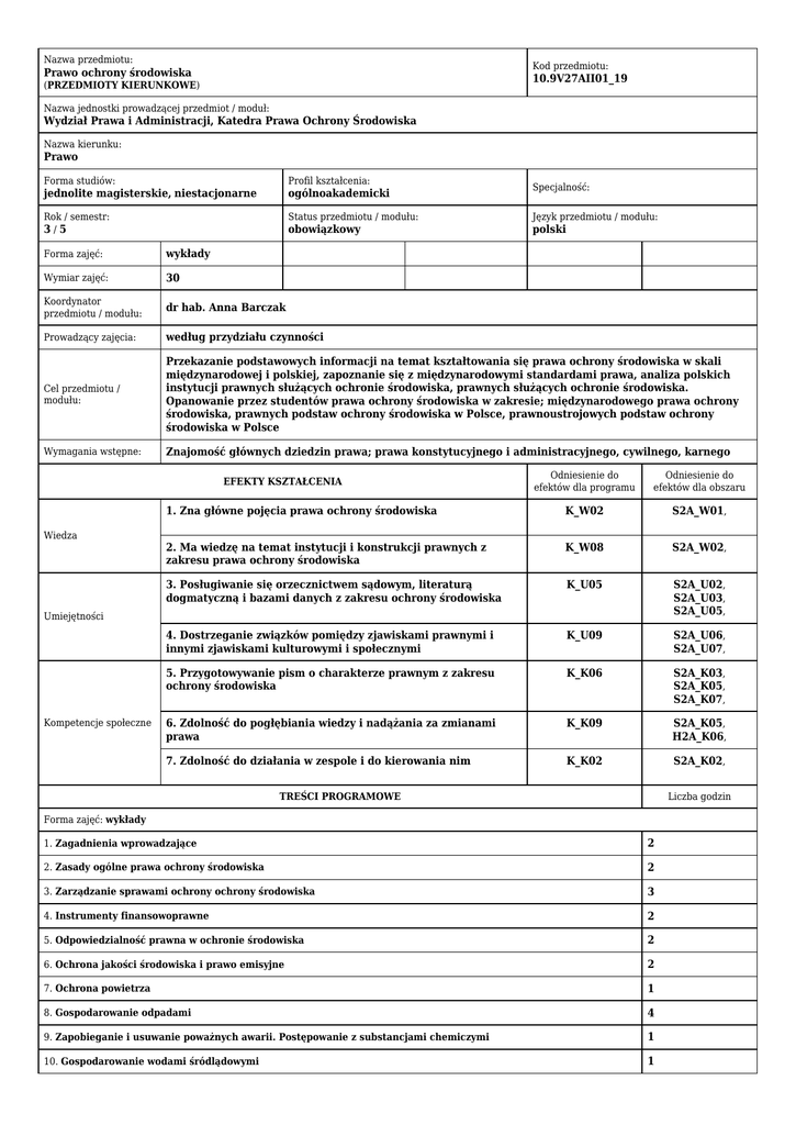 Nazwa przedmiotu: Kod przedmiotu: Prawo ochrony środowiska 10.9V27AII01_19 (PRZEDMIOTY KIERUNKOWE) Nazwa jednostki prowadzącej przedmiot / moduł: Wydział Prawa i Administracji, Katedra Prawa Ochrony Środowiska Nazwa kierunku: Prawo Forma studiów: Profil kształcenia: jednolite magisterskie, niestacjonarne ogólnoakademicki Rok / semestr: 3/5 Status przedmiotu / modułu: Język przedmiotu / modułu: obowiązkowy polski Specjalność: Forma zajęć: wykłady Wymiar zajęć: 30 Koordynator przedmiotu / modułu: dr hab. Anna Barczak Prowadzący zajęcia: według przydziału czynności Cel przedmiotu / modułu: Przekazanie podstawowych informacji na temat kształtowania się prawa ochrony środowiska w skali międzynarodowej i polskiej, zapoznanie się z międzynarodowymi standardami prawa, analiza polskich instytucji prawnych służących ochronie środowiska, prawnych służących ochronie środowiska. Opanowanie przez studentów prawa ochrony środowiska w zakresie; międzynarodowego prawa ochrony środowiska, prawnych podstaw ochrony środowiska w Polsce, prawnoustrojowych podstaw ochrony środowiska w Polsce Wymagania wstępne: Znajomość głównych dziedzin prawa; prawa konstytucyjnego i administracyjnego, cywilnego, karnego Odniesienie do efektów dla programu Odniesienie do efektów dla obszaru 1. Zna główne pojęcia prawa ochrony środowiska K_W02 S2A_W01, 2. Ma wiedzę na temat instytucji i konstrukcji prawnych z zakresu prawa ochrony środowiska K_W08 S2A_W02, 3. Posługiwanie się orzecznictwem sądowym, literaturą dogmatyczną i bazami danych z zakresu ochrony środowiska K_U05 S2A_U02, S2A_U03, S2A_U05, 4. Dostrzeganie związków pomiędzy zjawiskami prawnymi i innymi zjawiskami kulturowymi i społecznymi K_U09 S2A_U06, S2A_U07, 5. Przygotowywanie pism o charakterze prawnym z zakresu ochrony środowiska K_K06 S2A_K03, S2A_K05, S2A_K07, 6. Zdolność do pogłębiania wiedzy i nadążania za zmianami prawa K_K09 S2A_K05, H2A_K06, 7. Zdolność do działania w zespole i do kierowania nim K_K02 S2A_K02, EFEKTY KSZTAŁCENIA Wiedza Umiejętności Kompetencje społeczne TREŚCI PROGRAMOWE Liczba godzin Forma zajęć: wykłady 1. Zagadnienia wprowadzające 2 2. Zasady ogólne prawa ochrony środowiska 2 3. Zarządzanie sprawami ochrony ochrony środowiska 3 4. Instrumenty finansowoprawne 2 5. Odpowiedzialność prawna w ochronie środowiska 2 6. Ochrona jakości środowiska i prawo emisyjne 2 7. Ochrona powietrza 1 8. Gospodarowanie odpadami 4 9. Zapobieganie i usuwanie poważnych awarii. Postępowanie z substancjami chemiczymi 1 10. Gospodarowanie wodami śródlądowymi 1 11. Ochrona wód morskich 2 12. Gospodarowanie zasobami geosfery 2 13. Ochrona różnorodności biologicznej 2 14. Ochrona użytkowa zasobów biosfery 4 Metody kształcenia Metody weryfikacji efektów kształcenia Wykład prowadzony metodą nauczania teoretycznego, uwzględniający stosowanie technik audiowizualnych. Nr efektu kształcenia z sylabusa * egzamin pisemny 1,2,3,4,5,6,7, wykład - egzamin ustny (po uzgodnieniu); pisemny (test: 10 pytań stwierdzających prawdziwość zdań Prawda, Fałsz; 5 pytań na uzupełnienie) Forma i warunki zaliczenia Ocena końcowa jest oceną otrzymaną z testu lub egzaminu ustnego. Test obejmuje znajomość zagadnień omówionych w trakcie wykładu oraz zalecanej literatury przedmiotu. Punktacja z testu jest następująca: 15 pkt. - bardzo dobry 14 pkt. - dobry plus 13-12 pkt - dobry 11 pkt - dostateczny plus 10-8 pkt - dostateczny 7 pkt - ... - niedostateczny Literatura podstawowa Górski M. (red.) (2009): Prawo ochrony środowiska. Oficyna a Wolters Kluwer business Szuma K. (2013): Prawo ochrony środowiska. Zarys wykładu. Wybór materiałów, tez orzeczeń, sądów, kazusów i testów. C.H. Beck Wierzbowski B., Rakoczy B. (2012): Prawo ochrony środowiska. Zagadnienia podstawowe. LexisNexis Polska Sp. z o.o. Literatura uzupełniająca Boć J., Nowacki K., Samborska-Boć E. (2006): Ochrona środowiska. Kolonia Limited Stelmasiak J. (red.) (2010): Prawo ochrony środowiska. LexisNexis Polska Sp. z o.o Jendrośka J., Bar M. (2005): Prawo ochrony środowiska. Centrum Prawa Ekologicznego NAKŁAD PRACY STUDENTA: Liczba godzin Zajęcia dydaktyczne 30 Udział w konsultacjach 30 Zdawanie egzaminu lub/i zaliczenia 4 Przygotowanie się do zajęć 20 Studiowanie literatury 40 Przygotowanie się do egzaminu lub/i zaliczenia 26 ŁĄCZNY nakład pracy studenta w godz. 150 Liczba punktów ECTS 6