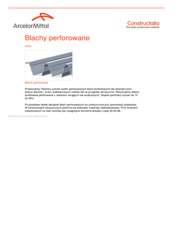 Blachy perforowane OPIS Blachy perforowane Proponujemy Państwu szeroki wybór perforowanych blach profilowanych dla wewnętrznych pokryć dachów i ścian, podwieszanych sufitów lub na przegrody akustyczne. Wykonujemy blachy profilowane perforowane z otworami okrągłymi lub wydłużonymi. Stopień perforacji wynosi od 15 do 30%. Przykładowe tabele obciążeń blach perforowanych sa umieszczone przy prezentacji produktów. W konstrukcjach akustycznych powinno się stosować materiały wielowarstwowe. Przy ścianach kasetonowych ze stali możliwe jest osiągnięcie tłumienia dźwięku rzędu 40-50 dB. Copyright © 2014 Constructalia. All rights reserved