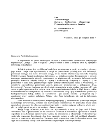 Pan Jarosław Fatyga Zastępca Prokuratora Okręgowego Prokuratura Okręgowa w Legnicy ul. Grunwaldzka 8 59-220 Legnica Warszawa, dnia 30 sierpnia 2011 r. Szanowny Panie Prokuratorze, W odpowiedzi na pismo zawierające wniosek o zamieszczenie sprostowania dotyczącego reportażu pt.: „Tango - Cash w Legnicy" („Duży Format" z dnia 11 sierpnia 2011 r.) uprzejmie informuję, co następuje: Redakcja gotowa jest opublikować nadesłane sprostowanie w części obejmującej pierwszy jego akapit. Druga część sprostowania, z uwagi na prawdziwość podanej przez nas informacji, publikacji podlegać nie może. Zwracam uwagę, że na stronie internetowej Komendy Miejskiej Policji w Legnicy figuruje następująca informacja: „... podpisane zostało Porozumienie w sprawie testowego przekazywania danych rejestrowych w użytkowanych systemach informatycznych pomiędzy Komendą Miejską Policji w Legnicy i Prokuraturą Okręgową w Legnicy (....) To pionierskie w skali roku przedsięwzięcie łączy systemy informatyczne Policji i Prokuratury, co umożliwia automatyczne przesyłanie danych pomiędzy prokuratorem a policjantem drogą internetową". Potoczne i opisowe określenie użyte w reportażu, a więc swoista „baza danych" było zatem w pełni uprawnione i w żadnym razie nie wprowadzało czytelników w błąd. Zresztą, takim właśnie sformułowaniem posłużył się rozmówca dziennikarki, który - gdy wdrażano ten system -był funkcjonariuszem Policji. Takim też określeniem - jak ustaliła autorka - posługiwali się w codziennej pracy legniccy policjanci. Wbrew więc Pana twierdzeniu nie jest to informacja nieprawdziwa. Jeżeli zechce Pan zaakceptować powyższą propozycję, tj. zamieszczenia pierwszego akapitu nadesłanego sprostowania, zostanie ono niezwłocznie opublikowane. W przypadku braku takiej zgody, będę zmuszony do odmowy publikacji jego treści w całości, mając za podstawę, art. 33 ust. 1 pkt 1 w związku z art. 33 ust. 2 pkt 1 ustawy - Prawo prasowe. Swoją drogą nadesłane przez Pana tzw. sprostowanie, z uwagi na jego treść i formę, utwierdziło nas w przekonaniu co do zasadności twierdzeń i okoliczności opisanych w naszym reportażu. Z nadesłanego sprostowania wynika, że prokuratura z obszernego, wielowątkowego materiału prasowego kwestionuje dwa jego elementy mające w całej tej publikacji charakter trzecio-, a może nawet pięciorzędny. To zresztą dość powszechna praktyka kwestionowania tego typu detali dla samej zasady i celu zniwelowania negatywnych skutków publikacji. Niezależnie od wskazanych wyżej uwag dotyczących treści sprostowania, zmuszony jestem stanowczo zaprotestować przeciwko skandalicznej, sprzecznej z prawem i dobrymi obyczajami praktyce, która ujawniła się w przypadku Państwa wniosku o sprostowanie. Już w dniu 19 sierpnia 2011 r. Prokuratura Okręgowa w Legnicy na swojej stronie internetowej zamieściła skan przedmiotowego wniosku o zamieszczenie sprostowania. Wniosek ten do redaktora naczelnego dotarł dopiero 24 sierpnia 2011 r. Zachowanie to łamie wszelkie reguły dobrego obyczaju i przepisy obowiązującego prawa. Przypominam, że wniosek o zamieszczenie sprostowania składany jest do redaktora naczelnego danego tytułu prasowego. Jeżeli wniosek jest zasadny, to sprostowanie publikowane jest na łamach tego tytułu prasowego, w którym ewentualnie opublikowano wiadomości nieprawdziwe lub nieścisłe. Gdy sprostowanie jest bezzasadne - redaktor naczelny odmawia jego zamieszczenia, co kończy postępowanie redakcyjne w sprawie. Osoba zainteresowana może oczywiście odwołać się do właściwego sądu w trybie art. 39 prawa prasowego. Przywołane prawo prasowe ściśle reguluje wszystkie kwestie związane z procedurą wnioskowania o zamieszczenie sprostowania. Nie przewiduje ono takiej formuły, jak upublicznianie (rozpowszechnianie) wniosku o sprostowanie przez osobę zainteresowaną, zanim wniosek został formalnie rozpatrzony przez redaktora naczelnego. Skoro podjęli Państwo decyzję o rozpowszechnieniu wnioskowanego sprostowania, to wystąpienie z tym samym wnioskiem do redaktora naczelnego „Gazety Wyborczej" jest de facto bezprzedmiotowe. Działanie Państwa wyczerpuje także znamiona naruszenia prawa w postaci tajemnicy korespondencji. Przypomnę, że tajemnica korespondencji posiada cywilnoprawną ochronę opartą zarówno na przepisach kodeksu cywilnego (art. 23-24), jak i ustawy o prawie autorskim i prawach pokrewnych (art. 82-83). Z przepisów tych wynika, że rozpowszechnianie (podanie do publicznej wiadomości) treści korespondencji wymaga zgody adresata. Dotyczy to także listów („zwykłych" i elektronicznych) kierowanych do środków masowego przekazu. Jeśli są one wysyłane do oznaczonego redaktora (dziennikarza), tylko on może się z nimi zapoznać i podjąć decyzję o rozpowszechnieniu. Nie może tego czynić bez upoważnienia (adresata) nadawca takiego pisma. Takie działanie stanowi także naruszenie dóbr osobistych adresata. Przypomnę, że tajemnica korespondencji polega na ukryciu treści komunikatu przed innymi niż adresat osobami. Podjęte przez Państwa działania zmierzają do podważenia dobrego imienia i wiarygodności autorki reportażu. Działania te odbieramy jako całkowicie bezprawne, nie mające zarówno podstawy faktycznej, jak i prawnej. Oczekujemy, że tzw. sprostowanie i jego uzasadnienie zostaną niezwłocznie usunięte ze strony internetowej prokuratury. Działanie, które Państwo podjęli zdarza się incydentalnie, i jeśli już, to tylko w przypadku podmiotów nie mających odpowiedniej wiedzy prawnej. Jest szokującym, że tego typu praktyk dopuszcza się prokuratura, która winna dawać przykład legalizmu i zgodności wszelkich działań z dobrym obyczajem.