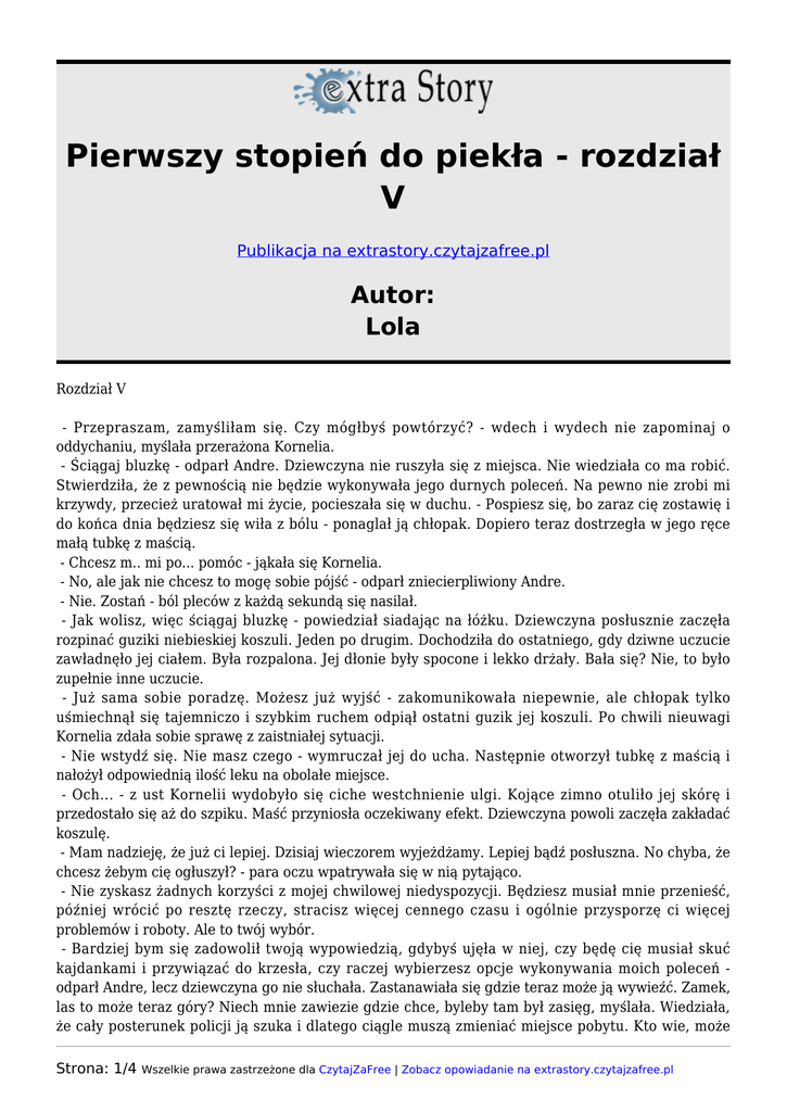 Pierwszy stopień do piekła - rozdział V Publikacja na extrastory.czytajzafree.pl Autor: Lola Rozdział V - Przepraszam, zamyśliłam się. Czy mógłbyś powtórzyć? - wdech i wydech nie zapominaj o oddychaniu, myślała przerażona Kornelia. - Ściągaj bluzkę - odparł Andre. Dziewczyna nie ruszyła się z miejsca. Nie wiedziała co ma robić. Stwierdziła, że z pewnością nie będzie wykonywała jego durnych poleceń. Na pewno nie zrobi mi krzywdy, przecież uratował mi życie, pocieszała się w duchu. - Pospiesz się, bo zaraz cię zostawię i do końca dnia będziesz się wiła z bólu - ponaglał ją chłopak. Dopiero teraz dostrzegła w jego ręce małą tubkę z maścią. - Chcesz m.. mi po... pomóc - jąkała się Kornelia. - No, ale jak nie chcesz to mogę sobie pójść - odparł zniecierpliwiony Andre. - Nie. Zostań - ból pleców z każdą sekundą się nasilał. - Jak wolisz, więc ściągaj bluzkę - powiedział siadając na łóżku. Dziewczyna posłusznie zaczęła rozpinać guziki niebieskiej koszuli. Jeden po drugim. Dochodziła do ostatniego, gdy dziwne uczucie zawładnęło jej ciałem. Była rozpalona. Jej dłonie były spocone i lekko drżały. Bała się? Nie, to było zupełnie inne uczucie. - Już sama sobie poradzę. Możesz już wyjść - zakomunikowała niepewnie, ale chłopak tylko uśmiechnął się tajemniczo i szybkim ruchem odpiął ostatni guzik jej koszuli. Po chwili nieuwagi Kornelia zdała sobie sprawę z zaistniałej sytuacji. - Nie wstydź się. Nie masz czego - wymruczał jej do ucha. Następnie otworzył tubkę z maścią i nałożył odpowiednią ilość leku na obolałe miejsce. - Och... - z ust Kornelii wydobyło się ciche westchnienie ulgi. Kojące zimno otuliło jej skórę i przedostało się aż do szpiku. Maść przyniosła oczekiwany efekt. Dziewczyna powoli zaczęła zakładać koszulę. - Mam nadzieję, że już ci lepiej. Dzisiaj wieczorem wyjeżdżamy. Lepiej bądź posłuszna. No chyba, że chcesz żebym cię ogłuszył? - para oczu wpatrywała się w nią pytająco. - Nie zyskasz żadnych korzyści z mojej chwilowej niedyspozycji. Będziesz musiał mnie przenieść, później wrócić po resztę rzeczy, stracisz więcej cennego czasu i ogólnie przysporzę ci więcej problemów i roboty. Ale to twój wybór. - Bardziej bym się zadowolił twoją wypowiedzią, gdybyś ujęła w niej, czy będę cię musiał skuć kajdankami i przywiązać do krzesła, czy raczej wybierzesz opcje wykonywania moich poleceń odparł Andre, lecz dziewczyna go nie słuchała. Zastanawiała się gdzie teraz może ją wywieźć. Zamek, las to może teraz góry? Niech mnie zawiezie gdzie chce, byleby tam był zasięg, myślała. Wiedziała, że cały posterunek policji ją szuka i dlatego ciągle muszą zmieniać miejsce pobytu. Kto wie, może Strona: 1/4 Wszelkie prawa zastrzeżone dla CzytajZaFree | Zobacz opowiadanie na extrastory.czytajzafree.pl wywiózł ją za granice kraju. Nie rozumiała tylko jednego - zamiarów porywacza. Dlaczego wyrządził krzywdę jej siostrze? Czy Monika ma w ogóle coś z tym wspólnego? Dlaczego później uprowadził ją? Dlaczego jej pomaga, ratuje życie... Co tu się dzieje? - Czy ty mnie przez chwilę możesz posłuchać? zapytał zniecierpliwiony chłopak. - Mam tyle pytań. Zostałam porwana. Powinieneś się cieszyć, że nie wariuję i jeszcze nie popadłam w depresje! - wykrzyczała Kornelia i wtuliła głowę w poduszkę. - Nigdzie nie jadę zostaję tutaj! - Nie utrudniaj sytuacji. Jest już dosyć skomplikowana! - Andre prawie krzyczał. - To po co mnie porywałeś, nie było by żadnej trudnej sytuacji - dziewczyna starała się opanować szloch. - Koniec zabawy - chłopak był bezwzględny i stanowczy. - Zabieram cię do Herestium. - Co?! Nigdzie nie idę. - Nie musisz - w tym momencie była już w jego ramionach. Wyszli z pokoju i udali się schodami w dół. Zeszli do piwnicy. Znajdował się tam metalowy stół, który był jedynym oświetlonym przedmiotem w mroku. Andre położył dziewczynę na lśniącej powierzchni mebla. Nagle coś zaskrzypiało i w świetle lampy pojawiła się postać w długim, ciemnym płaszczu. Na głowie miała worek z otworami na nos i oczy. Kat, przerażająca myśl przeszła przez głowę Kornelii. Miała tysiące pytań, ale żadnego nie potrafiła wypowiedzieć. - To ona - powiedział Andre. - Są z nią małe problemy. - Rozumiem - odparł nie znajomy, męski głos. - Zaraz przyjdę. Popilnuj jej - zakomunikował i zniknął w ciemności. Przez dłuższą chwilę oboje milczeli, aż w końcu dziewczyna powiedziała: - Co to jest Heme... No wiesz... yy, hore... - Herestium - poprawił ją chłopak. - No właśnie. Co to jest Herestium? - W głowie Kornelii kłębiły się najgorsze myśli. - Moja droga - odparł przyjacielskim tonem. - Herestium to sala tortur. Herestium to sala tortur. To sala tortur. Sala tortur. - Że co?! - Wrzasnęła Kornelia, aż chłopakowi ciary przeszły po plecach. - Zaciągnąłeś mnie do sali tortur?! Boże, co ja ci takiego zrobiłam? Byłam normalną nastolatką z normalnym życiem! A ty zrujnowałeś wszystko co miałam. Nawet moją psychikę. Torturuj mnie, proszę bardzo! I tak ci nic nie powiem. Możesz mnie zabić. Nie mam już nic do stracenia! - Uczucia Kornelii buzowały. Żal, wściekłość, gniew, miłość, złość i strach. Bez zastanowienia zeskoczyła ze stołu i zatopiła się w ciemnościach. Szukała czegoś ostrego, co mogło by przynieść szybką ulgę - śmierć. Natknęła się na dwie strzykawki i żyletkę. Odwróciła się w stronę Andre. Chłopak patrzył na nią i starał się nie okazywać żadnych uczuć. Jednak Kornelia bez problemu wyczytała z jego oczu lęk. - Nie zbliżaj się, albo już nigdy nic ci nie powiem. Nie będziesz miał przyjemności z oglądania mojej powolnej, krwawej śmierci w męczarniach. Nie mam już nic prócz rodziny, która mnie szuka i pewnie znajdzie. Martwą. - Nie rób
