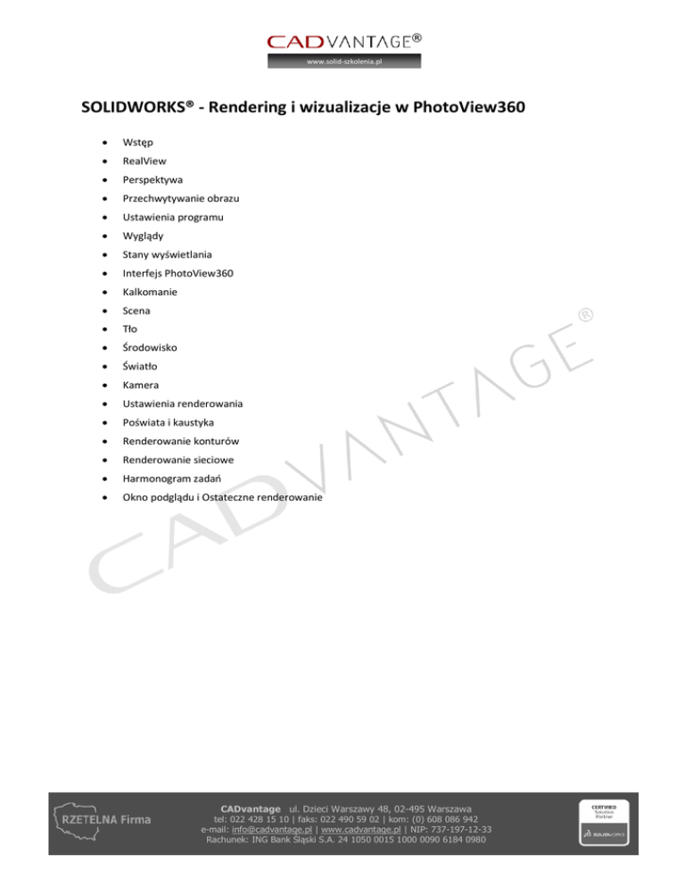 ® www.solid-szkolenia.pl SOLIDWORKS® - Rendering i wizualizacje w PhotoView360 Wstęp RealView Perspektywa Przechwytywanie obrazu Ustawienia programu Wyglądy Stany wyświetlania Interfejs PhotoView360 Kalkomanie Scena Tło Środowisko Światło Kamera Ustawienia renderowania Poświata i kaustyka Renderowanie konturów Renderowanie sieciowe Harmonogram zadań Okno podglądu i Ostateczne renderowanie CADvantage ul. Dzieci Warszawy 48, 02-495 Warszawa tel: 022 428 15 10 | faks: 022 490 59 02 | kom: (0) 608 086 942 e-mail: [email protected] | www.cadvantage.pl | NIP: 737-197-12-33 Rachunek: ING Bank Śląski S.A. 24 1050 0015 1000 0090 6184 0980