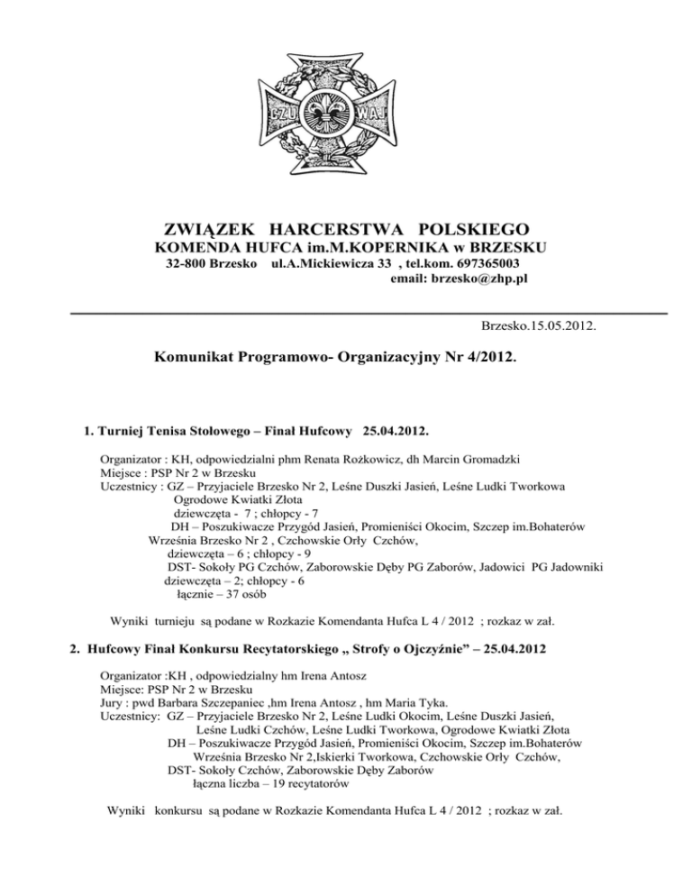 ZWIĄZEK HARCERSTWA POLSKIEGO KOMENDA HUFCA im.M.KOPERNIKA w BRZESKU 32-800 Brzesko ul.A.Mickiewicza 33 , tel.kom. 697365003 email: [email protected] __________________________________________________________________ Brzesko.15.05.2012. Komunikat Programowo- Organizacyjny Nr 4/2012. 1. Turniej Tenisa Stołowego – Finał Hufcowy 25.04.2012. Organizator : KH, odpowiedzialni phm Renata Rożkowicz, dh Marcin Gromadzki Miejsce : PSP Nr 2 w Brzesku Uczestnicy : GZ – Przyjaciele Brzesko Nr 2, Leśne Duszki Jasień, Leśne Ludki Tworkowa Ogrodowe Kwiatki Złota dziewczęta - 7 ; chłopcy - 7 DH – Poszukiwacze Przygód Jasień, Promieniści Okocim, Szczep im.Bohaterów Września Brzesko Nr 2 , Czchowskie Orły Czchów, dziewczęta – 6 ; chłopcy - 9 DST- Sokoły PG Czchów, Zaborowskie Dęby PG Zaborów, Jadowici PG Jadowniki dziewczęta – 2; chłopcy - 6 łącznie – 37 osób Wyniki turnieju są podane w Rozkazie Komendanta Hufca L 4 / 2012 ; rozkaz w zał. 2. Hufcowy Finał Konkursu Recytatorskiego ,, Strofy o Ojczyźnie” – 25.04.2012 Organizator :KH , odpowiedzialny hm Irena Antosz Miejsce: PSP Nr 2 w Brzesku Jury : pwd Barbara Szczepaniec ,hm Irena Antosz , hm Maria Tyka. Uczestnicy: GZ – Przyjaciele Brzesko Nr 2, Leśne Ludki Okocim, Leśne Duszki Jasień, Leśne Ludki Czchów, Leśne Ludki Tworkowa, Ogrodowe Kwiatki Złota DH – Poszukiwacze Przygód Jasień, Promieniści Okocim, Szczep im.Bohaterów Września Brzesko Nr 2,Iskierki Tworkowa, Czchowskie Orły Czchów, DST- Sokoły Czchów, Zaborowskie Dęby Zaborów łączna liczba – 19 recytatorów Wyniki konkursu są podane w Rozkazie Komendanta Hufca L 4 / 2012 ; rozkaz w zał. 3.Święto Flagi – 2Maja. Konkurs na Najdłuższą ,, Biało – Czerwoną Brzesko 2012’’ o Puchar Komendy Hufca Organizator : KH ZHP w Brzesku. Współorganizator : Stowarzyszenie ,,Brzeskie Porozumienie” Uczestnicy : GZ i DH z Okocimia, DH im.Starzyńskiego i DH im. Hubala z PSP Nr 2 Brzesko, DH z Mokrzysk , DST z PG w Jadownikach , V kl z PSP w Szczepanowie, zespół uczniów z PSP Nr 3 w Brzesku. Prezentacja flag : 2 maj , godz.14.30 ; Plac Kazimierza Wielkiego w Brzesku. Wyniki : I miejsce i Puchar KH Brzesko – 3 DST Jadowici z PG w Jadownikach; długość flagi – 38,40 m II miejsce – klasa V z PSP w Szczepanowie, III miejsce zespół uczniów z PSP w Brzesku. łączna długość wszystkich flag – ok.280m. Komenda Hufca gratuluje zwycięskim zespołom i serdecznie dziękuje : - Zarządowi i członkom Stowarzyszenia ,,Brzeskie Porozumienie’’ za współpracę w realizacji zadania - Dyrekcji , nauczycielom i uczniom PSP Nr 3 w Brzesku i PSP w Szczepanowie , oraz zuchom, harcerzom i instruktorom za udział w tym zadaniu. 4. Święto Narodowe - 3 Maja. Komenda Hufca serdecznie dziękuje : - pełniącym warty w Miejscach Pamięci Narodowej , składającym kwiaty, pocztom sztandarowym oraz wszystkim zuchom, harcerzom i instruktorom za uczestnictwo w uroczystościach patriotyczno – religijnych w dniu Święta Narodowego. 5. I Międzynarodowy Turniej Piłkarski Scout Cup w Krakowie 11- 13 maja. Hufiec Brzesko reprezentowała drużyna w następującym składzie : Tomasz Homa, Gabriel Kumorek, Krzysztof Kozdrój, Łukasz Strzelec, Adrian Michalczyk, Maciej Moszczak – DH Czchowskie Orły PSP Czchów Gabriel Szostak / kapitan / , Andrzej Pachut , Manuel Jarmołowicz, Rafał Pasionek / bramkarz / – 5DST Sokoły PG Czchów; hm Maria Motyka i mgr Ryszard Sikora – opiekunowie; Drużyna zdobyła III miejsce w swojej grupie wiekowej , brązowe medale i nagrody . KH składa gratulacje i podziękowania za udział w tym turnieju. 6. Zadania bieżące. - Harcerska Akademia – Biwak ; zakończenie szkolenia . Organizator : Komenda HA ; odpowiedzialny : hm Adam Zydroń Termin : 15.06 / przyjazd do Ośrodka w godz.15.30 – 17.00 / ,16.06 ,17.06 br. / wyjazd z Ośrodka ok.13.30./ Miejsce : Ośrodek Harcerski w Piaskach Drużkowie Odpłatność uczestników : 50 zł. Zgłoszenia / imienne / wraz z odpłatnościami do 12.06.br. - Wiosenny Rajd Kwiatów . Organizator: KH ; Uczestnicy : zuchy, harcerze i harcerze starsi Termin, miejsce - j.w. Odpłatność uczestników : 75 zł Zgłoszenia imienne wraz z odpłatnościami do 12.06.br. - Przegląd Piosenki Harcerskiej ,, Mokrzyska 2012 ’’ Organizator : Dyrekcja i DH Leśna Dziatwa PSP w Morzyskach Uczestnicy : zuchy, harcerze, harcerze starsi ; soliści , zespoły Termin : 30.05.2012 godz.10.00 Miejsce : PSP w Mokrzyskach. Zgłoszenia do 19.05.br.; dokładne informacje w regulaminie / zał. / - Galeria Instruktorów – składanie Kart Instruktorów – czerwiec 2012. - Rok Regionów –zgodnie z terminarzem GK ; dotyczy drużyn, które przystąpiły do realizacji tego zadania. - Akcja Letnia- Piaski Drużków – Biwakowe EURO 2012 ,,Hufcowy Biwak” Terminy: I turnus 9.07. – 14.07. ; uczestnicy : zuchy, harcerze ,dzieci i młodzież nie należąca do ZHP ze szkół Gminy Brzesko II turnus 16.07. – 21.07. ; uczestnicy –j.w. ze szkół Gmin Czchów i Szczurowa Planowana odpłatność za turnus : zuchy i harcerze / z opłaconymi składkami za I półrocze br./ - 150 zł. pozostali uczestnicy : 200 zł. Uwagi : 1).Odpłatność może ulec zmianie po uzyskaniu informacji o przyznanych dotacjach z Urzędów Gmin i Starostwa Powiatowego. 2). W części pism do Dyrekcji Szkół błędnie podano ustalenia dotyczące przydziału turnusów dla poszczególnych środowisk; Zgłoszenia : ilościowe do 7.07.br. imienne wraz z odpłatnościami do 15.06. - Spotkanie drużynowych - druga połowa maja; termin będzie podany później. 7. Informacja nt. opłacalności składek członkowskich w roku 2012. Środowiska opłacające składki na bieżąco: 3DST Jadowici PG Jadowniki , DH Leśna Dziatwa PSP Mokrzyska , GZ Leśne Ludki Czchów, DH Czchowskie Orły PSP Czchów, GZ Leśne Ludki i DH Iskierki z PSP Tworkowa, 4DST Zaborowskie Dęby PG Zaborów, GZ Leśne Duszki i DH Poszukiwacze Przygód z PSP J
