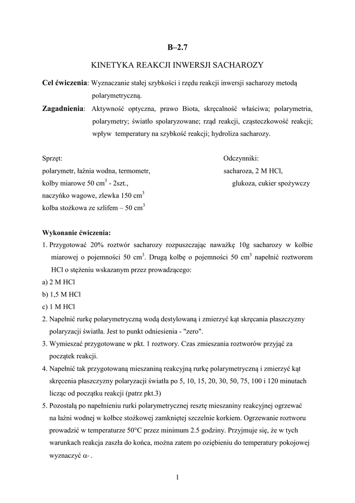 B–2.7 KINETYKA REAKCJI INWERSJI SACHAROZY Cel ćwiczenia: Wyznaczanie stałej szybkości i rzędu reakcji inwersji sacharozy metodą polarymetryczną. Zagadnienia: Aktywność optyczna, prawo Biota, skręcalność właściwa; polarymetria, polarymetry; światło spolaryzowane; rząd reakcji, cząsteczkowość reakcji; wpływ temperatury na szybkość reakcji; hydroliza sacharozy. Sprzęt: Odczynniki: polarymetr, łaźnia wodna, termometr, sacharoza, 2 M HCl, kolby miarowe 50 cm3 - 2szt., glukoza, cukier spożywczy naczyńko wagowe, zlewka 150 cm3 kolba stożkowa ze szlifem – 50 cm3 Wykonanie ćwiczenia: 1. Przygotować 20% roztwór sacharozy rozpuszczając naważkę 10g sacharozy w kolbie miarowej o pojemności 50 cm3. Drugą kolbę o pojemności 50 cm3 napełnić roztworem HCl o stężeniu wskazanym przez prowadzącego: a) 2 M HCl b) 1,5 M HCl c) 1 M HCl 2. Napełnić rurkę polarymetryczną wodą destylowaną i zmierzyć kąt skręcania płaszczyzny polaryzacji światła. Jest to punkt odniesienia - "zero". 3. Wymieszać przygotowane w pkt. 1 roztwory. Czas zmieszania roztworów przyjąć za początek reakcji. 4. Napełnić tak przygotowaną mieszaniną reakcyjną rurkę polarymetryczną i zmierzyć kąt skręcenia płaszczyzny polaryzacji światła po 5, 10, 15, 20, 30, 50, 75, 100 i 120 minutach licząc od początku reakcji (patrz pkt.3) 5. Pozostałą po napełnieniu rurki polarymetrycznej resztę mieszaniny reakcyjnej ogrzewać na łaźni wodnej w kolbce stożkowej zamkniętej szczelnie korkiem. Ogrzewanie roztworu prowadzić w temperaturze 50°C przez minimum 2.5 godziny. Przyjmuje się, że w tych warunkach reakcja zaszła do końca, można zatem po oziębieniu do temperatury pokojowej wyznaczyć α∞. 1 UWAGA! Nie wolno przegrzać mieszaniny reakcyjnej powyżej 70°C, gdyż wówczas jest możliwy rozkład cukru. 7. Wyznaczyć α0 mierząc kąt skręcenia płaszczyzny polaryzacji światła 10% roztworu sacharozy. UWAGA! Przy każdej zmianie roztworu należy starannie umyć rurkę polarymetryczną . Opracowanie wyników: 1. Wyznaczyć stalą szybkości badanej reakcji (metodą podstawienia i najmniejszych kwadratów). Obliczyć błąd stałej szybkości. 2. Wyznaczyć skręcalność właściwą sacharozy. Porównać uzyskany z wartością literaturową. 3. Oszacować zmianę stałej szybkości reakcji przy zmianie temperatury o 1 K, przyjmując iż energia aktywacji Ea = 20 kcal/mol. 4. Przeprowadzić analizę uzyskanych rezultatów. Literatura 1. L.Sobczyk, A.Kisza, K.Gatner, A.Koll, Eksperymentalna chemia fizyczna, PWN, Warszawa 1982. 2. L.Komorowski, A.Olszowski, Chemia Fizyczna, tom 4, Laboratorium Fizykochemiczne, PWN, Warszawa 2013. 3. J.Woźnicka, H.Piekarski, Ćwiczenia laboratoryjne z chemii fizycznej, Wydawnictwo Uniwersytetu Łódzkiego, Łódź 2007. 2