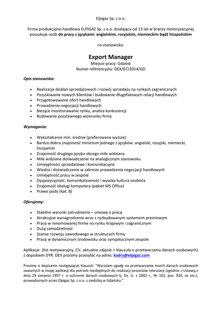 Elpigaz Sp. z o.o. Firma produkcyjno-handlowa ELPIGAZ Sp. z o.o. działająca od 15 lat w branży motoryzacyjnej poszukuje osób do pracy z językami: angielskim, rosyjskim, niemieckim bądź hiszpańskim na stanowisko: Export Manager Miejsce pracy: Gdańsk Numer referencyjny: DEX/07/2014/GD Opis stanowiska: Realizacja działań sprzedażowych i rozwój sprzedaży na rynkach zagranicznych Pozyskiwanie nowych klientów i budowanie długofalowych relacji handlowych Przygotowywanie ofert handlowych Prowadzenie negocjacji handlowych Bieżące monitorowanie rynku, analiza konkurencji Budowanie pozytywnego wizerunku firmy Wymagania: Wykształcenie min. średnie (preferowane wyższe) Bardzo dobra znajomość minimum jednego z języków: angielski, rosyjski, niemiecki, hiszpański Znajomość drugiego języka obcego mile widziana Mile widziane doświadczenie na analogicznym stanowisku Umiejętności sprzedażowe i komunikacyjne Wiedza i doświadczenie w zakresie prowadzenia negocjacji handlowych Umiejętność pracy w zespole Dyspozycyjność, komunikatywność i wysoka kultura osobista Znajomość obsługi komputera (pakiet MS Office) Prawo jazdy (kat. B) Oferujemy: Stabilne warunki zatrudnienia – umowę o pracę Atrakcyjne wynagrodzenie wraz z rozbudowanym systemem premiowym Pracę w renomowanej firmie na rynku krajowym i zagranicznym Dużą samodzielność Szanse rozwoju zawodowego w strukturach firmy Pracę w dynamicznym środowisku oraz sympatycznym zespole Aplikacje (list motywacyjny, CV, aktualne zdjęcie + klauzula o przetwarzaniu danych osobowych) z dopiskiem DYR. DEX prosimy przesyłać na adres: [email protected] Prosimy o dopisanie następującej klauzuli: "Wyrażam zgodę na przetwarzanie moich danych osobowych zawartych w mojej aplikacji dla potrzeb niezbędnych do realizacji procesów rekrutacji (zgodnie z Ustawą z dnia 29 sierpnia 1997 r. o ochronie danych osobowych tj. Dz. U. z 2002 r., Nr 101, poz. 926, ze zm.), prowadzonych przez Elpigaz Sp. z o.o. z siedzibą w Gdańsku."
