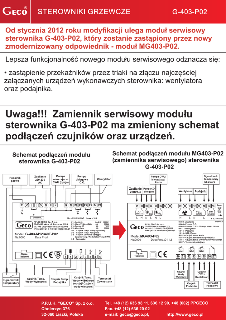 R STEROWNIKI GRZEWCZE G-403-P02 Od stycznia 2012 roku modyfikacji ulega modu³ serwisowy sterownika G-403-P02, który zostanie zast¹piony przez nowy zmodernizowany odpowiednik - modu³ MG403-P02. Lepsza funkcjonalnoœæ nowego modu³u serwisowego odznacza siê: • zast¹pienie przekaŸników przez triaki na z³¹czu najczêœciej za³¹czanych urz¹dzeñ wykonawczych sterownika: wentylatora oraz podajnika. Uwaga!!! Zamiennik serwisowy modu³u sterownika G-403-P02 ma zmieniony schemat pod³¹czeñ czujników oraz urz¹dzeñ. Schemat pod³¹czeñ modu³u MG403-P02 (zamiennika serwisowego) sterownika G-403-P02 Schemat pod³¹czeñ modu³u sterownika G-403-P02 Pompa mieszaj¹ca/ CWU (opcja) Zasilanie 220-230 AC Podajnik paliwa Pompa obiegowa C.O. Zasilanie Pompa CO 230VAC obiegowa P1 L L N N N N N P2 P2 P3 P3 P4 P4 Ogranicznik Temperatury lub zwora Pompa CWU/ Mieszaj¹ca/ Alarm Wentylator Wentylator Podajnik 01 02 03 04 05 06 09 11 12 14 15 16 STB/ Zwora 230V AC CONTROL Un = 220-230 VAC PPUH GECO Sp. Z o.o. 30-134 Kraków ul. Zarzecze 112A tel. +48 (12) 6369811 fax 6362002 www.geco.pl e-mail:[email protected] Model: G-403-M12340T-P02 Ns:0000 Data Prod.: B Z³¹cze Tasiemki Ogranicznik Temperatury Czujnik Temp. Wody Wylotowej L Imax = 10A P1 - Podajnik P2 - Alarm/P. Miesz/CWU P3 - Pompa CO P4 - Wentylator N 8A 2HP 1500W 4A 750W 4A 750W 4A 750W 1-1 2-2 3-3 Czujnik Temp. Wody Wylotowej Czujnik Temp. Podajnika Czujnik Zerwania Sprzêg³a/ Czujnik Temp. Wody Wlot./Temp.CWU 4-4 Termostat N L N L PPUH GECO Sp. z o.o. 32-060 Liszki, Cholerzyn 376 tel. +48 (12) 6369811 fax 6362002 www.geco.pl e-mail:[email protected] Model:MG403-P02 Ns:0000 Data Prod.:01-12 N L 1 Czujnik Temp. Podajnika 1 2 2 3 3 Czujnik Temp. Wody w Bojlerze (opcja)/ Czujnik wody wlotowej P.P.U.H. “GECO” Sp. z o.o. Cholerzyn 376 32-060 Liszki, Polska 4 4 Termostat Zewnêtrzny N L F 3,15A/250V Imax=5A 01-02 - Zasilanie 03-04 - Pompa C.O. 05-06 - Pompa C.W.U./Pompa miesz./Alarm 09-11 - Wentylator 12-14 - Podajnik 15-16 - STB /Zwora 50-51 - Czujnik temp. kot³a 52-53 - Czujnik temperatury podajnika 54-55 - Czujnik temp. CWU/Powrót/Kontaktron 56-57 - Termostat pokojowy NTC NTC Z³¹cze Tasiemki Bezp. NTC 50 51 52 53 54 55 56 57 Czujnik Wody Wylotowej Czujnik CWU/ Kontaktron Czujnik Podajnika Termostat Pokojowy Tel. +48 (12) 636 98 11, 636 12 90, +48 (602) PPGECO Fax. +48 (12) 636 20 02 e-mail: [email protected], http://www.geco.pl