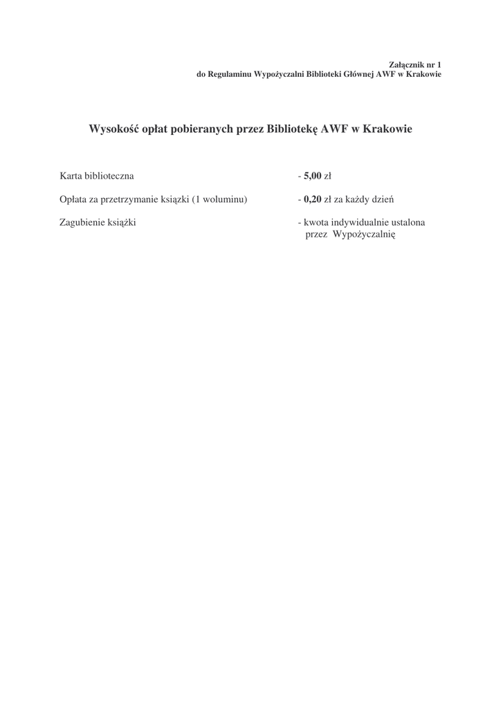 Zał cznik nr 1 do Regulaminu Wypo yczalni Biblioteki Głównej AWF w Krakowie Wysoko opłat pobieranych przez Bibliotek AWF w Krakowie Karta biblioteczna - 5,00 zł Opłata za przetrzymanie ksi zki (1 woluminu) - 0,20 zł za ka dy dzie Zagubienie ksi ki - kwota indywidualnie ustalona przez Wypo yczalni