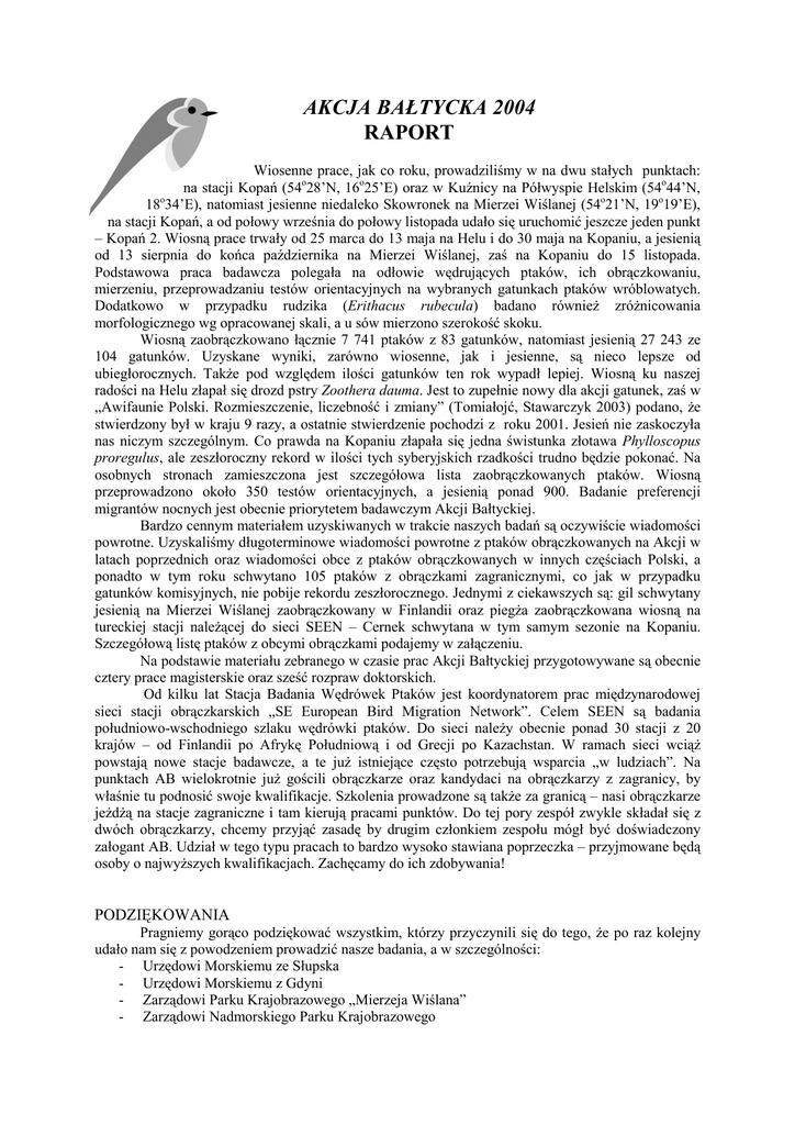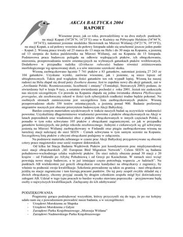 AKCJA BAŁTYCKA 2004 RAPORT Wiosenne prace, jak co roku, prowadziliśmy w na dwu stałych punktach: na stacji Kopań (54o28’N, 16o25’E) oraz w Kuźnicy na Półwyspie Helskim (54o44’N, o 18 34’E), natomiast jesienne niedaleko Skowronek na Mierzei Wiślanej (54o21’N, 19o19’E), na stacji Kopań, a od połowy września do połowy listopada udało się uruchomić jeszcze jeden punkt – Kopań 2. Wiosną prace trwały od 25 marca do 13 maja na Helu i do 30 maja na Kopaniu, a jesienią od 13 sierpnia do końca października na Mierzei Wiślanej, zaś na Kopaniu do 15 listopada. Podstawowa praca badawcza polegała na odłowie wędrujących ptaków, ich obrączkowaniu, mierzeniu, przeprowadzaniu testów orientacyjnych na wybranych gatunkach ptaków wróblowatych. Dodatkowo w przypadku rudzika (Erithacus rubecula) badano również zróżnicowania morfologicznego wg opracowanej skali, a u sów mierzono szerokość skoku. Wiosną zaobrączkowano łącznie 7 741 ptaków z 83 gatunków, natomiast jesienią 27 243 ze 104 gatunków. Uzyskane wyniki, zarówno wiosenne, jak i jesienne, są nieco lepsze od ubiegłorocznych. Także pod względem ilości gatunków ten rok wypadł lepiej. Wiosną ku naszej radości na Helu złapał się drozd pstry Zoothera dauma. Jest to zupełnie nowy dla akcji gatunek, zaś w „Awifaunie Polski. Rozmieszczenie, liczebność i zmiany” (Tomiałojć, Stawarczyk 2003) podano, że stwierdzony był w kraju 9 razy, a ostatnie stwierdzenie pochodzi z roku 2001. Jesień nie zaskoczyła nas niczym szczególnym. Co prawda na Kopaniu złapała się jedna świstunka złotawa Phylloscopus proregulus, ale zeszłoroczny rekord w ilości tych syberyjskich rzadkości trudno będzie pokonać. Na osobnych stronach zamieszczona jest szczegółowa lista zaobrączkowanych ptaków. Wiosną przeprowadzono około 350 testów orientacyjnych, a jesienią ponad 900. Badanie preferencji migrantów nocnych jest obecnie priorytetem badawczym Akcji Bałtyckiej. Bardzo cennym materiałem uzyskiwanych w trakcie naszych badań są oczywiście wiadomości powrotne. Uzyskaliśmy długoterminowe wiadomości powrotne z ptaków obrączkowanych na Akcji w latach poprzednich oraz wiadomości obce z ptaków obrączkowanych w innych częściach Polski, a ponadto w tym roku schwytano 105 ptaków z obrączkami zagranicznymi, co jak w przypadku gatunków komisyjnych, nie pobije rekordu zeszłorocznego. Jednymi z ciekawszych są: gil schwytany jesienią na Mierzei Wiślanej zaobrączkowany w Finlandii oraz piegża zaobrączkowana wiosną na tureckiej stacji należącej do sieci SEEN – Cernek schwytana w tym samym sezonie na Kopaniu. Szczegółową listę ptaków z obcymi obrączkami podajemy w załączeniu. Na podstawie materiału zebranego w czasie prac Akcji Bałtyckiej przygotowywane są obecnie cztery prace magisterskie oraz sześć rozpraw doktorskich. Od kilku lat Stacja Badania Wędrówek Ptaków jest koordynatorem prac międzynarodowej sieci stacji obrączkarskich „SE European Bird Migration Network”. Celem SEEN są badania południowo-wschodniego szlaku wędrówki ptaków. Do sieci należy obecnie ponad 30 stacji z 20 krajów – od Finlandii po Afrykę Południową i od Grecji po Kazachstan. W ramach sieci wciąż powstają nowe stacje badawcze, a te już istniejące często potrzebują wsparcia „w ludziach”. Na punktach AB wielokrotnie już gościli obrączkarze oraz kandydaci na obrączkarzy z zagranicy, by właśnie tu podnosić swoje kwalifikacje. Szkolenia prowadzone są także za granicą – nasi obrączkarze jeżdżą na stacje zagraniczne i tam kierują pracami punktów. Do tej pory zespół zwykle składał się z dwóch obrączkarzy, chcemy przyjąć zasadę by drugim członkiem zespołu mógł być doświadczony załogant AB. Udział w tego typu pracach to bardzo wysoko stawiana poprzeczka – przyjmowane będą osoby o najwyższych kwalifikacjach. Zachęcamy do ich zdobywania! PODZIĘKOWANIA Pragniemy gorąco podziękować wszystkim, którzy przyczynili się do tego, że po raz kolejny udało nam się z powodzeniem prowadzić nasze badania, a w szczególności: - Urzędowi Morskiemu ze Słupska - Urzędowi Morskiemu z Gdyni - Zarządowi Parku Krajobrazowego „Mierzeja Wiślana” - Zarządowi Nadmorskiego Parku Krajobrazowego - Pracownikom Nadleśnictwa Elbląg oraz Leśniczemu Leśnictwa Przebrno Strażnikowi Urzędu Morskiego w Kuźnicy na Helu Dyrekcji Ośrodka Wypoczynkowego w Skowronkach Pracownikom Szkoły Podstawowej w Kuźnicy na Helu Pracownikom Stacji Morskiej Instytutu Oceanografii Uniwersytetu Gdańskiego Panu Dariuszowi Korczyńskiemu z Darłówka Pani Agnieszce Miłosz z Kuźnicy na Helu Panu Olejniczakowi z Darłowa Panu Antoniemu Hołubowi, naszemu wielkanocnemu dobroczyńcy Patrykowi Stasiakowi za ogromną pomoc w zaopatrzeniu obu punktów w żywność na jesienne dni UCZESTNICY Podobnie, jak w latach poprzednich, na punktach Akcji gościliśmy ornitologów z krajów pracujących w ramach sieci SEEN. Wiosną 2003 roku na naszym obozie w Kuźnicy na Helu szkoliliśmy kolegów z Hiszpanii, natomiast jesienią gościł u nas Dimitar Nikolov Ragyov z Bułgarii. W roku 2004 w pracach punktów Akcji Bałtyckiej wzięło udział prawie 140 osób, a byli to: Karolina Adamska (BK jesień: 28 dni), Aleksandra Bartczak (BK jesień: 15 dni), Kacper Bartczak (BK wiosna: 6 dni; jesień: 32 dni), Szymon Bartczak (BK jesień: 8 dni), Marek Bebłot (HEL wiosna 5 dni), Marta Bielicka (BK wiosna: 11 dni), Joanna Bock (BK jesień: 13 dni), Maciej Boroń (BK wiosna: 9 dni; jesień: 6 dni), Magdalena Boroń (BK jesień: 6 dni), Marek Brachman (BK wiosna: 17 dni), Ewelina Bruhn (HEL wiosna: 4 dni), Anna Bunikowska (BK jesień: 20 dni), Jan Burdziej (HEL wiosna: 5 dni), Marta Bylicka (HEL wiosna: 7 dni; MW jesień: 9 dni), Justyna Capłap (MW jesień: 19 dni), Jacek Chruściel (MW jesień: 41 dni; BK jesień 2 dni), Joanna Cichocka (BK wiosna: 4 dni), Barbara Czarnek (HEL wiosn