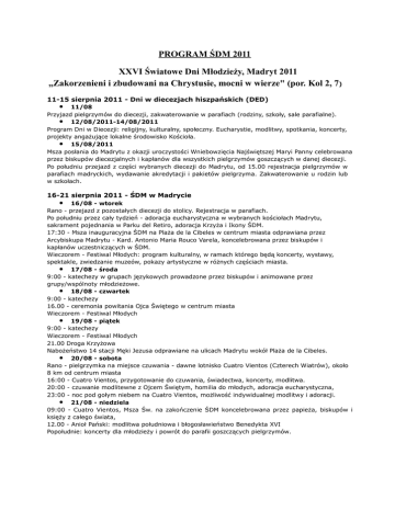 PROGRAM ŚDM 2011 XXVI Światowe Dni Młodzieży, Madryt 2011 „Zakorzenieni i zbudowani na Chrystusie, mocni w wierze" (por. Kol 2, 7) 11-15 sierpnia 2011 - Dni w diecezjach hiszpańskich (DED) • 11/08 Przyjazd pielgrzymów do diecezji, zakwaterowanie w parafiach (rodziny, szkoły, sale parafialne). • 12/08/2011-14/08/2011 Program Dni w Diecezji: religijny, kulturalny, społeczny. Eucharystie, modlitwy, spotkania, koncerty, projekty angażujące lokalne środowisko Kościoła. • 15/08/2011 Msza posłania do Madrytu z okazji uroczystości Wniebowzięcia Najświętszej Maryi Panny celebrowana przez biskupów diecezjalnych i kapłanów dla wszystkich pielgrzymów goszczących w danej diecezji. Po południu przejazd z części wybranych diecezji do Madrytu, od 15.00 rejestracja pielgrzymów w parafiach madryckich, wydawanie akredytacji i pakietów pielgrzyma. Zakwaterowanie u rodzin lub w szkołach. 16-21 sierpnia 2011 - ŚDM w Madrycie • 16/08 - wtorek Rano - przejazd z pozostałych diecezji do stolicy. Rejestracja w parafiach. Po południu przez cały tydzień - adoracja eucharystyczna w wybranych kościołach Madrytu, sakrament pojednania w Parku del Retiro, adoracja Krzyża i Ikony ŚDM. 17:30 - Msza inauguracyjna ŚDM na Plaża de la Cibeles w centrum miasta odprawiana przez Arcybiskupa Madrytu - Kard. Antonio Maria Rouco Varela, koncelebrowana przez biskupów i kapłanów uczestniczących w ŚDM. Wieczorem - Festiwal Młodych: program kulturalny, w ramach którego będą koncerty, wystawy, spektakle, zwiedzanie muzeów, pokazy artystyczne w różnych częściach miasta. • 17/08 - środa 9:00 - katechezy w grupach językowych prowadzone przez biskupów i animowane przez grupy/wspólnoty młodzieżowe. • 18/08 - czwartek 9:00 - katechezy 16.00 - ceremonia powitania Ojca Świętego w centrum miasta Wieczorem - Festiwal Młodych • 19/08 - piątek 9:00 - katechezy Wieczorem - Festiwal Młodych 21.00 Droga Krzyżowa Nabożeństwo 14 stacji Męki Jezusa odprawiane na ulicach Madrytu wokół Plaża de la Cibeles. • 20/08 - sobota Rano - pielgrzymka na miejsce czuwania - dawne lotnisko Cuatro Vientos (Czterech Wiatrów), około 8 km od centrum miasta 16:00 - Cuatro Vientos, przygotowanie do czuwania, świadectwa, koncerty, modlitwa. 20:00 - czuwanie modlitewne z Ojcem Świętym, homilia do młodych, adoracja eucharystyczna, 23:00 - noc pod gołym niebem na Cuatro Vientos, możliwość indywidualnej modlitwy i adoracji. • 21/08 - niedziela 09:00 - Cuatro Vientos, Msza Św. na zakończenie ŚDM koncelebrowana przez papieża, biskupów i księży z całego świata, 12.00 - Anioł Pański: modlitwa południowa i błogosławieństwo Benedykta XVI Popołudnie: koncerty dla młodzieży i powrót do parafii goszczących pielgrzymów.