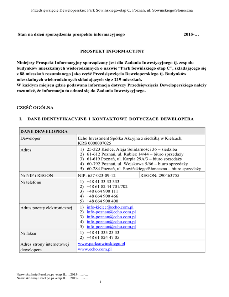 Przedsięwzięcie Deweloperskie: Park Sowińskiego-etap C, Poznań, ul. Sowińskiego/Słoneczna Stan na dzień sporządzenia prospektu informacyjnego 2015-… PROSPEKT INFORMACYJNY Niniejszy Prospekt Informacyjny sporządzany jest dla Zadania Inwestycyjnego tj. zespołu budynków mieszkalnych wielorodzinnych o nazwie “Park Sowińskiego etap C”, składającego się z 88 mieszkań rozumianego jako część Przedsięwzięcia Deweloperskiego tj. Budynków mieszkalnych wielorodzinnych składających się z 219 mieszkań. W każdym miejscu gdzie podawana informacja dotyczy Przedsięwzięcia Deweloperskiego należy rozumieć, że informacja ta odnosi się do Zadania Inwestycyjnego. CZĘŚĆ OGÓLNA I. DANE IDENTYFIKACYJNE I KONTAKTOWE DOTYCZĄCE DEWELOPERA DANE DEWELOPERA Deweloper Adres Nr NIP i REGON Nr telefonu Adres poczty elektronicznej Nr faksu Adres strony internetowej dewelopera Echo Investment Spółka Akcyjna z siedzibą w Kielcach, KRS 0000007025 1) 25-323 Kielce, Aleja Solidarności 36 – siedziba 2) 61-612 Poznań, ul. Rubież 14/44 – biuro sprzedaży 3) 61-619 Poznań, ul. Karpia 29A/3 – biuro sprzedaży 4) 60-792 Poznań, ul. Wojskowa 5/66 – biuro sprzedaży 5) 60-284 Poznań, ul. Sowińskiego/Słoneczna – biuro sprzedaży NIP: 657-023-09-12 REGON: 290463755 1) +48 41 33 33 333 2) +48 61 82 44 701/702 3) +48 664 900 111 4) +48 664 900 466 5) +48 664 900 400 1) [email protected] 2) [email protected] 3) [email protected] 4) [email protected] 5) [email protected] 1) +48 41 333 23 33 2) +48 61 824 47 05 www.parksowinskiego.pl www.echo.com.pl Nazwisko.Imię.Pesel.po.ps -etap II…..2015-…..-… Nazwisko.Imię.Pesel.po.ps -etap II…..2015-…..-… 1 Przedsięwzięcie Deweloperskie: Park Sowińskiego-etap C, Poznań, ul. Sowińskiego/Słoneczna II. DOŚWIADCZENIE DEWELOPERA HISTORIA I UDOKUMENTOWANE DOŚWIADCZENIE DEWELOPERA PRZYKŁAD UKOŃCZONEGO PRZEDSIĘWZIĘCIA DEWELOPERSKIEGO (należy wskazać (o ile istnieją) trzy ukończone przedsięwzięcia deweloperskie, w tym ostatnie) Adres Nad Wartą 61-854 Poznań, ul. Mostowa 19 Data rozpoczęcia 1999-02-15 Data wydania ostatecznego 2001-04-03 pozwolenia na użytkowanie PRZYKŁAD INNEGO UKOŃCZONEGO PRZEDSIĘWZIĘCIA DEWELOPERSKIEGO Adres Kasztanowa Aleja – etap II 60-792 Poznań, ul. Wojskowa 7 Data rozpoczęcia 2012-12-05 Data wydania ostatecznego 2014-05-20 pozwolenia na użytkowanie OSTATNIE UKOŃCZONE PRZEDSIĘWZIĘCIE DEWELOPERSKIE Adres GROTA 111 52-232 Wrocław, ul. Gen. Stefana Grota-Roweckiego 111, 113, 115, 117 Data rozpoczęcia 2014-01-13 Data wydania ostatecznego 2015-08-24 pozwolenia na użytkowanie Czy przeciwko deweloperowi prowadzono (lub prowadzi się) postępowania egzekucyjne na kwotę powyżej 100 000 zł Nie Nazwisko.Imię.Pesel.po.ps -etap II…..2015-…..-… Nazwisko.Imię.Pesel.po.ps -etap II…..2015-…..-… 2 Przedsięwzięcie Deweloperskie: Park Sowińskiego-etap C, Poznań, ul. Sowińskiego/Słoneczna III. INFORMACJE DOTYCZĄCE NIERUCHOMOŚCI I PRZEDSIĘWZIĘCIA DEWELOPERSKIEGO INFORMACJE DOTYCZĄCE GRUNTU Adres i nr działki ewiden- Województwo: wielkopolskie cyjnej Powiat: Miasto Poznań Województwo: wielkopolskie Powiat: Miasto Poznań Obręb: Nr 0039, Łazarz Położenie: ul. Słoneczna 26 Działka numer 28/5 o powierzchni 5.775 pięć tysięcy siedemset siedemdziesiąt pięć metrów kwadratowych (powstała na skutek podziału działki 28/4 o powierzchni 15.993 piętnaście tysięcy dziewięćset dziewięćdziesiąt trzy metry kwadratowe) Nr księgi wieczystej PO1P/00285187/9 Istniejące obciążenia hipo- Brak obciążeń i wniosków teczne nieruchomości lub wnioski o wpis w dziale czwartym księgi wieczystej W przypadku braku księgi Nie dotyczy wieczystej informacja o powierzchni działki i stanie prawnym nieruchomości Plan zagospodarowania przestrzennego dla sąsiadujących działek przeznaczenie w planie Nazwisko.Imię.Pesel.po.ps -etap II…..2015-…..-… Nazwisko.Imię.Pesel.po.ps -etap II…..2015-…..-… 3 działka nr 4/11, 4/26: 5MW – tereny zabudowy mieszkaniowej wielorodzinnej, z dopuszczeniem funkcji usługowych w parterach budynków mieszkalnych działka nr 4/27: 3ZP – tereny publicznej zieleni urządzonej: skwer miejski działka nr 4/12, 4/14, 4/16, 4/17, 4/19, 4/6, 13/53, 13/68: 2ZP – tereny publicznej zieleni urządzonej: park miejski działka nr 15/3: 2KD-L – tereny dróg publicznych działka nr 22/5: 3KD-L – tereny dróg publicznych działka nr 15/9: MN/U – teren zabudowy mieszkaniowousługowej działka nr 15/10: 2ZP/U – tereny zieleni towarzyszącej zabytkowym obiektom budowlanym Przedsięwzięcie Deweloperskie: Park Sowińskiego-etap C, Poznań, ul. Sowińskiego/Słoneczna działka nr 15/1: 2E – tereny obiektów elektroenergetycznych działka nr 9, 38/1: 1KD-L – tereny dróg publicznych działka nr 4/11, 4/26: 5MW – nie więcej niż 15 m od poziomu rzędnej 85,00 m npm. Pierzeja o wysokości zabudowy w przedziale 12-17 m od poziomu rzędnej 85,00 m npm. działka nr 4/27: 3ZP – nie ustala się działka nr 4/12, 4/14, 4/16, 4/17, 4/19, 4/6, 13/53, 13/68: 2ZP – nie ustala się działka nr 15/3: 2KD-L – nie ustala się działka nr 22/5: 3KD-L – nie ustala się działka nr 15/9: MN/U – nie większa niż 12 m od poziomu rzędnej 85,00 m npm działka nr 15/10: 2ZP/U – nie ustala się działka nr 15/1: 2E – z dopuszczeniem budowy i rozbudowy stacji transformatorowych do wysokości 2 m oraz linii kablowych działka nr 9, 38/1: 1KD-L – nie ustala się działka nr 4/11, 4/26: 5MW – 30% dopuszczalny procent działka nr 4/27: 3ZP – 0% zabudowy działki działka nr 4/12, 4/14, 4/16, 4/17, 4/19, 4/6, 13/53, 13/68: 2ZP – 0% działka nr 15/3: 2KD-L – 0% działka nr 22/5: 3KD-L – 0% działka nr 15/9: MN/U – 25% działka nr 15/10: 2ZP/U – 20% działka nr 15/1: 2E – 60% działka nr 9, 38/1: 1KD-L – 0% Informacje zawarte w pub- Miejscowe plany zagospodarowania przestrzennego (źródło: Miejska Pracownia Urbanistyczna w P