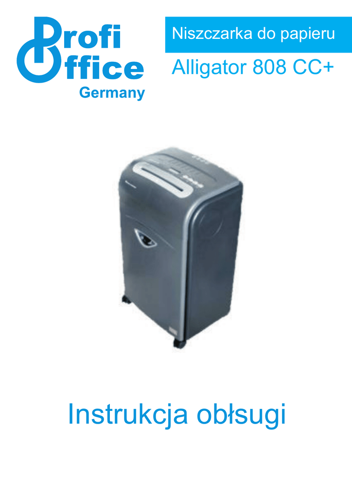 Niszczarka do papieru Alligator 808 CC+ Instrukcja obłsugi PL Drogi użytkowniku, dziękujemy za wybór urządzenia marki ProfiOffice. Jesteśmy pewni, że produkt ten spełni twoje wszelkie oczekiwania. Aby twoja praca z niszczarką Alligator 808 CC+ przebiegała bezpiecznie i bez problemów, szczegółowo zapoznaj się z instrukcją, którą trzymasz w ręku. ProfiOffice Germany Opis symboli znajdujących się na urządzeniu Ten symbol znajduje się przed wszystkimi innymi znakami ostrzegawczymi oraz informuje o potencjalnym niebezpieczeństwie uszkodzenia niszczarki bądź zranienia użytkownika Ten symbol ostrzega użytkownika, aby nie pochylał się nad urządzeniem. Grozi to wkręceniem włosów w mechanizm niszczarki. Ten symbol przypomina o zachowaniu bezpieczeństwa przy niszczeniu dokumentów. Nigdy nie należy wkładać palców oraz dłoni w szczelinę podajnika dokumentów. Ten symbol ostrzega o zachowaniu bezpieczeństwa podczas niszczenia dokumentów przez osoby noszące krawat. Ten symbol przypomina o potrzebie usunięcia zszywek oraz spinaczy z dokumentów przed ich zniszczeniem. W innym przypadku może nastąpić mechaniczne uszkodzenie urządzenia. Środki bezpieczeństwa podczas użytkowania 1. Trzymaj z dala od urządzenia wszelkie luźno wiszące części garderoby, krawaty, biżuterię. W szczególności należy uważać na długie włosy. 2. Wyłączaj urządzenie jeżeli nie jest ono używane przez dłuższy okres czasu. 3. Przed zniszczeniem, usuwaj wszelkie spinacze oraz zszywki z dokumentów. 4. Nie wolno wkładać palców oraz dłoni w szczelinę podajnika dokumentów, może to spowodować poważne obrażenia. 5. Nie przekraczaj zalecanej przez producenta liczby dokumentów niszczonych naraz. Nie próbuj niszczyć metalowych elementów, oraz takich które są pokryte klejem. 6. Proces ciągłego niszczenia nie powinien przekraczać 10 minut. Po takim czasie zaleca się wyłączenie urządzenia na 40 minut w celu ochłodzenia mechanizmu niszczarki. 7. Zawsze wyłączaj urządzenie podczas przesuwania, czyszczenia lub opróżniania pojemnika ze Ścinkami. 8. Regularnie opróżniaj kosz ze ścinkami. 9. 2 PL Instalacja 1. Sprawdź czy kosz na ścinki jest poprawnie włożony do urządzenia. 2. Podłącz wtyczkę do zasilania (220V). 3. Wciśnij przycisk Power. Dioda zasilania zapali się na zielono. A) Przycisk Power (1) znajduje się na górnym panelu niszczarki. Kiedy jest włączony, dioda zasilania (6) pali się na zielono. B) Aby ustawić godzinę wciśnij przycisk Setup (2). Wciśnij przycisk Rev (3) lub Fwd (4) aby zmienić godzinę. Potwierdzenie ustawień następuję po ponownym wciśnięciu przycisku Setup (2). Wyświetlacz (7) zacznie pokazywać godzinę oraz status drukarki. C) Włóż papier do podajnika dokumentów (5) w celu aktywowania sensora niszczącego. D) Niszczarka zacznie pracować i automatycznie pobierze dokument do niszczenia. E) Przyciski Rev (3) lub Fwd (4) służą również do zmiany orientacji pobierania dokumentów w przypadku pojawienia się zacięcia mechanizmu. Działanie niszczarki jest monitorowane za pomocą lampek statusu (6) lub wyświetlacza (7). Sensor podczerwieni (8): Urządzenie jest w trybie spoczynku dopóki użytkownik nie zbliży się na odległość 2 metrów do niszczarki. Po użyciu niszczarka ponownie przechodzi w stan spoczynku po upływie 30 sekund. Zacięcia papieru oraz przeciążenia mechanizmu: Urządzenie jest wyposażone w mechanizm cofania dokumentów oraz czujnik zapobiegający przeciążeniu. Normalny cykl pracy dla niszczarki Alligator 808 CC+ wynosi 10 min nieprzerwanej pracy, poczym urządzenie powinno zostać wyłączone na 40 min. Urządzenie zacznie cofać dokumenty lub automatycznie wyłączy się w następujących przypadkach: 3 War szawa,ul .Szyszkowa43 t el .( 22)4979979 i nf o@di gi t al sol ut i ons. pl www. di gi t al sol ut i ons. pl