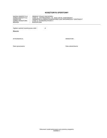 KOSZTORYS OFERTOWY NAZWA INWESTYCJI ADRES INWESTYCJI INWESTOR ADRES INWESTORA BRANśA : : : : : REMONT POŁACI DACHOWEJ ŁÓDŹ UL. PIOTRKOWSKA 115 - BUD.UśYTK. PARTEROWY ADMINSTRCJA NIERUCHOMOŚCIAMI ŁÓDŹ ŚRÓDMIEŚCIE "CENTRUM II" ŁÓDŹ UL.DOWBORCZYKÓW 5 BUDOWLANA Ogółem wartość kosztorysowa robót : zł Słownie: WYKONAWCA : INWESTOR : Data opracowania Data zatwierdzenia Dokument został opracowany przy pomocy programu NORMA 3 Piotrkowska 115 fryz-dach Lp. Podst 1 KNR 4-01 0735-04 2 KNR 4-01 0420-01 KSIĄśKA PRZEDMIARÓW Opis i wyliczenia j.m. Uzupełnienie tynków zwykłych cem.-wap. kat. III na kominach ponad dachem pła- m2 skim 2*(0.5+1)*1.1 m2 Wykonanie zastaw zabezpieczających na dachu m 9.5+6.5 m 3 KNR-W 4-01 Wykonanie zastaw zabezpieczających na gruncie od strony ulicy z taśmy ostrze- m 0434-01 gawczej 5*2+10 m 6 KNR 4-01 0535-06 7 KNR 4-01 0519-04 8 KNR 4-01 0519-05 m2 Rozebranie rynien z blachy nie nadającej się do uŜytku m 9.5 m Rozebranie rur spustowych z blachy nie nadającej się do uŜytku m 8 m Rozbiórka pokrycia z papy na dachach drewnianych - pierwsza warstwa m2 9.5*6.5 m2 Rozbiórka pokrycia z papy na dachach drewnianych - następna warstwa x 4 wars-m2 twy Krotność = 4 (96.05+3.65)*0.50 m2 9 KNR-W 7-12 Czyszczenie przez szczotkowanie ręczne do trzeciego stopnia czystości konstruk- m2 0101-01 cji pełnościennych (stan wyjściowy powierzchni B) (9.5+6.5+0.5+0.6)*0.5 m2 10 KNR-W 7-12 Odtłuszczanie konstrukcji pełnościennych + pas rynnowy i ogniomur 0105-01 8.55 m2 12 KNR-W 7-12 Malowanie pędzlem farbami nawierzchniowymi i emaliami epoksydowymi rurocią- m2 0211-05 gów o śr.zewn.58-219 mm 3.14*0.15*2 m2 Izolacje cieplne i przeciwdźwiękowe z wełny mineralnej poziome z płyt układanych na sucho - jedna warstwa 9.5*6.5 14 KNR-W 2-02 Pokrycie dachów papą termozgrzewalną dwuwarstwowe 0504-02 9.8*6.9 m2 m2 m 9.5 m 16.000 20.000 RAZEM 20.000 4.750 RAZEM 4.750 9.500 RAZEM 9.500 8.000 RAZEM 8.000 61.750 RAZEM 61.750 49.850 RAZEM 49.850 8.550 RAZEM 8.550 8.550 RAZEM 8.550 8.550 RAZEM 8.550 0.942 RAZEM 0.942 61.750 RAZEM 61.750 67.620 RAZEM 67.620 7.028 RAZEM 7.028 9.500 RAZEM 9.500 1.000 RAZEM 1.000 8.000 RAZEM 8.000 3.471 RAZEM 3.471 szt. szt. Rury spustowe okrągłe o śr.15cm - z blachy ocynkowanej m 8 m 19 KNR-W 2-02 ZałoŜenie pasów usztywniających o szerokości 0.2 m - z blachy ocynkowanej 0535-04 2*(0.5+1)+3.14*0.15 -2- Norma 3.28 Licencja: 15311 dla AN "CEntrum II" 16.000 RAZEM m2 Rynny dachowe półokrągłe o śr. 18 cm - z blachy ocynkowanej 17 KNR-W 2-02 Zbiorniczki przy rynnach z blachy ocynkowanej - montaŜ z gotowych elementów 0522-05 1 18 KNR 2-02 0510-04 3.300 m2 15 KNR-W 2-02 Pokrycie dachów papą termozgrzewalną - obróbki z papy nawierzchniowej - (Ko- m2 0504-03 miny) + (Pas przyścienny) (6.5+9.5+0.5+0.6+3.14*0.15)*0.4 m2 16 KNR 2-02 0508-05 3.300 RAZEM m2 11 KNR-W 7-12 Malowanie pędzlem farbami nawierzchniowymi i emaliami epoksydowymi konstru- m2 0211-01 kcji pełnościennych 8.55 m2 13 KNR 2-02 0613-03 Razem m2 4 KNR-W 4-01 Wykonanie daszków zabezpieczających 0434-04 9.5*0.5 5 KNR 4-01 0535-04 Poszcz m m Piotrkowska 115 fryz-dach Lp. Podst 20 KNR 2-02 0617-06 21 KNR 4-01 0108-09 KSIĄśKA PRZEDMIARÓW Opis i wyliczenia j.m. Izolacje szczelin dylatacyjnych konstrukcyjnych poziomych kitem (łączenie listwy m dociskowej z papą i murem) 3.47 m 23 Razem 3.470 RAZEM 3.470 2.000 RAZEM 2.000 2.000 RAZEM 2.000 1.600 RAZEM 1.600 Wywiezienie gruzu spryzmowanego samochodami skrzyniowymi na odl.do 1 km m3 m3 2 22 KNR 4-01 0108-10 Poszcz Wywiezienie gruzu spryzmowanego samochodami skrzyniowymi - za kaŜdy nast. m3 1 km Krotność = 14 2 m3 Utylizacja papy t. 1.6 t. kalk. własna -3- Norma 3.28 Licencja: 15311 dla AN "CEntrum II" Piotrkowska 115 fryz-dach Lp. Podstawa 1 KNR 4-01 0735-04 1* 2* 3* 4* 5* 6* 7* 8* 2 KNR 4-01 0420-01 1* 2* 3* 4* 3 KNR-W 4-01 0434-01 1* 2* 3* 4 KNR-W 4-01 0434-04 1* 2* 3* 4* 5* Opis jm Uzupełnienie tynków zwykłych cem.-wap. kat. III na kominach ponad dachem płaskim obmiar = 2*(0.5+1)*1.1 = 3.300m2 -- R -robocizna' 1.7r-g/m2 -- M -cement portlandzki z dodatkami 25 0.0052t/m2 ciasto wapienne (wapno gaszone) 0.0048m3/m2 piasek do zapraw 0.0266m3/m2 Deski igl.obrzyn.wymiar.gr.28-45mm,kl.III 0.0176m3/m2 materiały pomocnicze 1.5% m2 r-g 5.6100 t 0.0172 m3 0.0158 m3 0.0878 m3 0.0581 % 1.5000 -- S -wyciąg jednomasztowy z napędem elektrycznym m-g 0,5 t 0.04m-g/m2 betoniarka wolnospadowa elektryczna m-g 0.04m-g/m2 Razem koszty bezpośrednie: Razem z narzutami: Ceny jednostkowe Wykonanie zastaw zabezpieczających na dachu m obmiar = 9.5+6.5 = 16.000m -- R -robocizna' 0.23r-g/m -- M -deski iglaste wymiarowe gr. 19-25 mm kl.III 0.003m3/m gwoździe budowlane okrągłe gołe 0.1kg/m materiały pomocnicze 2% Razem koszty bezpośrednie: Razem z narzutami: Ceny jednostkowe Wykonanie zastaw zabezpieczających na gruncie od strony ulicy z taśmy ostrzegawczej obmiar = 5*2+10 = 20.000m -- R -robocizna' 0.23r-g/m -4- Norma 3.28 Licencja: 15311 dla AN "CEntrum II" 0.1320 3.6800 m3 0.0480 kg 1.6000 % 2.0000 m -- M -taśma ostrzegawcza m 1m/m materiały pomocnicze % 2% Razem koszty bezpośrednie: Razem z narzutami: Ceny jednostkowe Wykonanie daszków zabezpieczających m2 obmiar = 9.5*0.5 = 4.750m2 -- M -Deski igl.obrzyn.wymiar.gr.19-25mm,kl.II 0.003m3/m2 Drewno na stemple okrągłe korowane 0.001m3/m2 gwoździe budowlane okrągłe gołe 0.3kg/m2 materiały pomocnicze 0.1320 r-g r-g -- R -robocizna' 0.97r-g/m2 Nakłady 4.6000 20.0000 2.0000 r-g 4.6075 m3 0.0143 m3 0.0048 kg 1.4250 % 2.0000 Koszt jedn. R M S Piotrkowska 115 fryz-dach Lp. Podstawa Opis jm Nakłady 2% 5 KNR 4-01 0535-04 1* 6 KNR 4-01 0535-06 1* 7 KNR 4-01 0519-04 1* 8 KNR 4-01 0519-05 1* 9 KNR-W 7-12 0101-01 1* 2* 10 KNR-W 7-12 0105-01 1* 2* 3* Razem koszty bezpośrednie: Razem z narzutami: Ceny jednostkowe Rozebranie rynien z blachy nie nadającej się do m uŜytku obmiar = 9.5m -- R -robocizna' r-g 0.15r-g/m Razem koszty bezpośrednie: Razem z narz