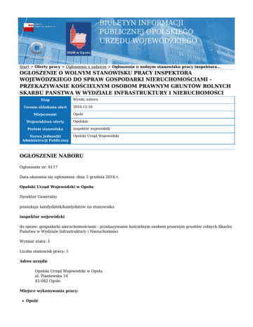 BIULETYN INFORMACJI PUBLICZNEJ OPOLSKIEGO URZĘDU WOJEWÓDZKIEGO Start > Oferty pracy > Ogłoszenia o naborze > Ogłoszenie o wolnym stanowisku pracy inspektora... OGŁOSZENIE O WOLNYM STANOWISKU PRACY INSPEKTORA WOJEWÓDZKIEGO DO SPRAW GOSPODARKI NIERUCHOMOŚCIAMI PRZEKAZYWANIE KOŚCIELNYM OSOBOM PRAWNYM GRUNTÓW ROLNYCH SKARBU PAŃSTWA W WYDZIALE INFRASTRUKTURY I NIERUCHOMOŚCI Etap Termin składania ofert Miejscowość Wyniki naboru 2016-12-16 Opole Województwo oferty Opolskie Poziom stanowiska inspektor wojewódzki Nazwa Jednostki Administracji Publicznej Opolski Urząd Wojewódzki OGŁOSZENIE NABORU Ogłoszenie nr: 6117 Data ukazania się ogłoszenia: dnia 5 grudnia 2016 r. Opolski Urząd Wojewódzki w Opolu Dyrektor Generalny poszukuje kandydatek/kandydatów na stanowisko: inspektor wojewódzki do spraw: gospodarki nieruchomościami - przekazywanie kościelnym osobom prawnym gruntów rolnych Skarbu Państwa w Wydziale Infrastruktury i Nieruchomości Wymiar etatu: 1 Liczba stanowisk pracy: 1 Adres urzędu Opolski Urząd Wojewódzki w Opolu ul. Piastowska 14 45-082 Opole Miejsce wykonywania pracy: Opole Warunki pracy Praca poza i w siedzibie Urzędu. Przeprowadzanie kontroli w innych jednostkach. Częste kontakty z klientem zewnętrznym. Narzędzia pracy: standardowy zestaw komputerowy. Warunki architektoniczne budynku Urzędu: drzwi odpowiedniej szerokości, winda, toalety i podnośnik dostosowane dla osób niepełnosprawnych. Zakres zadań Przygotowywanie decyzji o nieodpłatnym przekazaniu gruntów rolnych Skarbu Państwa na własność kościelnych osób prawnych; Przygotowywanie decyzji II instancji w sprawach określonych w ustawie o gospodarce nieruchomościami oraz w ustawie o przekształceniu prawa użytkowania wieczystego w prawo własności nieruchomości; Obsługa klientów udzielając w ramach prowadzonych postępowań należytych i wyczerpujących informacji, wskazówek, informacji w sprawach dotyczących gospodarki nieruchomościami, a także informując o konieczności podjęcia określonych działań celem osiągnięcia zamierzonego przez nich celu; Przygotowywanie decyzji o stwierdzeniu nabycia przez Skarb Państwa lub jednostki samorządu terytorialnego własności nieruchomości stanowiących własność osób fizycznych lub prawnych, a zajętych pod drogi publiczne; Przygotowywanie decyzji II instancji w sprawach związanych z ustalaniem odszkodowania według zasad i trybu określonych w przepisach o odszkodowaniach za wywłaszczone nieruchomości; Przygotowywanie rozstrzygnięć administracyjnych organu wyższego stopnia w przedmiocie zażalenia na bezczynność lub na przewlekłe prowadzenie postępowania przez starostę; Wymagania niezbędne Wykształcenie: wyższe doświadczenie zawodowe: 1 rok w obszarze administracji publicznej lub w obszarze związanym z gospodarowaniem nieruchomościami znajomość ustawy z dnia 17 maja 1989 r. o stosunku Państwa do Kościoła Katolickiego w Rzeczypospolitej Polskiej; znajomość ustawy z dnia 13 października 1998 r. Przepisy wprowadzające ustawy reformujące administrację publiczną; znajomość ustawy z dnia 21 marca 1985 r. o drogach publicznych; znajomość ustawy z dnia 21 sierpnia 1997 r. o gospodarce nieruchomościami i przepisów wykonawczych do tej ustawy; znajomość ustawy z dnia 29 lipca 2005 r. o przekształceniu prawa użytkowania wieczystego w prawo własności; znajomość ustawy z dnia 14 czerwca 1960 r. Kodeks postępowania administracyjnego; znajomość ustawy z dnia 21 listopada 2008 r. o służbie cywilnej; znajomość ustawy z dnia 23 stycznia 2009 r. o wojewodzie i administracji rządowej w województwie; umiejętność stosowania prawa w praktyce; umiejętność analitycznego myślenia; umiejętność rozwiązywania problemów i działania w sytuacjach nieprzewidywalnych; otwarty stosunek do klienta oraz umiejętność przekazywania informacji; umiejętność korzystania z urządzeń biurowych oraz oprogramowania komputerowego; umiejętność pracy w zespole Posiadanie obywatelstwa polskiego Korzystanie z pełni praw publicznych Nieskazanie prawomocnym wyrokiem za umyślne przestępstwo lub umyśle przestępstwo skarbowe Dokumenty i oświadczenia niezbędne Życiorys/CV i list motywacyjny Kopie dokumentów potwierdzających spełnienie wymagania niezbędnego w zakresie wykształcenia Kopie dokumentów potwierdzających spełnienie wymagania niezbędnego w zakresie doświadczenia zawodowego / stażu pracy Oświadczenie o posiadaniu obywatelstwa polskiego albo kopia dokumentu potwierdzającego posiadanie polskiego obywatelstwa Oświadczenie o wyrażeniu zgody na przetwarzanie danych osobowych do celów naboru Oświadczenie o korzystaniu z pełni praw publicznych Oświadczenie o nieskazaniu prawomocnym wyrokiem za umyślne przestępstwo lub umyślne przestępstwo skarbowe Dokumenty i oświadczenia dodatkowe kopia dokumentu potwierdzającego niepełnosprawność - w przypadku kandydatek/kandydatów, zamierzających skorzystać z pierwszeństwa w zatrudnieniu w przypadku, gdy znajdą się w gronie najlepszych kandydatek/kandydatów Terminy i miejsce składania dokumentów Dokumenty należy złożyć do:16 grudnia 2016 r. Decyduje data: stempla pocztowego / osobistego dostarczenia oferty do urzędu Miejsce składania dokumentów: Opolski Urząd Wojewódzki Sekretariat Dyrektora Generalnego pok. 251 Piastowska 14 45-082 Opole z dopiskiem "oferta pracy - nr ogłoszenia ...." Inne informacje: W miesiącu poprzedzającym datę upublicznienia ogłoszenia wskaźnik zatrudnienia osób niepełnosprawnych w urzędzie, w rozumieniu przepisów o rehabilitacji zawodowej i społecznej oraz zatrudnianiu osób niepełnosprawnych, nie wynosi co najmniej 6%. Lista kandydatów/kandydatek zakwalifikowanych do kolejnego etapu postępowania kwalifikacyjnego zostanie opublikowana na stronie www.bipouw.e-wojewoda.pl w zakładce: oferty pracy - ogłoszenia o naborze i na tablicy ogłoszeń w gmachu OUW (II piętro). Urząd