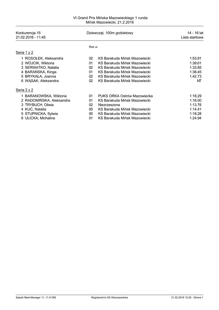 VI Grand Prix Mińska Mazowieckiego 1 runda Mińsk Mazowiecki, 21.2.2016 Konkurencja 15 21.02.2016 - 11:45 Dziewcząt, 100m grzbietowy 14 - 16 lat Lista startowa Rok ur. Seria 1 z 2 1 2 3 4 5 6 ROSOŁEK, Aleksandra WÓJCIK, Wiktoria SERWATKO, Natalia BARAŃSKA, Kinga BRYKAŁA, Joanna WĄSAK, Aleksandra 02 01 02 01 02 02 KS Barakuda Mińsk Mazowiecki KS Barakuda Mińsk Mazowiecki KS Barakuda Mińsk Mazowiecki KS Barakuda Mińsk Mazowiecki KS Barakuda Mińsk Mazowiecki KS Barakuda Mińsk Mazowiecki 1:53.91 1:39.61 1:33.85 1:38.45 1:42.73 NT 01 01 02 00 00 01 PUKS ORKA Ostrów Mazowiecka KS Barakuda Mińsk Mazowiecki Niezrzeszona KS Barakuda Mińsk Mazowiecki KS Barakuda Mińsk Mazowiecki KS Barakuda Mińsk Mazowiecki 1:18.29 1:16.00 1:13.76 1:14.41 1:18.28 1:24.94 Seria 2 z 2 1 2 3 4 5 6 BARANOWSKA, Wiktoria RADOMIŃSKA, Aleksandra TRYBUCH, Oliwia KUĆ, Natalia STUPNICKA, Sylwia ULICKA, Michalina Splash Meet Manager 11, 11.41395 Registered to KS Warszawianka 21.02.2016 12:26 - Strona 1