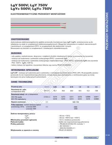 PRZEWODY MONTA¯OWE LgY 500V; LgY 750V LgYc 500V; LgYc 750V ELEKTROENERGETYCZNE PRZEWODY MONTA¯OWE ZASTOSOWANIE ® Jedno¿y³owe elektroenergetyczne giêtkie przewody monta¿owe typu LgY i LgYc przeznaczone s¹ do uk³adania na sta³e w urz¹dzeniach elektroenergetycznych. Mog¹ byæ stosowane w szafach sterowniczych i kontrolnych, w urz¹dzeniach RTV, w urz¹dzeniach dla elektroniki i innych. Stosowane s¹ równie¿ w urz¹dzeniach i instalacjach oœwietleniowych. BUDOWA - ¿y³y giêtkie, wielodrutowe, skrêcone z miêkkich drutów miedzianych (druty ocynowane na ¿yczenie), - izolacja ¿y³ wykonana z polwinitu izolacyjnego (PVC) - przewody LgY, - izolacja ¿y³ wykonana z polwinitu izolacyjnego ciep³oodpornego (PVC 90°C) - przewody LgYc (na ¿yczenie PVC 105°C - LgYc 105°C), - kolory izolacji ¿y³ zgodnie z ¿yczeniem klienta wg normy PN-87/E-90050. WYKONANIA SPECJALNE LgY-LSF - izolacja ¿y³ wykonana jest z polwinitu o zmniejszonej emisji dymu (PVC LSF). W przypadku po¿aru przewody te nie rozprzestrzeniaj¹ p³omienia, emisja dymu jest zmniejszona, a emitowane gazy s¹ mniej korozyjne ni¿ przy tradycyjnych polwinitach. DANE TECHNICZNE [mm ] 0,35 0,5 0,75 1,0 1,5 2,5 [W/km] 55,7 39,0 26,0 19,5 13,3 7,98 70oC- PVC zwyk³y 90oC- PVC ciep³oodporny [MWkm] 0,014 0,016 0,012 0,015 0,011 0,013 0,010 0,012 0,0085 0,010 0,0071 0,0089 Napiêcie znamionowe [V] 500 i 750 Próba napiêciowa - wartoœæ skuteczna napiêcia przemiennego, 50 Hz: - przewody 500V - przewody 750V [V] 2000 2500 Przekrój ¿y³y Rezystancja ¿y³ - maks. (w temperaturze 20oC) Rezystancja izolacji - min. w temperaturze: Zakres temperatury pracy: - LgY - LgYc Minimalny promieñ zginania Palnoœæ kabla Próby palnoœci : -30 do +70°C : -30 do +900C lub +105°C : 12,5 x œrednica przewodu : kable nie rozprzestrzeniaj¹ p³omienia : - PN-89/E-04160/55 metoda 1 : - IEC 60332-1 : - DIN EN 50265-2-1 : PN-87/E-90054 Wykonanie w oparciu o normy 07-05 FABRYKA KABLI -11- ® WYMIARY I MASA LgY 500V Nr wyrobu Przekrój ¿y³y 3.3.050 3.3.051 3.3.052 3.3.053 3.3.054 3.3.055 [mm2] 0,35 0,50 0,75 1,00 1,50 2,50 Œrednica zewnêtrzna przewodu, wartoœæ orientacyjna [mm] 2,00 2,14 2,40 2,54 2,80 3,20 Indeks miedziowy Masa przewodu, wartoœæ orientacyjna [kg/km] 3,5 4,9 7,3 9,8 14,7 24,1 [kg/km] 7,0 9,0 12,0 14,5 20,0 30,0 Indeks miedziowy Masa przewodu, wartoœæ orientacyjna LgY 750V Nr wyrobu Przekrój ¿y³y 3.3.060 3.3.061 3.3.062 3.3.063 3.3.064 3.3.065 [mm2] 0,35 0,50 0,75 1,00 1,50 2,50 Œrednica zewnêtrzna przewodu, wartoœæ orientacyjna [mm] 2,40 2,54 2,80 2,94 3,20 3,60 [kg/km] 3,5 4,9 7,3 9,8 14,7 24,1 ® PRZEWODY MONTA¯OWE LgY 500V; LgY 750V LgYc 500V; LgYc 750V [kg/km] 9,0 11,0 14,1 17,0 22,4 32,6 LgYc 500V Nr wyrobu Przekrój ¿y³y 3.3.080 3.3.081 3.3.082 3.3.083 3.3.084 3.3.085 [mm2] 0,35 0,50 0,75 1,00 1,50 2,50 Œrednica zewnêtrzna przewodu, wartoœæ orientacyjna [mm] 2,00 2,14 2,40 2,54 2,80 3,20 Indeks miedziowy Masa przewodu, wartoœæ orientacyjna [kg/km] 3,5 4,9 7,3 9,8 14,7 24,1 [kg/km] 7,0 9,0 12,0 14,5 20,0 30,0 Indeks miedziowy Masa przewodu, wartoœæ orientacyjna [kg/km] 3,5 4,9 7,3 9,8 14,7 24,1 [kg/km] 9,0 11,0 14,1 17,0 22,4 32,6 LgYc 750V Nr wyrobu Przekrój ¿y³y 3.3.086 3.3.087 3.3.088 3.3.089 3.3.090 3.3.091 [mm2] 0,35 0,50 0,75 1,00 1,50 2,50 Œrednica zewnêtrzna przewodu, wartoœæ orientacyjna [mm] 2,40 2,54 2,80 2,94 3,20 3,60 Na zamówienie klienta wykonujemy przewody o innych przekrojach ¿y³. 07-05 ® FABRYKA KABLI -12-