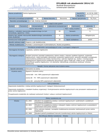 SYLABUS rok akademicki 2014/15 Wydział Ekonomiczny Uniwersytet Gdański Nazwa przedmiotu Centra logistyczne Jednostka prowadząca przedmiot Nazwisko prowadzącego KL Nazwa kierunku Ekonomia Kod ECTS 14.3.E.SL.2305 Pkt.ECTS 1 Nazwa specjalności TiL;TiL4; dr hab. Andrzej Jezierski Forma zajęć/Liczba godzin Wykład 0 Ćwiczenia 15 Konwersatoria 0 Laboratoria komputerowe Forma aktywności Godziny z udziałem nauczyciela akademickiego (w tym konsultacje, egzaminy i inne): Seminaria 0 Lektoraty Rok i rodzaj studiów: 1 SMSU, 25 Semestr: 2, 0 Status przedmiotu: Obligatoryjny 25 Język wykładowy: polski Godziny bez udziału nauczyciela akademickiego (samodzielna praca studenta): Sumaryczna liczba godzin: 0 0 Sposób realizacji zajęć Zajęcia w sali dydaktycznej. Metody dydaktyczne Wykłady z prezentacjami multimedialnymi, Studia przypadków, Określenie przedmiotów wprowadzających wraz z wymogami wstępnymi Wymagania formalne Logistyka, systemy logistyczne Wymagania wstepne Student powinien posiadać podstawowy zakres wiedzy z obszaru podstaw logistyki, systemów logistycznych, relacji pomiędzy elementami systemów logistycznych, powinien posiadać umiejętności wykorzystania podstawowej wiedzy teoretycznej z zakresu logistyki np. analizy i rozwiązywania podstawowych logistycznych problemów decyzyjnych natury trade off i make or buy, prawidłowo identyfikuje systemy logistyczne i ich elementy, identyfikuje, prawidłowo analizuje i procesy logistyczne, Sposób i forma zaliczenia oraz kryteria oceny Sposób zaliczenia Kryteria oceny Zaliczenie na ocenę Egzamin /kryteria oceny: ocena bdb - min. 90% poprawnych odpowiedzi ocena db - 70 - 90% poprawnych odpowiedzi ocena dst - powyżej 60% poprawnych odpowiedzi Cele przedmiotu Zapoznanie studentów z istotą centrów logistycznych i kategorii bliskoznacznych Zapoznanie studentów z zasadami budowy organizacji i funkcjonowania centrów logistycznych oraz procesami realizowanymi przez centra logistyczne Przygotowanie studentów do realizacji wybranych funkcji i usług w centrach logistycznych Efekty kształcenia się Wiedza E2_W02 Student ma pogłębioną wiedzę o centrach logistycznych i podmiotach o podobnym charakterze działalności E2_W03 Student ma pogłębioną wiedzę o relacjach między centrum logistycznym a pozostałymi podmiotami łańcuchów dostaw E2_W06 Zna wybrane metody i narzędzia modelowania procesów realizowanych przez centra logistyczne E2_W08 Student potrafi przedstawić kierunki transformacji cetrów logistycznych w Polsce Weryfikacja efektów kształcenia - Wiedza Wszystkie prawa zastrzeżone (c) Andrzej Jezierski 1/3 SYLABUS rok akademicki 2014/15 Wydział Ekonomiczny Uniwersytet Gdański Efekty E2_W02 X X E2_W03 X E2_W06 X E2_W08 Umiejętności X E2_U01 Student potrafi wyjaśnić i opisać istotę cntrów logistycznych E2_U02 Klasyfikuje CL według różnych kryteriów klasyfikacyjnych E2_U03 Potrafi modelować strukturę CL i procesów realizowanych przez CL Weryfikacja efektów kształcenia - Umiejętności Efekty E2_U01 X E2_U02 X E2_U03 Kompetencje X X E2_K01 Student nabywa społeczne kompetencje pracy w zespole, E2_K02 Rozwija swoje umiejętności krytycznej analizy badanej i ocnianej rzywistości gospodarczej z punktu widzenia miejsca i roli centrów logistycznych E2_K03 Doceia zalety pracy grupowej ale także umie pracować samodzielnie E2_K06 Zachowuje krytycyzm w wyrażaniu opinii i dąży do uzupełniania nabytej wiedzy i umiejętności w zakresie funkcjonowania CL Weryfikacja efektów kształcenia - Kompetencje Efekty E2_K01 E2_K02 X X E2_K03 X E2_K06 X X X Treści programowe 1. Definicje i istota centrów logistycznych: 2. Rola i zadania centrów logistycznych: Uporządkowaniedziałalności gospodarczej i lepsze możliwości kształtowania ładu przestrzennego, rozwój działalności gospodarczej wokół centrów logistycznych i napływ inwestycji, rozwój regionalny, rozwój usług logistycznych z obszaru logistyki miejskiej, wzrost intermodalności transportu towarowego 3. Funkcje centrów logistycznych:funkcje logistyczne (transport, magazynowanie, zarządzanie zapasami, zarządzanie zamówieniami, przeładunki w terminalu kontenerowym, pakowanie, kompletacja itp.), funkcje pomocnicze (spedycja, obsługa celna, ubezpieczenia, usługi informacyjne i informatyczne, promocja i marketing), funkcje dodatkowe (techniczna obsługa pojazdów, usługi naprawy taboru, usługi finansowe, telekomunikacyjne, parkingowe itp. 4. Synteza doświadczeń w zakresie organizacji i funkcjonowania centrów logistycznych: doświadczenia włoskie, doświadczenia niemieckie, inne doświadczenia europejskie Wszystkie prawa zastrzeżone (c) Andrzej Jezierski 2/3 SYLABUS rok akademicki 2014/15 Wydział Ekonomiczny Uniwersytet Gdański 5. Dylematy rozwoju i perspektyw centrów logistycznych w Polsce: koncepcja dzielnic magazynowych z lat siedemdziesiątych, kolejowe terminale kontenerowe,modele realizacyjne centrow logistycznych 6. Podstawy projektowania procesów logistycznych w obszarze CL: projektowanie struktury systemu CL, identyfikacja procesów podstawowych CL, procesy wsparcia logistycznego CL Wykaz literatury podstawowej i uzupełniającej Literatura obowiązkowa: I. Fechner: Centra logistyczne. BL Poznań 2004 Centra logistyczne w Polsce Wyd. CL Consulting i Logistyka, Wrocław 2001 W. Rydzkowski: Uslugi logistyczne. BL Poznań 2005 Literatura uzupelniająca: A. Jezierski: Trójmiejskie inicjatywy budowy centrów logistycznych, Logistyka 2/2009 S. Abt: Różnorodność logistycznych centrów dystrybucji. SITK Poznań 1996. Kontakt [email protected], Wszystkie prawa zastrzeżone (c) Andrzej Jezierski 3/3