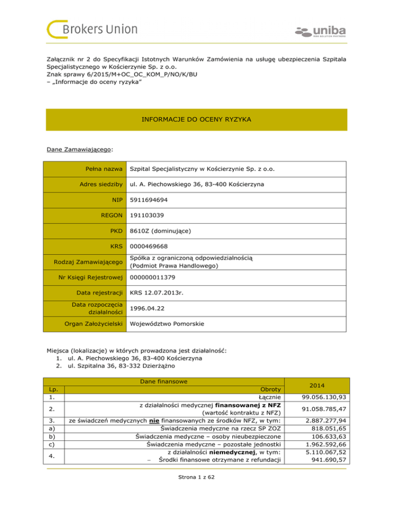 Załącznik nr 2 do Specyfikacji Istotnych Warunków Zamówienia na usługę ubezpieczenia Szpitala Specjalistycznego w Kościerzynie Sp. z o.o. Znak sprawy 6/2015/M+OC_OC_KOM_P/NO/K/BU – „Informacje do oceny ryzyka” INFORMACJE DO OCENY RYZYKA Dane Zamawiającego: Pełna nazwa Adres siedziby NIP REGON Szpital Specjalistyczny w Kościerzynie Sp. z o.o. ul. A. Piechowskiego 36, 83-400 Kościerzyna 5911694694 191103039 PKD 8610Z (dominujące) KRS 0000469668 Rodzaj Zamawiającego Nr Księgi Rejestrowej Data rejestracji Data rozpoczęcia działalności Organ Założycielski Spółka z ograniczoną odpowiedzialnością (Podmiot Prawa Handlowego) 000000011379 KRS 12.07.2013r. 1996.04.22 Województwo Pomorskie Miejsca (lokalizacje) w których prowadzona jest działalność: 1. ul. A. Piechowskiego 36, 83-400 Kościerzyna 2. ul. Szpitalna 36, 83-332 Dzierżążno Dane finansowe Lp. 1. 2. 3. a) b) c) 4. Obroty Łącznie z działalności medycznej finansowanej z NFZ (wartość kontraktu z NFZ) ze świadczeń medycznych nie finansowanych ze środków NFZ, w tym: Świadczenia medyczne na rzecz SP ZOZ Świadczenia medyczne – osoby nieubezpieczone Świadczenia medyczne – pozostałe jednostki z działalności niemedycznej, w tym: − Środki finansowe otrzymane z refundacji Strona 1 z 62 2014 99.056.130,93 91.058.785,47 2.887.277,94 818.051,65 106.633,63 1.962.592,66 5.110.067,52 941.690,57 Dane finansowe Lp. − 2014 Obroty Dzierżawa, najem pomieszczeń lub sprzętu − Z pozostałych tytułów 3.337.129,68 831.247,27 w PLN Wartość kontraktu z NFZ za rok 2014 84.683.411,40 zł za rok 2015 81.828.509,27zł** * - Bez wartości umów na II półrocze 2014r. z zakresu ZOL-u, Hospicjum Stacjonarnego oraz Szpitalnego Oddziału Ratunkowego. ** - Bez wartości umowy na II półrocze 2015r. z zakresu Szpitalnego Oddziału Ratunkowego w roku 2014 Liczba pacjentów przyjętych Lecznictwo otwarte 73 681 Lecznictwo zamknięte 21 910 Łącznie 95 591 Liczba lekarzy Kryterium Liczba w lokalizacji Kościerzyna Liczba w lokalizacji Dzierżążno Liczba lekarzy łącznie w obu lokalizacjach 171 23 194 52 8 60 89 6 95 3 0 3 27 9 36 Liczba lekarzy ogółem w tym: Zatrudnionych na umowę o pracę Zatrudnionych w ramach umów cywilno- prawnych, tzw. kontraktowi Zatrudnionych w ramach umowy zlecenia lub umowy o dzieło Rezydenci i stażyści Liczba lekarzy na danym oddziale Liczba lekarzy Lp. Oddział w Kościerzynie I stopień specjalizacji II stopień specjalizacji 0 0 0 0 0 0 0 9 0 9 5 4 0 9 Bez specjalizacji (w trakcie) 2 0 3 1 5 0 2 0 10 1 0 9 1 0 1 0 1. Anestezjologii i Intensywnej Terapii 2. Blok Operacyjny 3. Chirurgiczny 4. Chorób Wewnętrznych 5. Dziecięcy 6. Dzienny Chemioterapii 7. Kardiologiczny z Prac. Koronarografii Neurologiczny z Pododdziałem Udarowym i 8. Pododdziałem Rehabilitacji Neurologicznej Ortopedii i Traumatologii Narządu Ruchu z 9. pododdziałem Ortopedii Dziecięcej Pododdział Rehabilitacji Oddziału Ortopedii 10. i Traumatologii Narządu Ruchu Strona 2 z 62 Liczba lekarzy na danym oddziale Liczba lekarzy Lp. Oddział w Kościerzynie I stopień specjalizacji II stopień specjalizacji Bez specjalizacji (w trakcie) 11. Noworodkowy z pododdziałem Patologii Noworodka Położniczo-Ginekologiczny z pododdziałem Patologii Ciąży Psychiatryczny Rehabilitacji Dziecięcej Reumatologiczny Szpitalny Oddział Ratunkowy ze Szpitalną Izbą Przyjęć Urologii i Urologii Onkologicznej Hospicjum Stacjonarne ZDO Zakład Patomorfologii z Prosektorium 0 2 0 0 7 1 1 0 0 3 2 4 3 0 0 4 11 4 0 0 0 0 8 2 7 3 0 0 3 0 I stopień specjalizacji 0 0 0 Liczba lekarzy II stopień specjalizacji 6 4 3 Bez specjalizacji 1 0 0 0 0 0 Liczba w lokalizacji Kościerzyna 333 0 240 105 678 Liczba w lokalizacji Dzierżążno 67 0 55 13 135 12. 13. 14. 15. 16. 17. 18. 19. 20. Liczba lekarzy na danym oddziale Lp. 1. 2. 3. Oddział w Placówce terenowej w Dzierżążnie Oddział Rehabilitacji Dorosłych Oddział Rehabilitacji Dziecięcej Zakład Opiekuńczo Leczniczy Zakład Opiekuńczo Leczniczy Psychiatryczny 4. Liczba pozostałego personelu Lp. 1. 2. 3. 4. Nazwa Pielęgniarki* Położne* Pozostały personel medyczny Pozostali pracownicy Łączna liczba pracowników • • pielęgniarki i położne wykazano razem, bez podziału na grupy zawodowe dane przedstawiono z uwzględnieniem umów cywilnoprawnych Wykaz oddziałów Lp. 1. 2. 3. 4. 5. 6. Nazwa Anestezjologii i Intensywnej Terapii Blok Operacyjny Chirurgiczny Chorób Wewnętrznych z Pracownią Diagnostyki Endoskopowej Dziecięcy Dzienny Chemioterapii Strona 3 z 62 Liczba łóżek 7 0 31 35 22 4 (łóżka dzienne) Wykaz oddziałów Lp. Nazwa 7. Kardiologiczny z INK i Pracownią Rentgenodiagnostyki Zabiegowej Neurologii i Leczenia Stwardnienia Rozsianego z Oddziałem Udarowym 8. 9. 10. 11. 12. 13. 14. Ortopedii i Traumatologii Narządu Ruchu Oddział Rehabilitacji Neurologicznej Oddział Rehabilitacji Ruchowej Noworodkowy Położniczo-Ginekologiczny z pododdziałem Patologii Ciąży Psychiatryczny Rehabilitacji Dziecięcej z Pododdz. Rehabilitacji Neurologicznej 15. 16. 17. 18. 19. 20. 21. Reumatologiczny Szpitalny Oddział Ratunkowy ze Szpitalną Izbą Przyjęć Urologii i Urologii Onkologicznej z Prac. ESWL Hospicjum Stacjonarne Dzienny Oddział Psychiatryczny Oddział Chirurgii Naczyniowej (Oddział nie został uruchomiony) Oddział w Placówce w Dzierżążnie Oddział Rehabilitacji Dorosłych z Pododdz. Rehabilitacji Neurol. 22. Oddział Rehabilitacji Dziecięcej z Pododdz. Rehabilitacji Neurol. 23. 24. 25. 1. 2. 3. 4. 5. 6. 7. 8. 9. 10. 11. 12. 13. 14. 15. 16. 17. 18. 19. Zakład Opiekuńczo Leczniczy Zakład Opiekuńczo Leczniczy Psychiatryczny Wykaz poradni specjalistycznych Onkologiczna Dermatologiczna Ginekologiczno - Położnicza Gastroenterologiczna Hematologiczna Kardiologiczna i Zaburzeń Rytmu Serca dla Dorosłych Kardiologiczna dla Dzieci i Młodzieży Leczenia Uzależnień Medycyny Pracy w Dzierżążnie Medycyny Rodzinnej Neurologiczna Neurologiczn