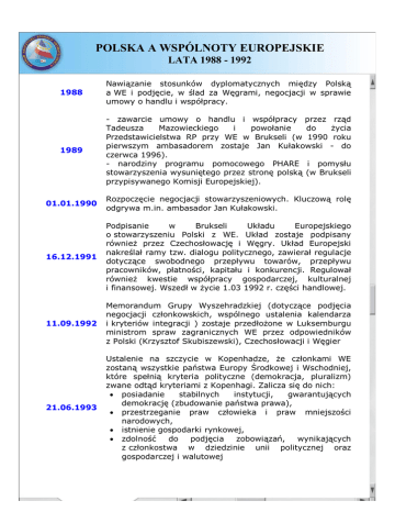 POLSKA A WSPÓLNOTY EUROPEJSKIE LATA 1988 - 1992 1988 Nawiązanie stosunków dyplomatycznych między Polską a WE i podjęcie, w ślad za Węgrami, negocjacji w sprawie umowy o handlu i współpracy. 1989 - zawarcie umowy o handlu i współpracy przez rząd Tadeusza Mazowieckiego i powołanie do życia Przedstawicielstwa RP przy WE w Brukseli (w 1990 roku pierwszym ambasadorem zostaje Jan Kułakowski - do czerwca 1996). - narodziny programu pomocowego PHARE i pomysłu stowarzyszenia wysuniętego przez stronę polską (w Brukseli przypisywanego Komisji Europejskiej). 01.01.1990 Rozpoczęcie negocjacji stowarzyszeniowych. Kluczową rolę odgrywa m.in. ambasador Jan Kułakowski. 16.12.1991 Podpisanie w Brukseli Układu Europejskiego o stowarzyszeniu Polski z WE. Układ zostaje podpisany również przez Czechosłowację i Węgry. Układ Europejski nakreślał ramy tzw. dialogu politycznego, zawierał regulacje dotyczące swobodnego przepływu towarów, przepływu pracowników, płatności, kapitału i konkurencji. Regulował również kwestie współpracy gospodarczej, kulturalnej i finansowej. Wszedł w życie 1.03 1992 r. części handlowej. 11.09.1992 Memorandum Grupy Wyszehradzkiej (dotyczące podjęcia negocjacji członkowskich, wspólnego ustalenia kalendarza i kryteriów integracji ) zostaje przedłożone w Luksemburgu ministrom spraw zagranicznych WE przez odpowiedników z Polski (Krzysztof Skubiszewski), Czechosłowacji i Węgier 21.06.1993 Ustalenie na szczycie w Kopenhadze, że członkami WE zostaną wszystkie państwa Europy Środkowej i Wschodniej, które spełnią kryteria polityczne (demokracja, pluralizm) zwane odtąd kryteriami z Kopenhagi. Zalicza się do nich: • posiadanie stabilnych instytucji, gwarantujących demokrację (zbudowanie państwa prawa), • przestrzeganie praw człowieka i praw mniejszości narodowych, • istnienie gospodarki rynkowej, • zdolność do podjęcia zobowiązań, wynikających z członkostwa w dziedzinie unii politycznej oraz gospodarczej i walutowej POLSKA A UNIA EUROPEJSKA LATA 1994 - 1999 01.02.1994 Wejście w życie Układu Europejskiego, zawartego w grudniu 1991 roku między Polską a Wspólnotami Europejskimi. 08.04.1994 Złożenie przez Polskę wniosku o członkostwo w UE. 0809.12.1994 Zaproponowanie przez Unię krajom kandydackim "strategii przygotowania do członkostwa". Na szczycie UE w Essen po raz pierwszy obecni byli przedstawiciele państw Europy Środkowej. 27.06.1995 Przyjęcie tzw. Białej Europejskiej w Cannes 1516.12.1995 Określenie na szczycie UE w Madrycie orientacyjnego kalendarza przygotowań do poszerzenia. Wynika z niego, że negocjacje członkowskie mogą rozpocząć się najwcześniej na przełomie 1997 i 1998 roku. 16.10.1996 Danuta Huebner sekretarzem nowo powołanego Komitetu Integracji Europejskiej. 04.11.1996 Jan Truszczyński ambasadorem RP przy Unii. 15.07.1997 Opublikowanie przez Komisję Europejską opinii o kandydatach do UE, zaproponowanie podjęcia negocjacji członkowskich z pierwszą szóstką kandydatów, w tym z Polską. 31.03.1998 Otwarcie negocjacji członkowskich między UE a Polską, Cyprem, Czechami, Estonią, Słowenią i Węgrami. 04.11.1998 Opublikowanie pierwszego, dorocznego raportu Komisji Europejskiej o postępach Polski na drodze do członkostwa; potwierdzenie dobrej oceny Polski w spełnianiu kryteriów politycznych i ekonomicznych, braki w dostosowaniu prawodawstwa i instytucji do norm Unii. 2223.03.1999 Zatwierdzenie na szczycie UE w Berlinie Agendy 2000 reformy wspólnej polityki rolnej i funduszy strukturalnych dla zacofanych regionów UE oraz ramy budżetowe na lata 2000-2006 przewidujące potrojenie pomocy dla kandydatów od 2000 roku (utworzenie funduszy ISPA i SAPARD) oraz rezerwę dla ewentualnych nowych członków od 2002 roku. Księgi podczas szczytu Rady POLSKA A UNIA EUROPEJSKA LATA 2000 - 2002 0711.12.2000 Zgromadzeni w Nicei przywódcy Piętnastki uznali, że od daty wejścia w życie Traktatu Nicejskiego Unia będzie w stanie powitać nowe państwa, gdy tylko będą zdolne do sprostania obowiązkom, wynikającym z członkostwa. W pierwszym dniu szczytu do Nicei przyjechali również szefowie rządów państw kandydujących (m.in. premier Jerzy Buzek). W wyniku zatwierdzonej na szczycie reformy UE, której celem było dostosowanie instytucji UE do przyjęcia 12 nowych państw; Polska otrzymała 27 na 345 głosów w przyszłej Radzie Ministrów i 50 miejsc w 732 - osobowym Parlamencie Europejskim. Tuż po przystąpieniu do Unii Polska, tak jak każde państwo UE, będzie miała jednego komisarza. Po przyjęciu wszystkich 12 państw liczba komisarzy zostanie ograniczona do liczby mniejszej niż 27. 1516.06.2001 Podczas szczytu Unii Europejskiej w Goeteborgu szefowie państw członkowskich zobowiązali się, że "kandydaci, którzy będą gotowi", mogą zakończyć negocjacje członkowskie przed końcem 2002 roku i przystąpić do Unii w 2004 roku. Zapowiedziano, że celem jest, aby państwa kandydujące mogły już jako członkowie uczestniczyć w wyborach do Parlamentu Europejskiego w 2004 roku. 1415.12.2001 Szczyt Unii Europejskiej w Laeken pod Brukselą zamieścił w dokumencie końcowym listę 10 krajów kandydujących do UE, w tym Polskę, które mają szansę na członkostwo w 2004 roku. "Rada Europejska (zgromadzenie przywódców Piętnastki) zgadza się z Komisją Europejską, która uważa, że jeżeli obecne tempo negocjacji i reform w państwach kandydujących zostaną utrzymane, Cypr, Czechy, Estonia, Litwa, Łotwa, Malta, Polska, Słowacja, Słowenia i Węgry mogłyby być gotowe". 01/02.2002 Powołanie polskich przedstawicieli w Konwencie. W konwencie zasiadają przedstawiciele rządu, Sejmu i Senatu. 2122.06.2002 Szczyt Unii Europejskiej w Sewilli, potwierdził zamiar Piętnastki poszerzenia jej w 2004 roku o 10 krajów, w tym o Polskę. Szczyt nie sprecyzował miesiąca, w którym to nastąpi. Wbrew wcześniejszym zapowiedziom Hiszpania nie zdecydowała si