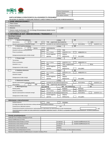 Centrum Korporacyjne Doradca Klienta Data wpływu wniosku KARTA INFORMACJI DODATKOWYCH DLA EKOKREDYTU PROSUMENT ZAŁĄCZNIK DO WNIOSKU O UDZIELENIE PRODUKTU KREDYTOWEGO DLA SPÓŁDZIELNI MIESZKANIOWYCH I. DANE WNIOSKODAWCY 1. Pełna nazwa: 2. Nazwa skrócona: 3. REGON: 4. NIP: 5. Nazwa urzędu skarbowego (US), do którego Wnioskodawca składa roczne rozliczenie podatku dochodowego: II. INFORMACJE DOT. WNIOSKOWANEJ TRANSAKCJI Beneficjent dotacji: Rodzaj instalacji: 1. Systemy fotowoltaiczne NIE Sposób wykorzystania nadwyżek energii: TAK, pojemność akumulatorów: ……….. sprzedaż do sieci elektroenergetycznej akumulatory 2. Kocioł opalany biomasą Rodzaj załadunku: kW o mocy Akumulatory: automatyczny Zasobnik buforowy wody grzewczej: NIE TAK Praca na potrzeby: c.o. + c.w.u. wyłącznie c.w.u. kocioł węglowy olejowy Zastępowane/potencjalne źródło energii: zasobnik c.w.u. kW o mocy ręczny kWh. gazowy 3. Pompa ciepła wyłącznie c.o. elektryczny o mocy inny (jaki) ………………………. kW Typ pompy: wyłącznie c.o. Praca na potrzeby: c.o. + c.w.u. wyłącznie c.w.u. Zasobnik c.w.u.: NIE TAK, o pojemności: kocioł węglowy olejowy Zastępowane źródło energii: gazowy 4. Kolektory słoneczne elektryczny o mocy c.o. + c.w.u. wyłącznie c.w.u. Zasobnik ciepła: NIE TAK kocioł węglowy olejowy gazowy 5. Elektrownie wiatrowe inny (jaki) elektryczny o mocy inny (jaki) sprzedaż do sieci elektroenergetycznej akumulatory TAK, pojemność akumulatorów: ……….. kW; moc cieplna moc elektryczna: Rodzaj paliwa: biogaz biopłyny Praca na potrzeby: c.o. + c.w.u. wyłącznie c.w.u. Sposób wykorzystania nadwyżek energii: sprzedaż do sieci elektroenergetycznej Zastępowane źródło energii: ………………………. kW Akumulatory: NIE ………………………. wyłącznie c.o. Sposób wykorzystania nadwyżek energii: 6. Mikrokogeneracja litrów kW Praca na potrzeby: Zastępowane źródło energii: ……….. kocioł węglowy olejowy gazowy elektryczny nowy istniejący zasobnik c.w.u. kWh. kW biomasa wyłącznie c.o. akumulatory inny (jaki) zasobnik c.w.u. ………………………. Informacje o nieruchomości Rodzaj budynku: Nr księgi wieczystej nieruchomości w której zainstalowana będzie instalacja: Powierzchnia całkowita budynku: m2 Powierzchnia budynku przeznaczona i wykorzystywana / planowana do wykorzystania na cele mieszkaniowe: m2 Zapotrzebowanie na ciepło nie może przekroczyć w przypadku budynków nowych - 50 W/m2, w przypadku budynków modernizowanych - 80 W/m2 powierzchni ogrzewalnej. Koszty przedsięwzięcia Całkowity koszt realizacji inwestycji (w PLN): Koszty kwalifikowane (w PLN): Wnioskowana kwota kredytu (w PLN): co stanowi kosztów kwalifikowanych (%) Wnioskowana kwota dotacji (w PLN): co stanowi kosztów kwalifikowanych (%) Wnioskowany okres karencji: miesięcy Wnioskowany okres kredytowania: miesięcy Termin realizacji przedsięwzięcia do dnia: (max. 18 miesięcy od dnia złożenia wniosku) Róźnica pomiędzy kosztami kwalifikowanymi a kosztem instalacji (PLN): Róźnica pomiędzy kosztem instalacji a kosztami kwalifikowanymi finansowana będzie: z środków własnych dodatkowego kredytu w BOŚ na finansowanie różnicy Nr rachunku bankowego sprzedawcy/dostawcy instalacji: Spłata nastąpi z rachunku w BOŚ S.A. o numerze: Udział instalacji w kosztach kwalifikowanych Rodzaj instalacji: Koszt (PLN) Udział w k.kwalifikowanych (%): Jednostkowy koszt przedsięwzięcia: a) Systemy fotowoltaiczne PLN/kWp b) Elektrownie wiatrowe PLN/kW c) Pompy ciepła PLN/kW d) Kolektory słoneczne PLN/kW e) Kotły opalane biomasą PLN/kW f) Mikrokogeneracja PLN/kWe W przypadku elementów instalacji służących równocześnie kilku źródłom należy rozbić ich koszt proporcjonalnie do mocy znamionowej źródeł, którym służą. Uwagi: Wnioskodawca oświadcza, że: 1) Podane przez niego dane są zgodne ze stanem faktycznym. 2) Podatek od towarów i usług a. nie stanowi kosztu kwalifikowanego Przedsięwzięcia, a wszystkie kwoty określone w harmonogramie rzeczowo-finansowym są wartościami netto* b. stanowi koszt kwalifikowany Przedsięwzięcia i nie będzie odliczany od podatku należnego w rozliczeniu z włąściwym Urzędem Skarbowym, a wszystkie kwoty określone w harmonogramie rzeczowo-finansowym są wartościami brutto*; 3) Nie uzyskał i nie będzie się ubiegał o dofinansowanie całych lub części kosztów przedsięwzięcia, objętych finansowaniem w ramach Programu, z innych środków publicznych, za wyjątkiem środków pochodzących z umowy Kredytu wraz z Dotacją, z zastrzeżeniem, ze te same koszty kwalifikowane nie mogą być finansowane jednocześnie ze środków kredytu i dotacji; 4) Posiada prawo do dysponowania budynkiem mieszkalnym lub budynkiem mieszkalnym w budowie, na potrzeby którego będzie realizowane przedsięwzięcie; 5) Wyraża zgodę na przeprowadzenie przez Bank oraz NFOŚiGW lub osoby wskazane przez NFOŚiGW, łącznie lub samodzielnie kontroli realizacji przedsięwzięcia, a także przez NFOŚiGW lub osoby przez niego wskazane kontroli trwałości przedsięwzięcia, w jego obecności, w miejscu realizacji przedsięwzięcia; 6) Zobowiązuje się do realizacji przedsięwzięcia zgodnie z "Wymaganiami technicznymi dla instalacji oraz dotyczącymi uprawnień do montażu instalacji" określonymi w załączniku do Programu Priorytetowego; 7) Zobowiązuje się do podpisania umowy z wybranym wykonawcą zawierającej zapisy i wymogi określone w Programie Priorytetowym, 8) Zobowiązuje się do utrzymania trwałości przedsięwzięcia przez okres trzech lat od jego zakończenia oraz do przekazywania w okresie trwałości danych o wielkości produkcji energii ze źródeł odnawialnych, zgodnie z warunkami określonymi w umowie Kredytu wraz z Dotacją; 9) W roku złożenia Wniosku oraz w ciągu ostatnich 3 lat przed jego złożeniem NFOŚiGW nie wypowiedział Wnioskodawcy umowy z przyczyn leżących po stronie Wnioskodawcy;