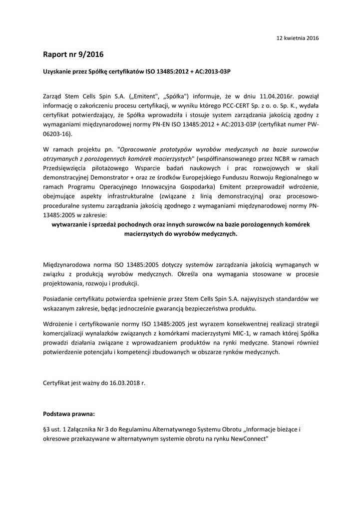 12 kwietnia 2016 Raport nr 9/2016 Uzyskanie przez Spółkę certyfikatów ISO 13485:2012 + AC:2013-03P Zarząd Stem Cells Spin S.A. („Emitent", „Spółka") informuje, że w dniu 11.04.2016r. powziął informację o zakooczeniu procesu certyfikacji, w wyniku którego PCC-CERT Sp. z o. o. Sp. K., wydała certyfikat potwierdzający, że Spółka wprowadziła i stosuje system zarządzania jakością zgodny z wymaganiami międzynarodowej normy PN-EN ISO 13485:2012 + AC:2013-03P (certyfikat numer PW06203-16). W ramach projektu pn. "Opracowanie prototypów wyrobów medycznych na bazie surowców otrzymanych z porożogennych komórek macierzystych" (współfinansowanego przez NCBR w ramach Przedsięwzięcia pilotażowego Wsparcie badao naukowych i prac rozwojowych w skali demonstracyjnej Demonstrator + oraz ze środków Europejskiego Funduszu Rozwoju Regionalnego w ramach Programu Operacyjnego Innowacyjna Gospodarka) Emitent przeprowadził wdrożenie, obejmujące aspekty infrastrukturalne (związane z linią demonstracyjną) oraz procesowoproceduralne systemu zarządzania jakością zgodnego z wymaganiami międzynarodowej normy PN13485:2005 w zakresie: wytwarzanie i sprzedaż pochodnych oraz innych surowców na bazie porożogennych komórek macierzystych do wyrobów medycznych. Międzynarodowa norma ISO 13485:2005 dotyczy systemów zarządzania jakością wymaganych w związku z produkcją wyrobów medycznych. Określa ona wymagania stosowane w procesie projektowania, rozwoju i produkcji. Posiadanie certyfikatu potwierdza spełnienie przez Stem Cells Spin S.A. najwyższych standardów we wskazanym zakresie, będąc jednocześnie gwarancją bezpieczeostwa produktu. Wdrożenie i certyfikowanie normy ISO 13485:2005 jest wyrazem konsekwentnej realizacji strategii komercjalizacji wynalazków związanych z komórkami macierzystymi MIC-1, w ramach której Spółka prowadzi działania związane z wprowadzaniem produktów na rynki medyczne. Stanowi również potwierdzenie potencjału i kompetencji zbudowanych w obszarze rynków medycznych. Certyfikat jest ważny do 16.03.2018 r. Podstawa prawna: §3 ust. 1 Załącznika Nr 3 do Regulaminu Alternatywnego Systemu Obrotu „Informacje bieżące i okresowe przekazywane w alternatywnym systemie obrotu na rynku NewConnect"