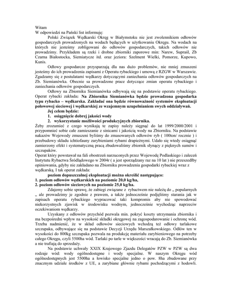 Witam W odpowiedzi na Pański list informuję: Polski Związek Wędkarski Okręg w Białymstoku nie jest zwolennikiem odłowów gospodarczych prowadzonych na wodach będących w użytkowaniu Okręgu. Na wodach na których nie jesteśmy zobligowani do odłowów gospodarczych, takich odłowów nie prowadzimy. Przykładem są rzeki i drobne zbiorniki zaporowe min: Narew, Supraśl, Zb Czarna Białostocka, Siemiatycze itd. oraz jeziora: Szelment Wielki, Pomorze, Kupowo, Kunis. Odłowy gospodarcze przysparzają dla nas dużo problemów, nie mniej zmuszeni jesteśmy do ich prowadzenia zapisami z Operatu rybackiego i umową z RZGW w Warszawie. Zgadzamy się z postulatami wędkarzy dotyczącymi zaniechania odłowów gospodarczych na Zb. Siemianówka. Obecnie sa prowadzone prace dotyczące zmian operatu rybackiego i zaniechania odłowów gospodarczych. Odłowy na Zbiorniku Siemianówka odbywają się na podstawie operatu rybackiego. Operat rybacki zakłada: Na Zbiorniku Siemianówka będzie prowadzona gospodarka typu rybacko – wędkarska. Zakładać ona będzie równoważność systemów eksploatacji połowowej sieciowej i wędkarskiej ze wzajemnym uzupełnianiem swych oddziaływań. Jej celem będzie: 1. osiągnięcie dobrej jakości wody 2. wykorzystanie możliwości produkcyjnych zbiornika. Żeby zrozumieć z czego wynikają te zapisy należy sięgnąć do lat 1999/2000/2001 i przypomnieć sobie całe zamieszanie z sinicami i jakością wody na Zbiorniku. Na podstawie nakazów Wojewody zmuszeni byliśmy do zmasowanych odłowów ryb ( 100ton/ rocznie ) i przebudowy składu ichtiofauny zarybieniami rybami drapieżnymi. Udało się wtedy osiągnąć zamierzony efekt i systematyczną pracą zbudowaliśmy zbiornik słynący z pięknych sumów i szczupaków. Operat który powstawał na fali obostrzeń narzuconych przez Wojewodę Podlaskiego i zaleceń Instytutu Rybactwa Śródlądowego w 2004r ( a jest sporządzany raz na 10 lat ) nie przeszedłby opiniowania, gdyby nie zakładano na Zbiorniku prowadzenia gospodarki rybackiej wraz z wędkarską. I tak operat zakłada: poziom dopuszczalnej eksploatacji można określić następująco: 1. poziom odłowów wędkarskich na poziomie 20,0 kg/ha, 2. poziom odłowów sieciowych na poziomie 25,0 kg/ha. Zdajemy sobie sprawę, że zabiegi związane z rybactwem nie należą do „ popularnych „ ale prowadzimy je zgodnie z prawem, a także jednocześnie podjęliśmy starania jak w zapisach operatu rybackiego wypracować taki kompromis aby nie spowodować niekorzystnych zjawisk w środowisku wodnym, jednocześnie wychodząc naprzeciw oczekiwaniom wędkarzy. Uzyskany z odłowów przychód pozwala min. pokryć koszty utrzymania zbiornika i ma bezpośredni wpływ na wysokość składki okręgowej na zagospodarowanie i ochronę wód. Trzeba nadmienić, że w skład odłowów sieciowych wchodzą też odłowy tarlakowe szczupaka, odbywające się na podstawie Decyzji Urzędu Marszałkowskiego. Odłów ten w wysokości do 800kg szczupaka pozwala na produkcję materiału zarybieniowego na potrzeby całego Okręgu, czyli 5500ha wód. Tarlaki po tarle w większości wracają do Zb. Siemianówka a nie trafiają do sprzedaży. Na podstawie uchwały XXIX Krajowego Zjazdu Delegatów PZW w PZW są dwa rodzaje wód: wody ogólnodostępne i wody specjalne. W naszym Okręgu wód ogólnodostępnych jest 5500ha a łowisko specjalne jedno o pow. 8ha zbudowane przy znacznym udziale środków z UE, a zarybiane głównie rybami pochodzącymi z hodowli. Należy nadmienić, że w 2011r łowisko to odwiedziło 2486 wędkarzy i 715 osób towarzyszących. Wysokość odłowów na zbiorniku Siemianówka w latach 2009-2011 kształtował się na następującym poziomie: Rok Odłowy sieciowe Odłowy wędkarskie 2009 24 985kg 55 985kg w tym szczupak 7613kg w tym szczupak 39 849kg 2010 23 456kg 60 175kg w tym szczupak 7099kg w tym szczupak 36 745kg 2011 22 006kg W trakcie analizy w tym szczupak 6801kg Z przedstawionej tabeli wynika tendencja malejąca odłowów sieciowych, a na uwagę zasługuje znaczne nasilenie presji wędkarskiej na szczupaka. Przy tak rozłożonej presji odłowy sieciowe są jedyna realną metodą ograniczania ryb karpiowatych w Zb. Siemianówka. Zarybienia na Zbiorniku Siemianówka odbywają się na takim samym corocznym poziomie i nastawione są głównie na gatunki drapieżne: Zalecane gatunki i dawki materiału zarybieniowego dla Zbiornika Siemianówka w obwodzie Nr 1. Gatunek i asortyment Boleń narybek jesienny Jaź kroczek Szczupak wylęg żerujący Szczupak narybek letni Szczupak narybek jesienny Węgorz montee lub podchowany Sum kroczek Lin kroczek Karp kroczek Szt. Kg 10 000 2 500 000 50 000 - 150 1500 40 343,2 300 700 250 - Prosimy o przedstawienie naszego stanowiska w całości. Z poważaniem Ryszard Broniszewski
