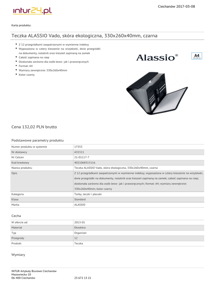 Ciechanów 2017-03-08 Karta produktu: Teczka ALASSIO Vado, skóra ekologiczna, 330x260x40mm, czarna Z 12 przegródkami zaopatrzonymi w wymienne indeksy Wyposażona w cztery kieszenie na wizytówki, dwie przegródki na dokumenty, notatnik oraz kieszeń zapinaną na zamek Całość zapinana na rzep Doskonała zarówno dla osób lewo- jak i praworęcznych Format: A4 Wymiary zewnętrzne: 330x260x40mm Kolor czarny Cena 132,02 PLN brutto Podstawowe parametry produktu Numer produktu w systemie 17353 Nr dostawcy A31511 Nr Celcen 21-01117-7 Kod kreskowy 4021068315116 Nazwa produktu Teczka ALASSIO Vado, skóra ekologiczna, 330x260x40mm, czarna Opis Z 12 przegródkami zaopatrzonymi w wymienne indeksy; wyposażona w cztery kieszenie na wizytówki, dwie przegródki na dokumenty, notatnik oraz kieszeń zapinaną na zamek; całość zapinana na rzep; doskonała zarówno dla osób lewo- jak i praworęcznych; format: A4; wymiary zewnętrzne: 330x260x40mm; kolor czarny Kategoria Torby, teczki i plecaki Klasa Standard Marka ALASSIO Cecha W ofercie od 2013-01 Materiał Ekoskóra Typ Organizer Przegrody 12 Produkt Teczka Wymiary INTUR Artykuły Biurowe Ciechanów Mazowiecka 10 06-400 Ciechanów 23 672 13 21 Ciechanów 2017-03-08 Karta katalogowa produktu cd. Teczka ALASSIO Vado, skóra ekologiczna, 330x260x40mm, czarna Format A4 Wymiary (mm) 330x260x40 Wspólny słownik zamówień CPV 22817000-0 Terminarze lub organizery osobiste Certyfikaty Nowy produkt w ofercie Standard Hit Standard Kolor Kolor Czarny Pozostałe zdjęcia produktu Serdecznie zapraszamy do współpracy INTUR Artykuły Biurowe Ciechanów zespół. INTUR Artykuły Biurowe Ciechanów Mazowiecka 10 06-400 Ciechanów 23 672 13 21