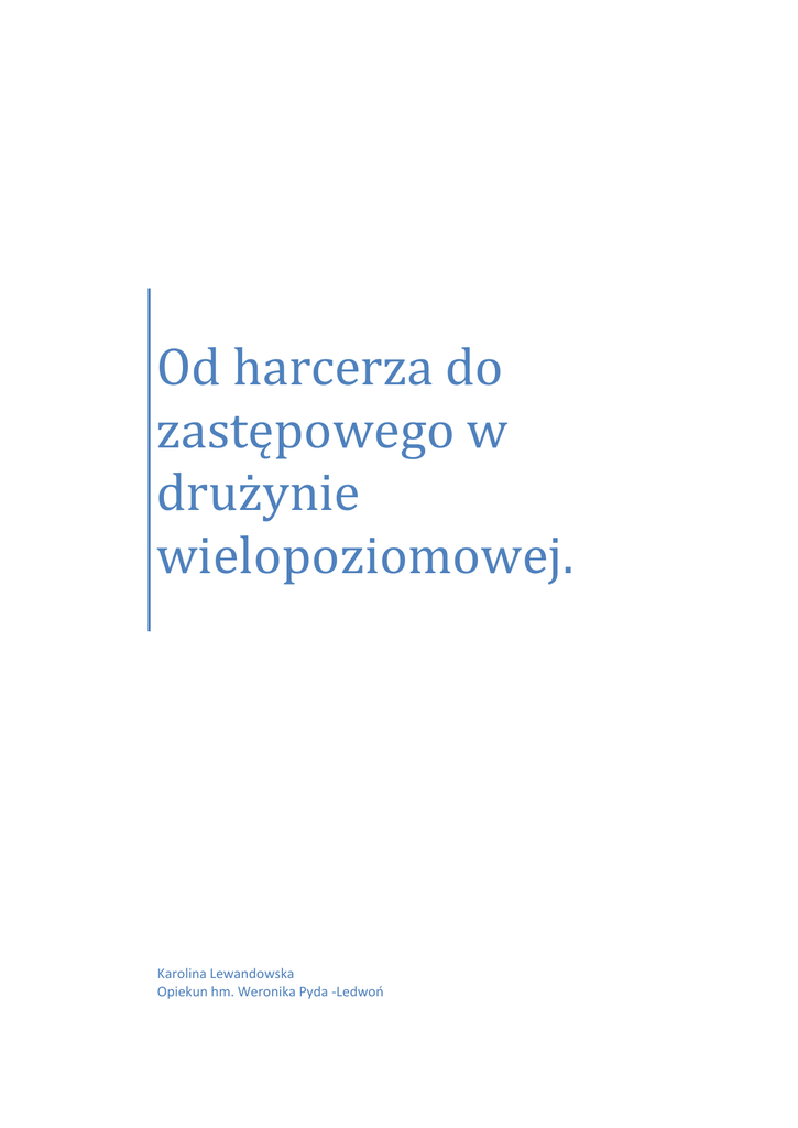 Od harcerza do zastępowego w drużynie wielopoziomowej. Karolina Lewandowska Opiekun hm. Weronika Pyda -Ledwoń Spis treści 1. Drużyna wielopoziomowa ………………………………………………………………………………… str3 Czym jest system małych grup Dlaczego system małych grup? Zastępy i zastępowi w drużynie wielopoziomowej 2. Jak zacząć? Pierwsze zbiórki Krzyż harcerski. Jak wyłonić zastępowego ? Pierwsza zbiórka po wyborze zastępowego 3. Praca z zastępowym Wsparcie dla zastępowego Kurs zastępowych. Plan pracy z zastępowym Plan pracy z zastępowym Zastęp zastępowych 2 1. Drużyna wielopoziomowa: Jest to drużyna, która działa więcej niż jedną metodyką harcerską, a daną metodyką działają osoby w odpowiednim wieku. W skład kadry drużyny wchodzi drużynowy i przyboczni odpowiedzialni za dany pion metodyczny, oraz instruktorzy/wędrownicy którzy pomagają przy pracy z pionem. 1. Czym jest system małych grup: SYSTEM MAŁYCH GRUP Zastęp to grupa przyjaciół, która pozwala na znalezienie swojego miejsca i sprawdzenie się w samodzielnym działaniu. Praca w małych grupach przynosi wymierne efekty wychowawcze, ponieważ łatwiej jest dotrzeć do każdego, dostrzec jego wartość, pomóc mu pokonać słabości, porozmawiać z nim, poznać go. W harcerstwie takie grupy stanowią szóstki, zastępy, patrole, zespoły zadaniowe. Na ich czele stoją zwykle rówieśnicy mający trochę większe doświadczenie czy też wyrobienie harcerskie, cieszący się zaufaniem. We współzawodnictwie konkurowanie ze sobą zespołów wzmaga emocje, zwiększa motywację do działania. 1. 2. 3. 4. 5. 6. 1. Dlaczego system małych grup? Jedna osoba ma tylko jednego bezpośredniego przełożonego. Plus jest taki że instruktor pracuje z zastępowymi np. przy opisywaniu zadania tłumaczy tylko jednej osobie. Dzięki temu więcej osób ponosi za coś odpowiedzialność. Czynności za które odpowiedzialny jest zastępowy nie są trudne i długie. Ale poczucie odpowiedzialności i obowiązku pozwala mu się rozwijać. Dla harcerza zwykłego plus jest taki że łatwiej mu powiedzieć coś swojemu koledze zastępowemu niż przybocznemu lub drużynowemu. Jeśli pracuje się z małą liczbą osób można je lepiej poznać. Powoduje to możliwość większej indywidualności. Dzięki temu nikt nie jest pominięty zapomniany. Dla zastępowego jest to ćwiczenie umiejętności pracy z grupą jako lider. Oraz nauka radzenia sobie w życiu. Uczy się odpowiedzialności rozwija różne ważne cechy, które w przyszłości mogą mu pomóc. Nauka mniejszej grupy osób jest bardziej efektywna. Na 2 godzinnej zbiórce z samarytanki więcej można przećwiczyć z 6 osobami niż 20. Pojawia się rywalizacja między zastępowa. Odpowiednio ukierunkowana może stanowić bardzo dużą motywację dla całego zastępu. Znika poczucie anonimowości kiedy działamy w małej grupie zawsze każdy ma zadanie. Wiemy że musimy coś zrobić bo inaczej cała grupa na tym straci. Zastępy w drużynie wielopoziomowej: Kim jest zastępowy: Zastępowy dla zastępu jest wzorem do naśladowania, opiekunem, osobą która zna swój zastęp, umie rozwiązać konflikt i jest dla zastępu autorytetem. Zastępowy jest kimś kto przewodzi zastępowi i umie wydawać komendy ale jednocześnie jest lubiany chętny do zabawy. 2. Jaki powinien być zastępowy: Przyjazny – łatwo nawiązuje kontakt z członkami swojego zastępu, stara się ich poznać. Odpowiedzialny- można mu zaufać , powierzyć zadanie, chociaż oczywiście na wszystko na poziomie jego wieku. Odważny- nie powinien się bać wypowiedzieć, przerwać kłótnię, zapytać w wypadku wątpliwości lub po prostu jak trzeba podejść i coś dla zastępu załatwić. W terenie powinien umieć podejmować decyzję. Kreatywny – musi mieć dużo pomysłów i być otwarty na propozycję. 3 Powinien być naturalnym liderem – tą cechę łatwo jest wyłapać w grach i zabawach. Sam przewodzi grupie. Ma większą wiedzę harcerską niż jego zastęp. Chętny do działania – powinien chętnie robić, zbiórki realizować nowe pomysły razem z przybocznym. 3. Jak działają zastępy: Zastęp stanowi 6-8 osób. Spotykają się na zbiórkach i wykonują razem zadania między zbiórkowe. Dowodzi zastępem zastępowy, który prowadzi zbiórkę zastępu. Zbiórki zastępu są samodzielne, jednak przyboczny powinien wiedzieć co będzie się na danej zbiórce działo. Zastęp powinien realizować plan pracy, który stworzyli wcześniej zastępowi z przybocznym. Zastęp w tym samym wieku powinny poznawać podobny zakres wiedzy i uczyć się tych samych umiejętności. Co kilka zbiórek może odbyć się zbiórka pionu, przygotowana przez przybocznego. Na tej zbiórce warto sprawdzić poznane na zbiórkach umiejętności np. w postaci gry terenowej. Rywalizacja między zastępowa motywuje zastęp do pracy i nauki nowych rzeczy. Jednak taka rywalizacja musi mieć cel, jakąś nagrodę jaką może zaproponować przyboczny. 4. Zastęp w drużynie wielopoziomowej może się nie zmieniać przez kilka metodyk. Pozwala to na większą ciągłość metodyczną dla każdej indywidualnej osoby. Ułatwia zawieranie wieloletnich przyjaźni. Umożliwia lepszy rozwój i stawianie co raz trudniejszych celów. Bez konieczności sprawdzania przez instruktorów umiejętności poszczególnych osób. 5. Zastępowy powinien być bardziej doświadczony i mieć więcej wiedzy: Dla drużyny wielopoziomowej jest to w pewien sposób problem. Bo najlepszy byłby zastępowy straszy od jego zastępu. Ale wtedy przeszedł by do kolejnego pionu bez swojego zastępu. Dlatego najlepiej w drużynie wielopoziomowej jeśli cały zastęp w miarę możliwości jest w tym samym wieku. Prawie zawsze w grupie rówieśników ktoś się wyróżnia i daje nam to możliwość na wybór zastępowego. 4 2. Jak zacząć? Pierwsze zbiórki 1. 2. 3. 4. 5. 6. Mamy grupę harcerzy, jedni są już