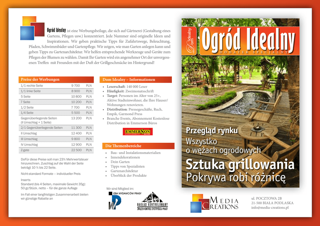 Preise der Werbungen D omidealny Ogród Idealny ist eine Werbungsbeilage, die sich auf Gärtnerei (Gestaltung eines Gartens, Pflegen usw.) konzentriert. Jede Nummer sind originelle Ideen und Inspirationen. Wir geben praktische Tipps für Zufahrtswege, Beleuchtung, Pfaden, Schwimmbäder und Gartenpflege. Wir zeigen, wie man Garten anlegen kann und geben Tipps zu Gartenarchitektur. Wir helfen entsprechende Werkzeuge und Geräte zum Pflegen der Blumen zu wählen. Damit Ihr Garten wird ein angenehmer Ort der unvergessenen Treffen mit Freunden mit der Duft der Grillgeschmäcke im Hintergrund! Ogród Idealny D o D a t e k s p e c j a l n y Dom Idealny – Informationen 1/1 rechte Seite 9 700 PLN 1/1 linke Seite 8 900 PLN 5 Seite 10 800 PLN 7 Seite 10 200 PLN 1/2 Seite 7 700 PLN 1/4 Seite 5 500 PLN Gegenüberliegende Seiten (II Umschlag + 1 Seite) 13 200 PLN 2/1 Gegenüberliegende Seiten 11 300 PLN II Umschlag 12 400 PLN III Umschlag 9 800 PLN IV Umschlag 12 900 PLN Z-gate 22 500 PLN DoFür diese Preise soll man 23% Mehrwertsteuer hinzurechnen. Zuschlag auf die Wahl der Seite beträgt 10 % bis 22 Seite. Nicht-standard Formate – individueller Preis Inserts Standard (bis 4 Seiten, maximale Gewicht 35g): 50 gr/Stück. netto – für die ganze Auflage Im Fall einer langfristigen Zusammenarbeit bieten wir günstige Rabatte an • Leserschaft: 140 000 Leser • Häufigkeit: Zweimonatsschrift • Target: Personen im Alter von 25+, Aktive Stadteinwohner, die Ihre Hauser/ Wohnungen renovieren. • Distribution: Pressegeschäfte, Ruch, Empik, Garmond Press • Branche Events, Abonnement Kostenlose Distribution in Emmerson Büros Die Themenbereiche • • • • • • Bau- und Instalationsmaterialien Innendekorationen Dein Garten Tipps von Spezialisten Gartenarchitektur Überblick der Produkte Przegląd rynku Wszystko o wężach ogrodowych Sztuka grillowania Pokrywa robi różnicę Wir sind Mitglied im: IZBA WYDAWCÓW PRASY m edia c reations ul. POCZTOWA 2B 21-500 BIAŁA PODLASKA [email protected]
