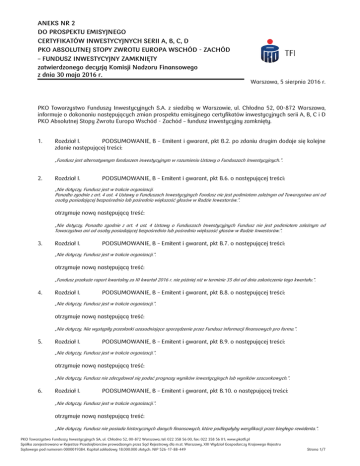 ANEKS NR 2 DO PROSPEKTU EMISYJNEGO CERTYFIKATÓW INWESTYCYJNYCH SERII A, B, C, D PKO ABSOLUTNEJ STOPY ZWROTU EUROPA WSCHÓD - ZACHÓD – FUNDUSZ INWESTYCYJNY ZAMKNIĘTY zatwierdzonego decyzją Komisji Nadzoru Finansowego z dnia 30 maja 2016 r. Warszawa, 5 sierpnia 2016 r. PKO Towarzystwo Funduszy Inwestycyjnych S.A. z siedzibą w Warszawie, ul. Chłodna 52, 00-872 Warszawa, informuje o dokonaniu następujących zmian prospektu emisyjnego certyfikatów inwestycyjnych serii A, B, C i D PKO Absolutnej Stopy Zwrotu Europa Wschód - Zachód – fundusz inwestycyjny zamknięty. 1. Rozdział I. PODSUMOWANIE, B – Emitent i gwarant, pkt B.2. po zdaniu drugim dodaje się kolejne zdanie następującej treści: „Fundusz jest alternatywnym funduszem inwestycyjnym w rozumieniu Ustawy o Funduszach Inwestycyjnych.”. 2. Rozdział I. PODSUMOWANIE, B – Emitent i gwarant, pkt B.6. o następującej treści: „Nie dotyczy. Fundusz jest w trakcie organizacji. Ponadto zgodnie z art. 4 ust. 4 Ustawy o Funduszach Inwestycyjnych Fundusz nie jest podmiotem zależnym od Towarzystwa ani od osoby posiadającej bezpośrednio lub pośrednio większość głosów w Radzie Inwestorów.”. otrzymuje nową następującą treść: „Nie dotyczy. Ponadto zgodnie z art. 4 ust. 4 Ustawy o Funduszach Inwestycyjnych Fundusz nie jest podmiotem zależnym od Towarzystwa ani od osoby posiadającej bezpośrednio lub pośrednio większość głosów w Radzie Inwestorów.”. 3. Rozdział I. PODSUMOWANIE, B – Emitent i gwarant, pkt B.7. o następującej treści: „Nie dotyczy. Fundusz jest w trakcie organizacji.”. otrzymuje nową następującą treść: „Fundusz przekaże raport kwartalny za III kwartał 2016 r. nie później niż w terminie 35 dni od dnia zakończenia tego kwartału.”. 4. Rozdział I. PODSUMOWANIE, B – Emitent i gwarant, pkt B.8. o następującej treści: „Nie dotyczy. Fundusz jest w trakcie organizacji.”. otrzymuje nową następującą treść: „Nie dotyczy. Nie wystąpiły przesłanki uzasadniające sporządzenie przez Fundusz informacji finansowych pro forma.”. 5. Rozdział I. PODSUMOWANIE, B – Emitent i gwarant, pkt B.9. o następującej treści: „Nie dotyczy. Fundusz jest w trakcie organizacji.”. otrzymuje nową następującą treść: „Nie dotyczy. Fundusz nie zdecydował się podać prognozy wyników inwestycyjnych lub wyników szacunkowych.”. 6. Rozdział I. PODSUMOWANIE, B – Emitent i gwarant, pkt B.10. o następującej treści: „Nie dotyczy. Fundusz jest w trakcie organizacji.”. otrzymuje nową następującą treść: „Nie dotyczy. Fundusz nie posiada historycznych danych finansowych, które podlegałyby weryfikacji przez biegłego rewidenta.”. PKO Towarzystwo Funduszy Inwestycyjnych SA, ul. Chłodna 52, 00-872 Warszawa; tel: 022 358 56 00, fax: 022 358 56 01; www.pkotfi.pl Spółka zarejestrowana w Rejestrze Przedsiębiorców prowadzonym przez Sąd Rejestrowy dla m.st. Warszawy, XIII Wydział Gospodarczy Krajowego Rejestru Sądowego pod numerem 0000019384. Kapitał zakładowy 18.000.000 złotych. NIP 526-17-88-449 Strona 1/7 7. Rozdział I. PODSUMOWANIE, B – Emitent i gwarant, pkt B.11. o następującej treści: „Nie dotyczy. Fundusz jest w trakcie organizacji.”. otrzymuje nową następującą treść: „Nie dotyczy. Poziom kapitału obrotowego Funduszu jest wystarczający na pokrycie bieżących potrzeb Funduszu.”. 8. Rozdział I. PODSUMOWANIE w pkt B.35. na końcu dodaje się akapity o następującym brzmieniu: „W dniu 26 sierpnia 2016 r. na stronie internetowej www.pkotfi.pl zostały opublikowane zmiany Statutu Funduszu m.in. w zakresie wskazania metod wyznaczania ekspozycji Funduszu, dostosowujące w tym zakresie Statut Funduszu do obowiązków wynikających z Rozporządzenia 231/2013 oraz Ustawy o Funduszach Inwestycyjnych. Zgodnie z przedmiotowymi zmianami maksymalne zaangażowanie Funduszu w Instrumenty Pochodne, w tym Niewystandaryzowane Instrumenty Pochodne oraz Towarowe Instrumenty Pochodne wyznacza się poprzez obliczenie Ekspozycji AFI przy zastosowaniu metody zaangażowania zgodnie z zasadami określonymi w Rozporządzeniu 231/2013 oraz w Ustawie o Funduszach Inwestycyjnych. Określone przez Ekspozycję AFI maksymalne zaangażowanie Funduszu w Instrumenty Pochodne, w tym Niewystandaryzowane Instrumenty Pochodne oraz Towarowe Instrumenty Pochodne, obliczone przy zastosowaniu metody zaangażowania w sposób określony Rozporządzeniem 231/2013 i Ustawą o Funduszach Inwestycyjnych, nie może w żadnym momencie przekraczać 400% WAN Funduszu. Przedmiotowe zmiany Statutu Funduszu wejdą w życie po upływie 3 miesięcy od dnia ich ogłoszenia, tj. w dniu 26 listopada 2016 r. Ogłoszenie nr 15/2016 o zmianach w treści statutów funduszy inwestycyjnych zarządzanych przez Towarzystwo, w części dotyczącej zmian Statutu Funduszu, opublikowane na stronie internetowej www.pkotfi.pl w dniu 26 sierpnia 2016 r., zostało włączone do Prospektu przez odesłanie.”. 9. Rozdział I. PODSUMOWANIE, B – Emitent i gwarant, pkt B.44. o następującej treści: „Nie dotyczy. Fundusz jest w trakcie organizacji. Fundusz dotychczas nie sporządzał sprawozdań finansowych.”. otrzymuje nową następującą treść: „Nie dotyczy. Fundusz dotychczas nie sporządzał sprawozdań finansowych.”. 10. Rozdział I. PODSUMOWANIE, B – Emitent i gwarant, pkt B.45. otrzymuje następującą treść: „Nie dotyczy. Fundusz jest w trakcie organizacji.”. otrzymuje nową następującą treść: „Fundusz przekaże raport kwartalny za III kwartał 2016 r. nie później niż w terminie 35 dni od dnia zakończenia tego kwartału.”. 11. Rozdział I. PODSUMOWANIE, B – Emitent i gwarant, w pkt B.46. wykreśla się akapit pierwszy o następującej treści: „Nie dotyczy. Fundusz jest w trakcie organizacji.”. 12. Rozdział I. PODSUMOWANIE, C – Papiery wartościowe, w pkt C.1. wykreśla się przedostatnie zdanie o następującej treści: „Fundusz jest w 