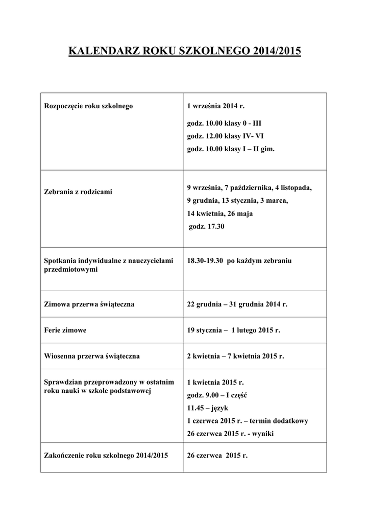 KALENDARZ ROKU SZKOLNEGO 2014/2015 Rozpoczęcie roku szkolnego 1 września 2014 r. godz. 10.00 klasy 0 - III godz. 12.00 klasy IV- VI godz. 10.00 klasy I – II gim. Zebrania z rodzicami 9 września, 7 października, 4 listopada, 9 grudnia, 13 stycznia, 3 marca, 14 kwietnia, 26 maja godz. 17.30 Spotkania indywidualne z nauczycielami przedmiotowymi 18.30-19.30 po każdym zebraniu Zimowa przerwa świąteczna 22 grudnia – 31 grudnia 2014 r. Ferie zimowe 19 stycznia – 1 lutego 2015 r. Wiosenna przerwa świąteczna 2 kwietnia – 7 kwietnia 2015 r. Sprawdzian przeprowadzony w ostatnim roku nauki w szkole podstawowej 1 kwietnia 2015 r. godz. 9.00 – I część 11.45 – język 1 czerwca 2015 r. – termin dodatkowy 26 czerwca 2015 r. - wyniki Zakończenie roku szkolnego 2014/2015 26 czerwca 2015 r.