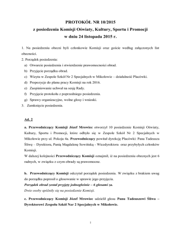 PROTOKÓŁ NR 10/2015 z posiedzenia Komisji Oświaty, Kultury, Sportu i Promocji w dniu 24 listopada 2015 r. 1. Na posiedzeniu obecni byli członkowie Komisji oraz goście według załączonych list obecności. 2. Porządek posiedzenia: a) Otwarcie posiedzenia i stwierdzenie prawomocności obrad. b) Przyjęcie porządku obrad. c) Wizyta w Zespole Szkół Nr 2 Specjalnych w Mikołowie – działalność Placówki. d) Propozycje do planu pracy Komisji na rok 2016. e) Zaopiniowanie uchwał na sesję Rady. f) Przyjęcie protokołu z poprzedniego posiedzenia. g) Sprawy organizacyjne, wolne głosy i wnioski. 3. Zamknięcie posiedzenia. Ad. 2 a. Przewodniczący Komisji Józef Mrowiec otworzył 10 posiedzenie Komisji Oświaty, Kultury, Sportu i Promocji, które odbyło się w Zespole Szkół Nr 2 Specjalnych w Mikołowie przy ul. Pokoju 4a. Przewodniczący powitał dyrekcję Placówki: Pana Tadeusza Śliwę – Dyrektora, Panią Magdalenę Sowińską - Wicedyrektora oraz przybyłych członków Komisji. W dalszej kolejności Przewodniczący Komisji oznajmił, iż na posiedzeniu obecnych jest 6 radnych, w związku z czym obrady są prawomocne. b. Przewodniczący Komisji odczytał porządek posiedzenia. W związku z brakiem uwag do porządku poprosił o głosowanie w sprawie jego przyjęcia. Porządek obrad został przyjęty jednogłośnie – 6 głosami za. Dwie osoby spóźniły się na posiedzenie Komisji. c. Przewodniczący Komisji Józef Mrowiec udzielił głosu Panu Tadeuszowi Śliwa – Dyrektorowi Zespołu Szkół Nar 2 Specjalnych w Mikołowie. 1 Pan Dyrektor Śliwa w pierwszej kolejności przedstawił krótką historię szkoły. Poinformował iż Szkoła Podstawowa Specjalna nr 2 w Mikołowie została powołana w 1972r. Zorganizowana została w wyniku potrzeb miasta i okolicy. W X rocznicę szkoły, czyli w roku 1982 Rada Pedagogiczna, młodzież i rodzice wybrali imię patrona szkoły. Została nim prof. Maria Grzegorzewska propagatorka kształcenia i wychowania dzieci niepełnosprawnych. Szkoła od powstania do roku 1991 mieściła się w budynku przy ul. Wyszyńskiego koło kościoła św. Wojciecha w Mikołowie. W wyniku złego stanu technicznego Szkoły od grudnia 1991 r. jej siedzibą został budynek Zgromadzenia Księży Salwatorianów przy pl. Salwatorianów 1 w Mikołowie. Od 1.01.1999 roku w związku z reformą administracji państwowej organem prowadzącym szkołę zostało Starostwo. W tym też roku zmieniono jej nazwę na Zespół Szkół Specjalnych w Mikołowie i wyodrębniono Szkołę Podstawową Nr 2 oraz Gimnazjum Nr 3. W roku 2007 Zespół poszerzono o Szkołę Przysposabiającą do pracy, a w 2009r. Zasadniczą Szkołę Zawodową Specjalną. W 2011 roku szkoła została przeniesiona do budynku przy ulicy Pokoju 4a. W związku z dużym zapotrzebowaniem w 2012 roku otwarto klasy dla uczniów z autyzmem. Zarówno w szkole podstawowej jak i w gimnazjum istnieją klasy, przeznaczone dla uczniów upośledzonych umysłowo w stopniu lekkim, umiarkowanym i znacznym oraz dla dzieci autystycznych i dzieci z zespołem Aspergera. Uczniowie ze zdiagnozowanym upośledzeniem umysłowym umiarkowanym i znacznym uczą się w zespołach edukacyjnoterapeutycznych. Nauczyciele prowadzą także nauczania indywidualne na terenie szkoły, Domu Pomocy Społecznej w Orzeszu, jak również w domach rodzinnych uczniów. W ramach nauczania indywidualnego prowadzone są zajęcia rewalidacyjno-wychowawcze z uczniami upośledzonymi umysłowo w stopniu głębokim. Do szkoły uczęszczają uczniowie z wszystkich gmin Powiatu oraz kilku uczniów z Katowic. Dojazd uczniów odbywa się zorganizowanym transportem. Aktualnie w Placówce uczy się 112 uczniów, w tym 57 w szkole podstawowej (w 12 oddziałach klasowych), 33 w gimnazjum (w 5 oddziałach klasowych), 22 w szkole przyspasabiającej do pracy (w 3 oddziałach). Obecnie nie funkcjonuje zawodowa szkoła specjalna, w związku ze zbyt małą liczbą absolwentów gimnazjum z niepełnosprawnością w stopniu lekkim, zainteresowanych tego typu kształceniem. Liczebność uczniów zależy od stopnia upośledzenia uczniów, rodzaju posiadanych dysfunkcji, problemów uczniów z komunikacją społeczną. Praca z uczniem odbywa się w oparciu o Indywidualny Program EdukacyjnoTerapeutyczny (IPET) opracowany dla każdego dziecka na podstawie diagnozy i oceny 2 aktualnego poziomu psychofizycznego. Jest on opracowany przez nauczycieli w uzgodnieniu z rodzicami na podstawie orzeczenia do kształcenia specjalnego i realizowany w ramach zajęć edukacyjnych i rewalidacyjnych. Pan Tadeusz Śliwa poinformował, iż w Zespole Szkół pracuje wysoko wykwalifikowana kadra pedagogiczna. Nauczyciele posiadają odpowiednie wykształcenie do pracy z dziećmi i młodzieżą niepełnosprawną intelektualnie jak i wieloletnie doświadczenie. Łącznie w Placówce zatrudnionych jest 46 nauczycieli Wśród nich 32 to nauczyciele dyplomowani, 8 mianowani, 4 kontraktowi oraz 2 stażystów. Oprócz typowych zajęć lekcyjnych szkoła zapewnia: uczestnictwo w różnych kołach zainteresowań, zajęcia pozalekcyjne w świetlicy szkolnej, zajęcia rewalidacyjne, logopedyczne, sportowe, zajęcia socjoterapii i psychoterapii, terapię ruchową, gimnastykę korekcyjną, zajęcia terapeutyczne: muzykoterapia, dogoterapia, hipoterapia, terapia integracji sensorycznej, EEG Biofeedback, uczestnictwo w różnego rodzaju konkursach, zabawach, przedstawieniach, rajdy, wycieczki, białe i zielone szkoły. Szkoła jest wyposażona w dwie mobilne pracownie komputerowe, tablice multimedialne, plac zabaw, sale do terapii, świetlicę i bibliotekę. Placówka bierze udział w realizacji wiele programów i projektów. Są to m.in. Commenius „Nowy bukiet kwiatów. Tradycje – ogniowo łączące różnorodności krajów europejskich”, EFS „Mały człowiek w wielkim świecie”, Kompleksowa Edukacja Specjalna- Program Rozwoju Szkół Specjalnych Powiatu Mikołowskiego, Cyfrowa Szkoła, Pij mleko, Owo