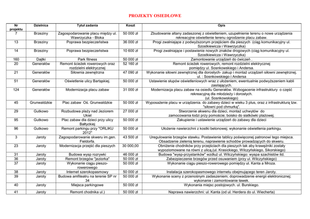PROJEKTY OSIEDLOWE Nr projektu Dzielnica Tytuł zadania Koszt Opis 7 Brzeziny 50 000 zł 13 Brzeziny Zagospodarowanie placu między ul. Wawrzyczka - Bloka Poprawa bezpieczeństwa 14 Brzeziny Poprawa bezpieczeństwa 10 600 zł 160 20 Dajtki Generałów 50 000 zł 52 160 zł 21 Generałów Park fitness Remont ścieżek rowerowych oraz rozdzielni elektrycznej Siłownia zewnętrzna 51 Generałów Oświetlenie ulicy Bartąskiej. 50 000 zł 124 Generałów Modernizacja placu zabaw 31 000 zł 45 Grunwaldzkie Plac zabaw Oś. Grunwaldzkie 50 000 zł 29 Gutkowo 27 000 zł 95 Gutkowo 50 000 zł 96 Gutkowo 50 000 zł Ułożenie nawierzchni z kostki betonowej; wykonanie oświetlenia parkingu. 3 Jaroty 43 500 zł 23 Jaroty Rozbudowa plaży nad Jeziorem Ukiel Plac zabaw dla dzieci przy ulicy Bałtyckiej Remont parkingu przy "ORLIKU 2012" Zagospodarowanie skweru im.gen. Fieldorfa. Modernizacja przejść dla pieszych Zbudowanie altany zadaszonej z oświetleniem, uzupełnienie terenu o nowe urządzenia rekreacyjne oświetlenie terenu ogrodzenie placu zabaw. Progi zwalniające z podwyższonym przejściem dla pieszych (ciąg komunikacyjny ul. Szostkiewicza i Wawrzyczka) Progi zwalniające i postawienie nowych znaków drogowych (ciąg komunikacyjny ul. Szostkiewicza i Wawrzyczka) Zamontowanie urządzeń do ćwiczeń . Remont ścieżek rowerowych, remont rozdzielni elektrycznej pomiędzy ul. Sosnkowskiego i Andersa. Wykonanie siłowni zewnętrznej dla dorosłych- zakup i montaż urządzeń siłowni zewnętrznej. ul. : Sosnkowskiego i Andersa Ustawienie słupów oświetleniowych wraz z ułożeniem, ewentualnie podwyższeniem kabli zasilających. Modernizacja placu zabaw na osiedlu Generałów. Wzbogacenie infrastruktury o część rekreacyjną dla młodzieży i dorosłych. (ul. Sosnkowskiego) Wyposażenie placu w urządzenia. do zabawy dzieci w wieku 3 plus, oraz z infrastrukturą tzw. "siłowni pod chmurką". Stworzenie akwenu dla dzieci, montaż uchwytów do zamocowania łodzi przy pomoście; boisko do siatkówki plażowej. Zakupienie i ustawienie urządzeń do zabawy dla dzieci 31 36 37 Jaroty Jaroty Jaroty Uregulowanie brzegów stawku. Postawienie tablicy poświęconej patronowi tego miejsca. Obsadzenie zielenią terenu, naprawienie schodów prowadzących do skweru. Obniżenie chodników przy przejściach dla pieszych tak aby krawężniki zostały wypoziomowane na równi z ulicą.(ul. Krasickiego, Wilczyńskiego, Sikorskiego) Budowa "wysp-przystanków" wzdłuż ul. Wilczyńskiego: wyspa szachistów itd. Zabezpieczenie brzegów przed osuwaniem (przy ul. Wilczyńskiego) Wykonanie ciągu pieszo-rowerowego pomiędzy ul. Kanta a Mroza. 38 39 Jaroty Jaroty 40 41 36 000 zł 47 090 zł 30 000,00 46 000 zł 50 000 zł 50 000 zł Jaroty Budowa wysp rozrywki Remont brzegów "jeziorka" Wykonanie ciągu pieszorowerowego Internet szerokopasmowy Budowa amfiteatru na terenie SP nr 34 Miejsca parkingowe 50 000 zł Instalacja szerokopasmowego internetu obejmującego teren Jaroty. Wykonanie sceny z przenośnym zadaszeniem; doprowadzenie energii elektronicznej; wykonanie i zamontowanie ławek. Wykonania miejsc postojowych. ul. Burskiego. Jaroty Remont chodnika ul.) 50 000 zł Naprawa nawierzchni: ul. Kanta (od ul. Herdera do ul. Wiecherta) 50 000 zł 50 000 zł 42 Jaroty Siłownia "Pod chmurką" przy SP 34 10 Kętrzyńskiego Kanalizacja deszczowa 139 Kętrzyńskiego 89 Kormoran 134 Kormoran 107 Kormoran 129 Kormoran 130 Kormoran 131 Kormoran 11 Kortowo 128 Kortowo 16 30 Kościuszki Likusy 63 Likusy 64 Likusy 65 Likusy 66 Likusy 67 Likusy 68 70 74 76 Likusy Likusy Likusy Likusy Zagospodarowaniem podwórka na osiedlu Remont chodnika na ul. Parkingowej Osiedlowy plac zabaw przy ulicy Dworcowej Remont chodnika Remont chodnika na ul. Parkingowej Nowego chodnik na ul. Parkingowej Remont chodnika na ul. Parkingowej Odprowadzenie wody deszczowej 35 000 zł 50 000 zł 50 000 zł Wykonanie kanalizacji deszczowej (Kościuszki 8;10;12;14;14A oraz Kętrzyńskiego 1A i 1B) 50 000,00 Ograniczenie parkowania na podwórku łącznie z terenami zielonymi i chodnikami, ochrona terenów zielonych. Remont generalny chodnika jako dokończenie remontu ulicy Prakingowej od budynku na ul. Wyszyńskiego 2 do 18. Budowa placu zabaw na działce nr 104-43/2 znajdującej się w środku osiedla. Montaż wyposażenia do zabawy. Remont generalny chodnika (ul. Parkingowa)- dokończenie prac. Remont generalny chodnika, jako dokończenie remontu ulicy Parkingowej, rozpoczętego w 2011 roku. Dokończenie drugiego etapu budowy chodnika. 50 000,00 Dokończenie remontu generalnego chodnika. 50 000 zł Odprowadzenie wody deszczowej ze zbiegu ul. Gwiezdnej i ul. Zodiakowej w Kierunku cieku wodnego przy ulicy Słonecznej. Wymiana nawierzchni drogi i ułożenie kostki na drodze i chodnikach z wymianą krawężnika. 50 000,00 49 600,00 50 000,00 50 000,00 Dokończenie remontu ulicy Tęczowej II etap Miasto Olsztyn- miasto ogrodów. Budowa plaży nad Jeziorem Ukiel. 45973,06 Boisko osiedlowe przy ul. Bałtyckiej 45 Plac zabaw przy ul. Bałtyckiej 45 50 000 zł Konserwacja budynku przy ul. Bałtyckiej 67 i terenu wzdłuż budynku Odnowienie elewacji budynku przy ul. Bałtyckiej 67 Plac zabaw dla dzieci nad jeziorem Sukiel przy ul. Bałtyckiej 45 Plac zabaw dla dzieci. Chodnik w stronę sklepu Rast. Plac zabaw dla dzieci przy ul. Bałtyckiej Wykonanie chodnika na ul. Kajakowej Rozbudowa parkingu przy kościele przy ul. Bałtyckiej Zakup i montaż elementów siłowni zewnętrznej na boisku przy SP 34 w Olsztynie ul. Herdera 3. 50 000 zł 50 000zł Nasadzenie drzew na terenie Rady Osiedla Kościuszki. Wybudowanie drewnianego pomostu, wyznaczenie akwenu dla dzieci ze zjeżdżalnią w wodzie, oraz wytyczenie miejsca kąpieli przez boje. Modernizacja części lądowej. Zorganizowanie boiska do piłki siatkowej plażowej. Naprawić boisko do piłki nożnej 50 000,00 Zorganizowanie boiska do piłki siatkowej. Naprawienie boiska do piłki nożnej. Ustawienie urządzeń do zabawy dl
