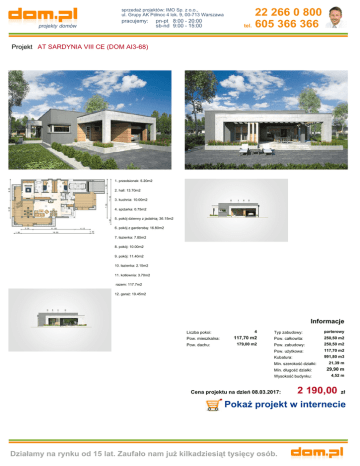sprzedaż projektów: IMO Sp. z o.o., ul. Grupy AK Północ 4 lok. 9, 00-713 Warszawa pracujemy: pn-pt 8:00 - 20:00 sb-nd 9:00 - 15:00 22 266 0 800 tel. 605 366 366 Projekt AT SARDYNIA VIII CE (DOM AI3-68) 1. przedsionek: 5.20m2 2. hall: 13.70m2 3. kuchnia: 10.00m2 4. spiżarka: 0.75m2 5. pokój dzienny z jadalnią: 36.15m2 6. pokój z garderobą: 16.80m2 7. łazienka: 7.85m2 8. pokój: 10.00m2 9. pokój: 11.40m2 10. łazienka: 2.15m2 11. kotłownia: 3.70m2 razem: 117.7m2 12. garaż: 19.45m2 Informacje Liczba pokoi: Pow. mieszkalna: Pow. dachu: 4 Typ zabudowy: parterowy 117,70 m2 Pow. całkowita: 250,50 m2 Pow. zabudowy: 250,50 m2 Pow. użytkowa: 117,70 m2 Kubatura: 991,80 m3 179,00 m2 Min. szerokość działki: 21,39 m Min. długość działki: 29,90 m Wysokość budynku: 4,52 m Cena projektu na dzień 08.03.2017: 2 190,00 zł Pokaż projekt w internecie Działamy na rynku od 15 lat. Zaufało nam już kilkadziesiąt tysięcy osób.